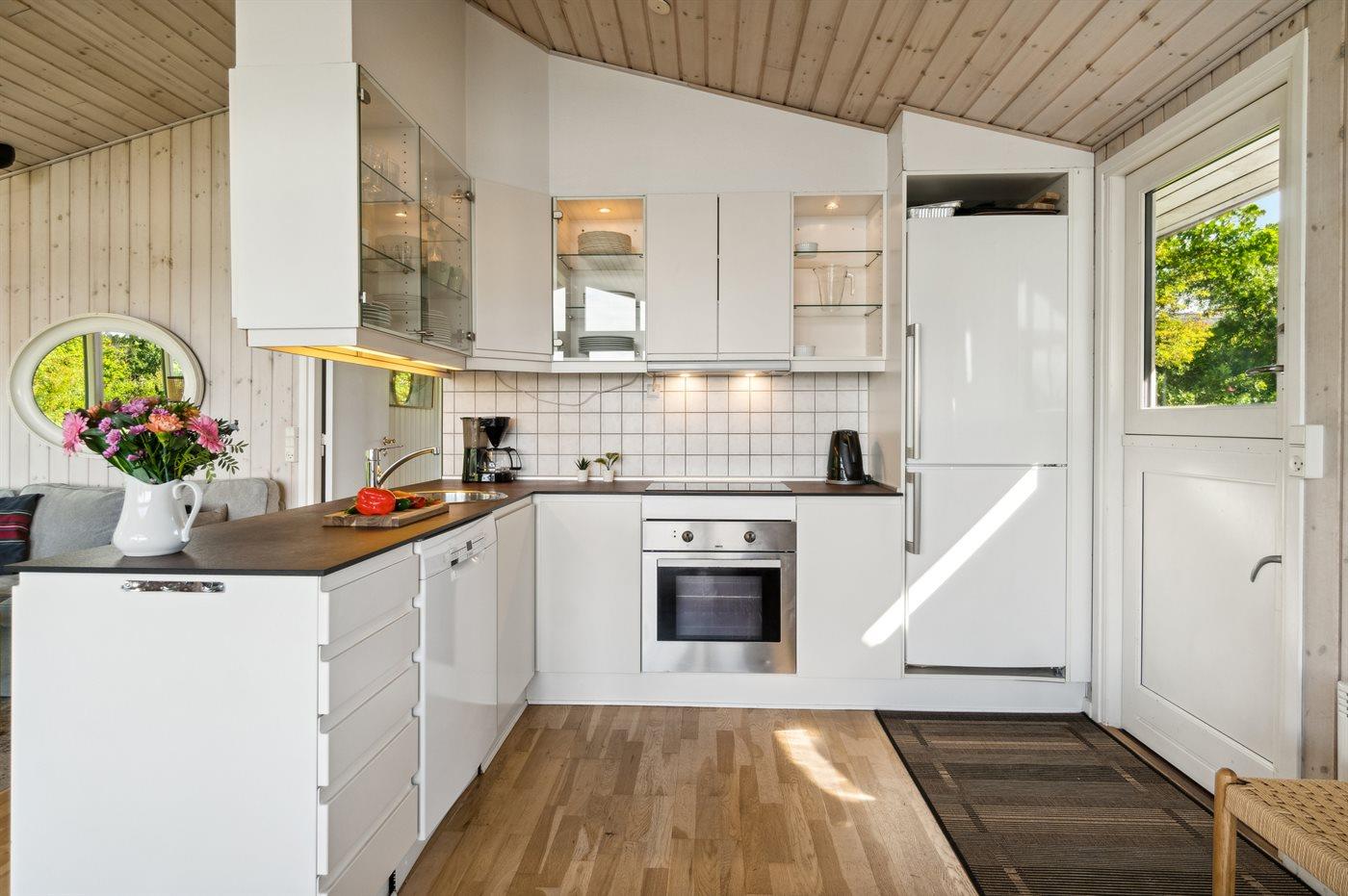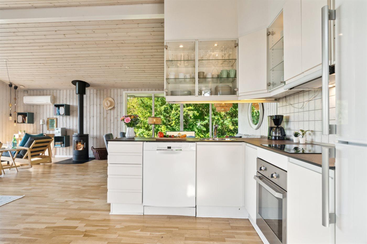Køkkenet er udstyret med 1 køleskab. Der er 4 keramiske kogeplader, varmluftovn samt opvaskemaskine.