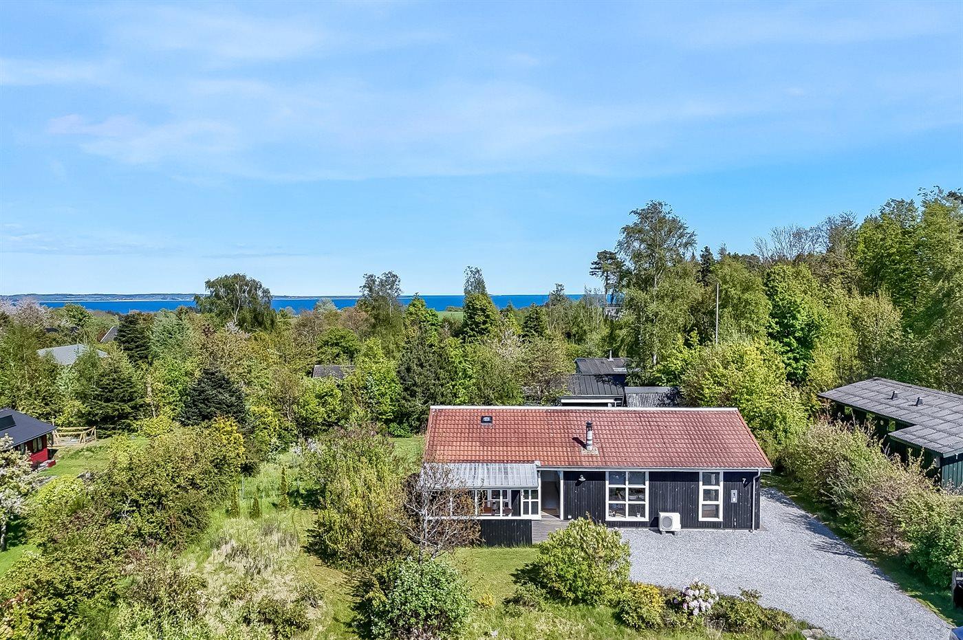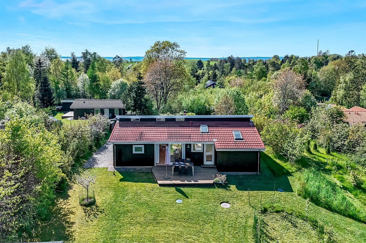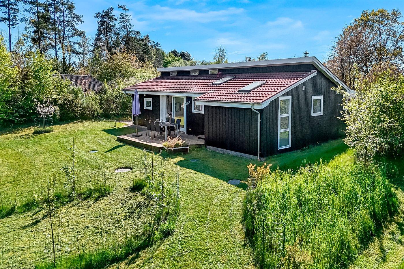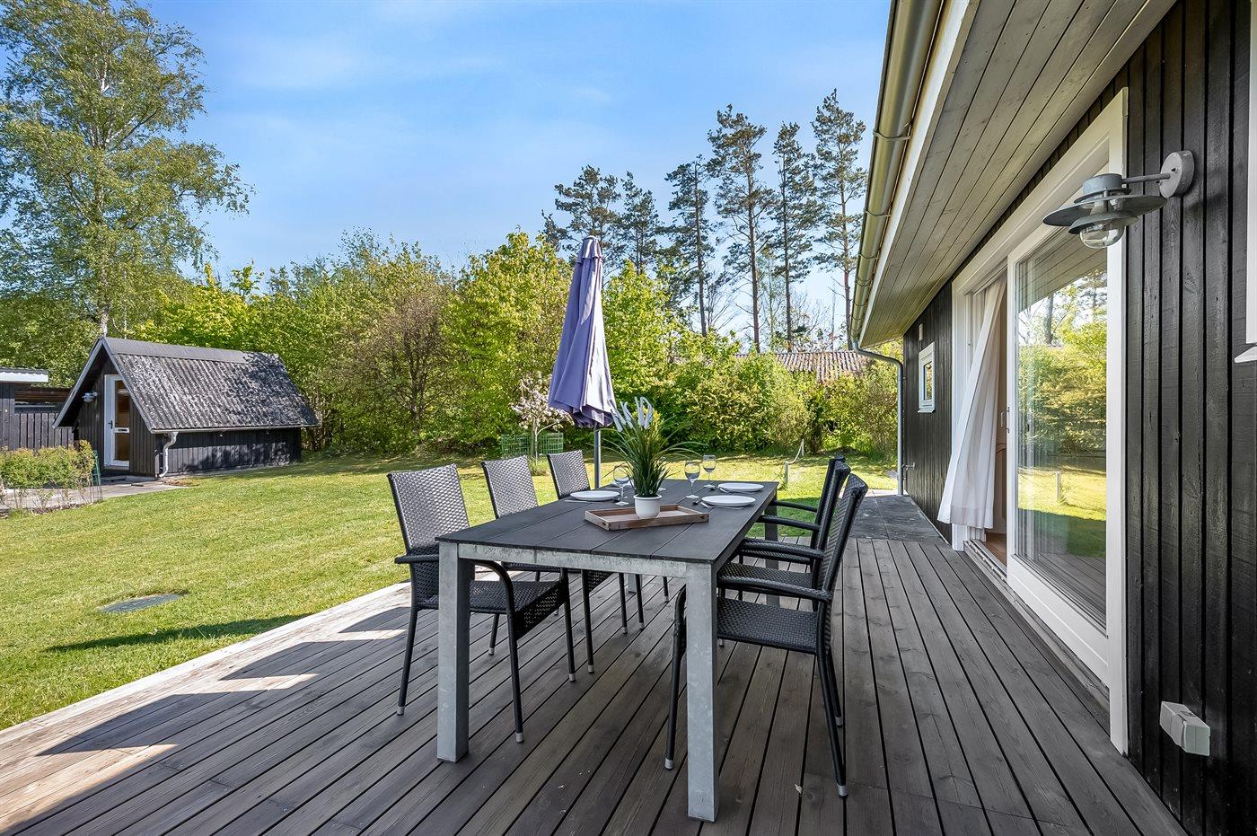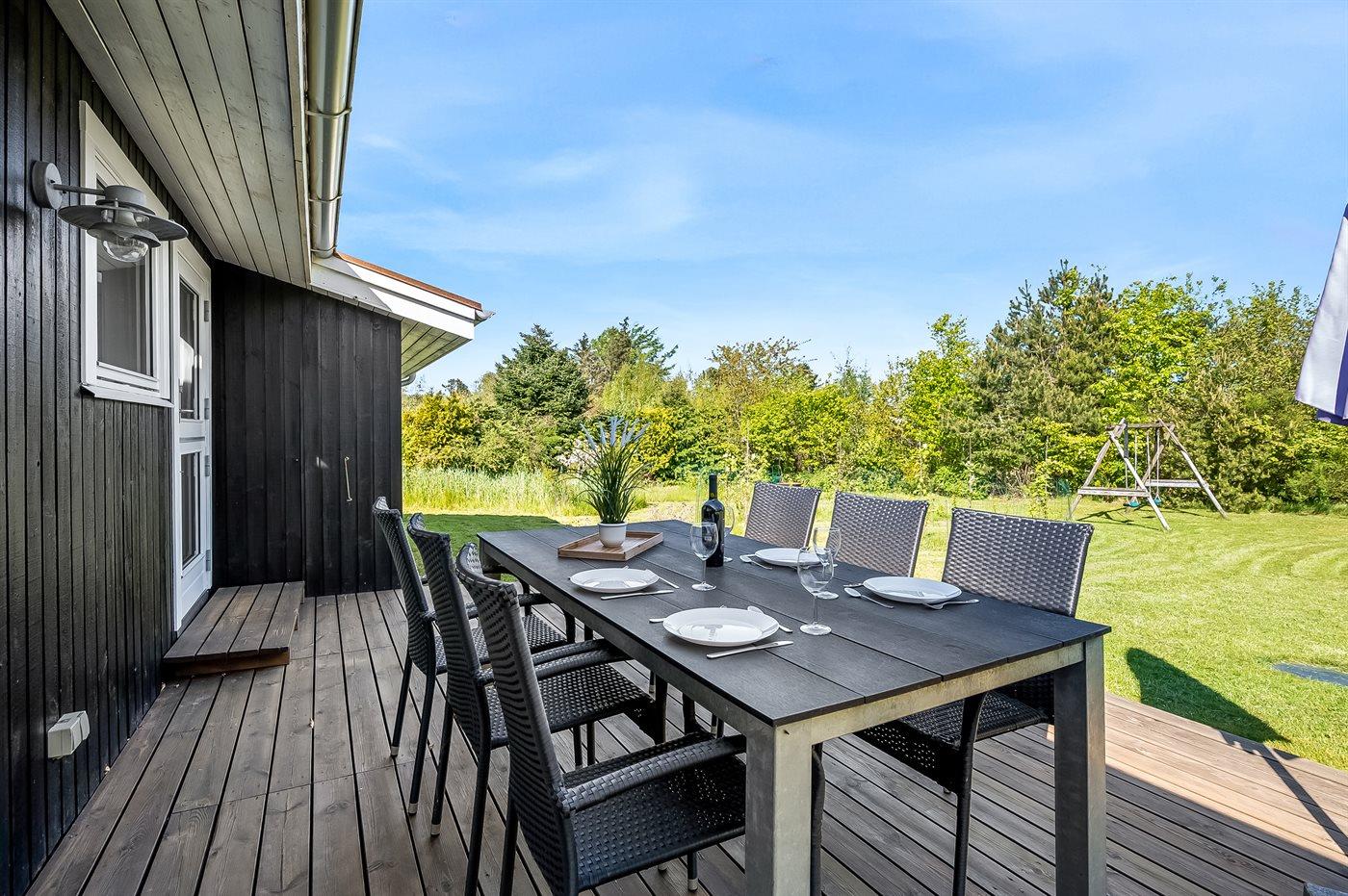 Terrassen bag huset er meget stor, og her kan alle sidde og nyde freden og roen mens børnene leger i haven eller på gyngerne. Området er spækket af natur og fra udgangspunktet midt på Helgenæs har man Nationalpark Mols Bjerge lige udenfor døren.
