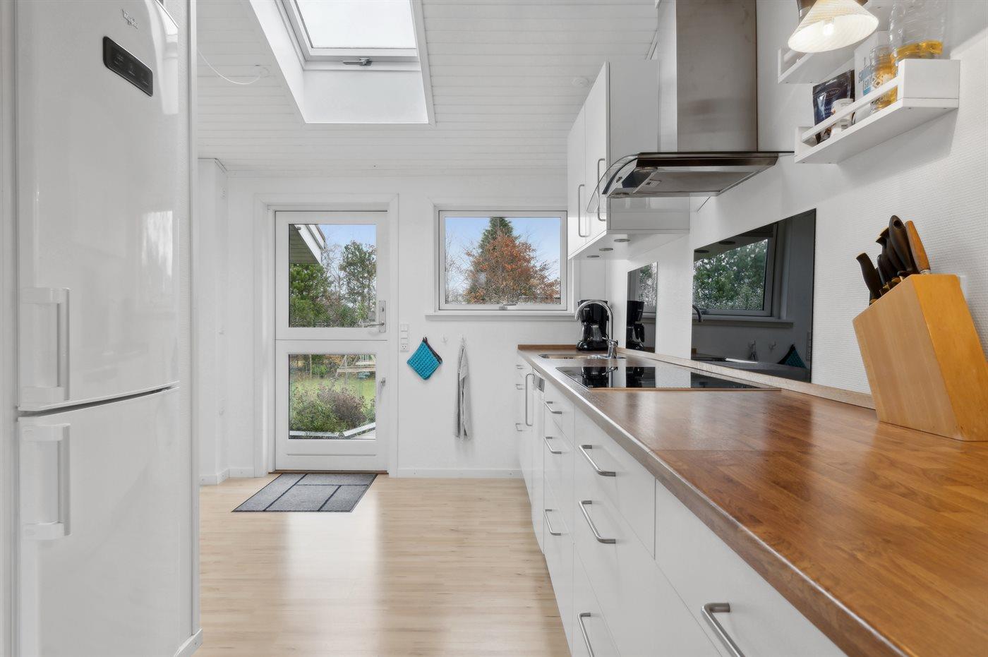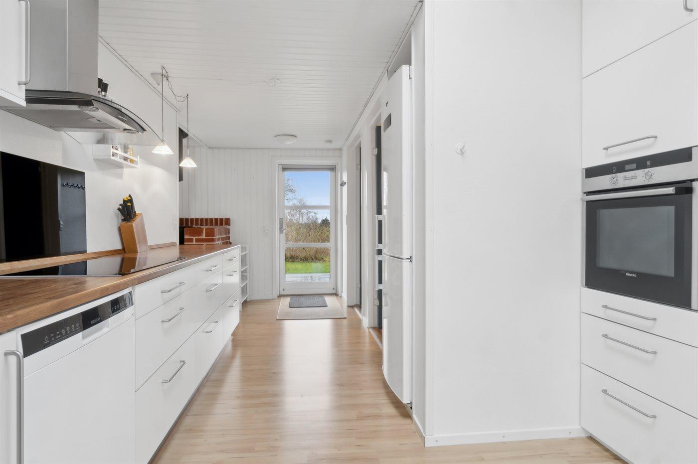 Køkkenet er udstyret med 1 køleskab. Der er 4 induktionskogeplader, varmluftovn, mikrobølgeovn samt opvaskemaskine.
