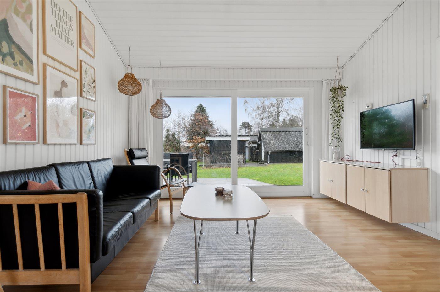 Huset på 102 kvadratmeter, ligger på en stor og privat naturgrund med hyggelig rekreative områder og dejlige terrassearealer.
