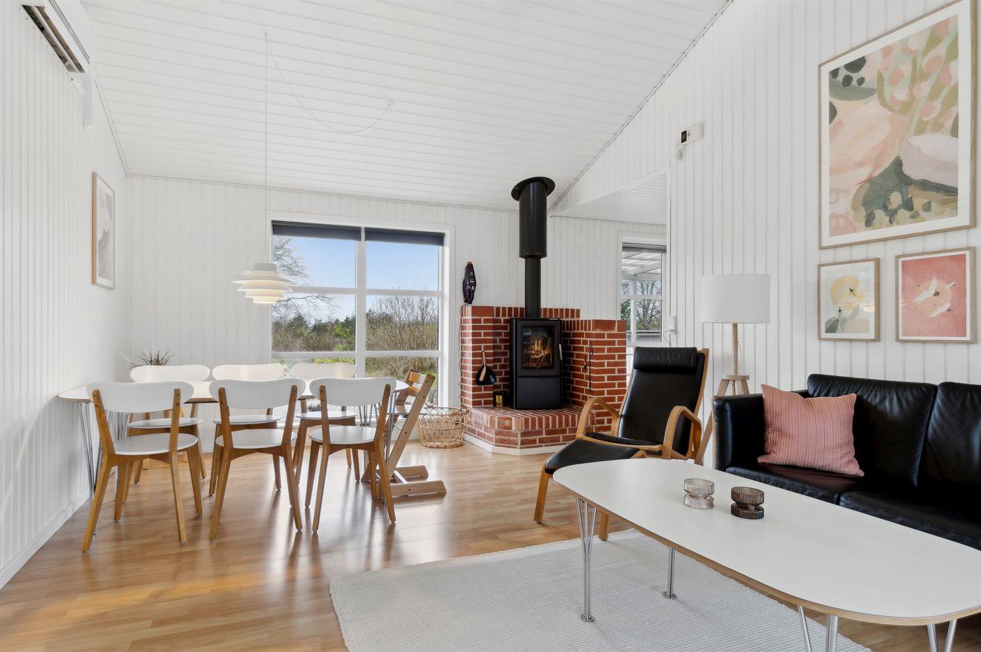 Indenfor bydes man ind til et nyere køkken og en skøn stue med brændeovn og udsigt til den smukke natur. Huset har 3 gode værelser, godt fordelt i huset. Her er desuden også 2 badeværelser så man ikke behøver at dele med andre end sine nærmeste.