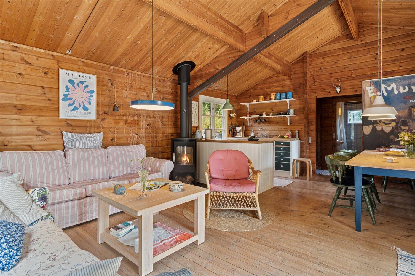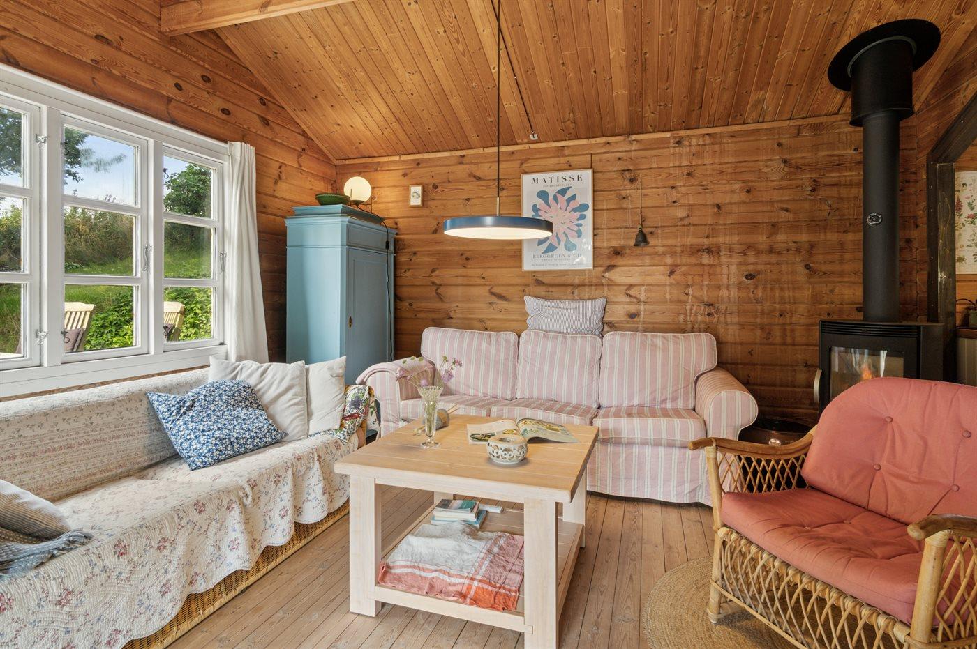 Hyggeligt træsommerhus på Helgenæs med natur, brændeovn og hund tilladt.