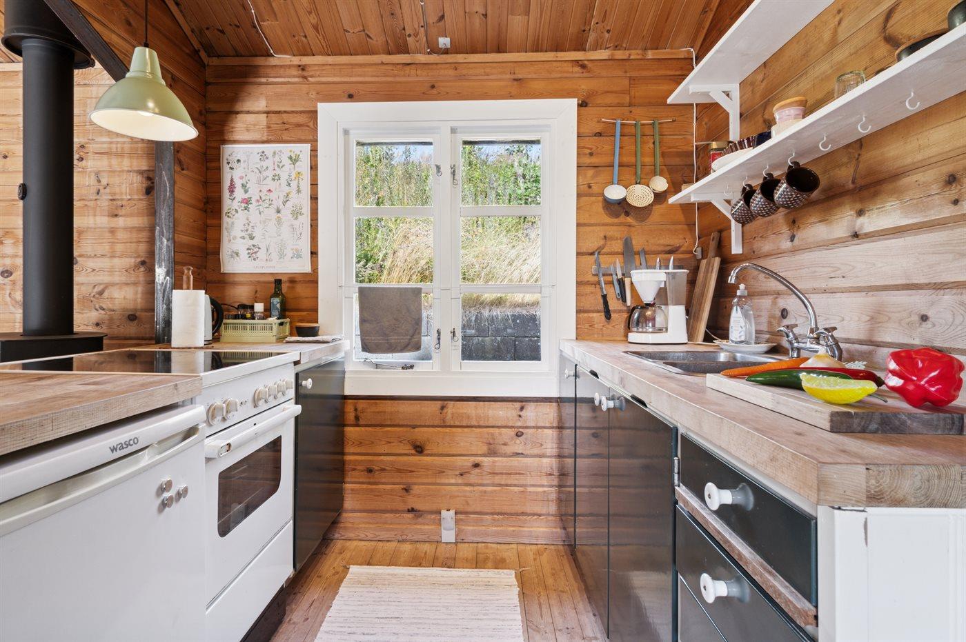 Køkkenet er udstyret med 1 køleskab. Der er 4 keramiske kogeplader, varmluftovn, mikrobølgeovn.