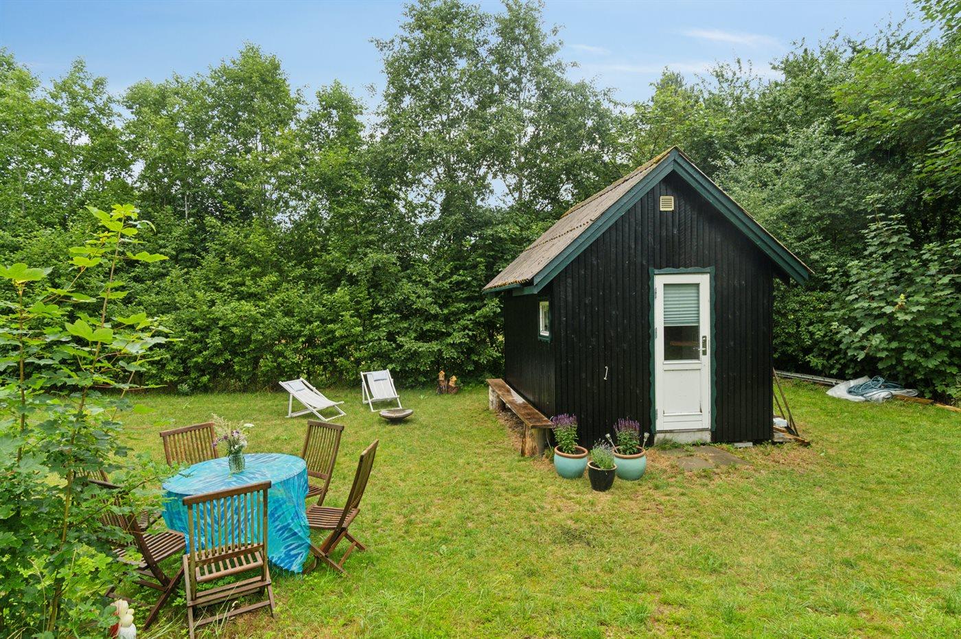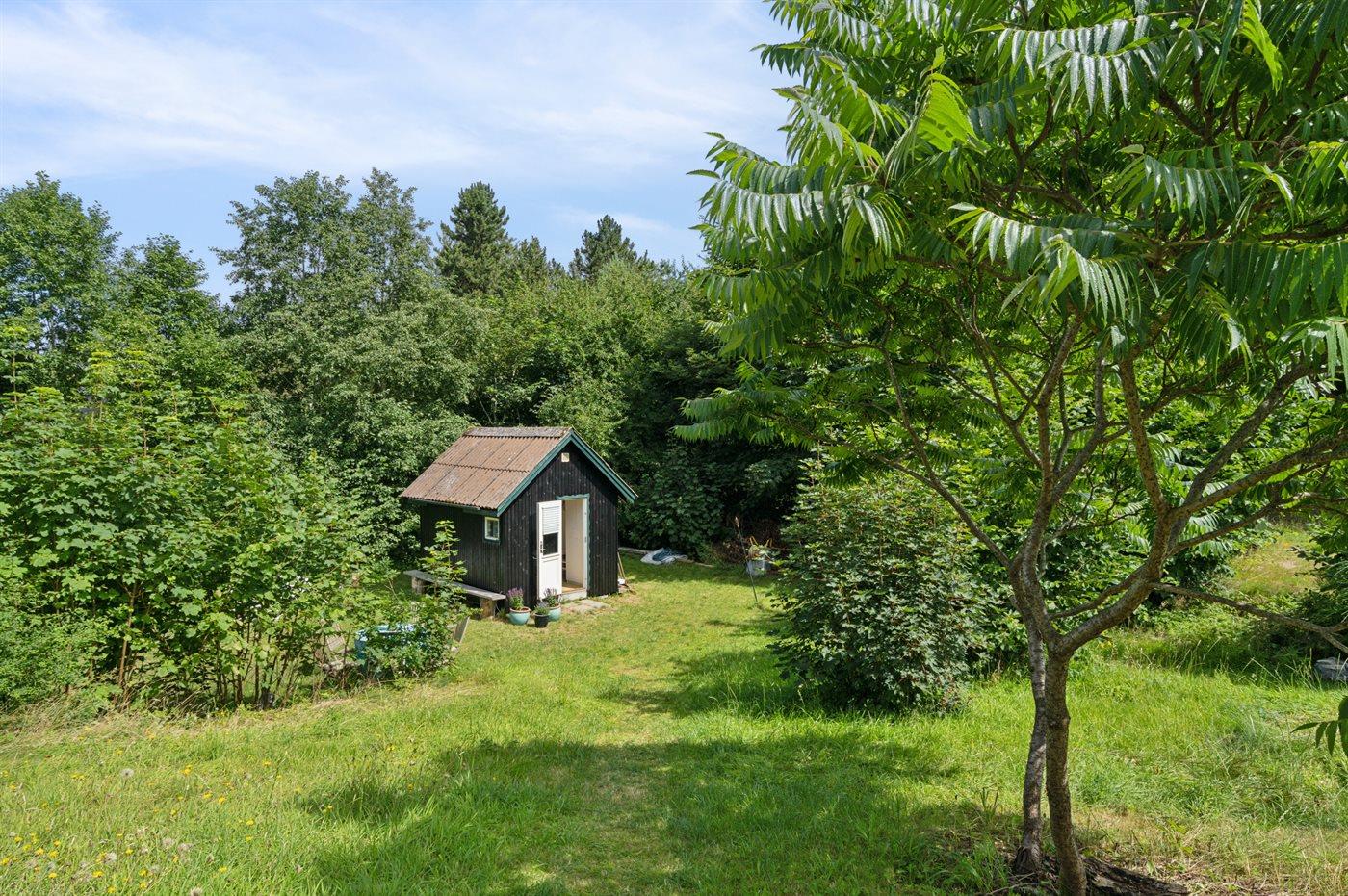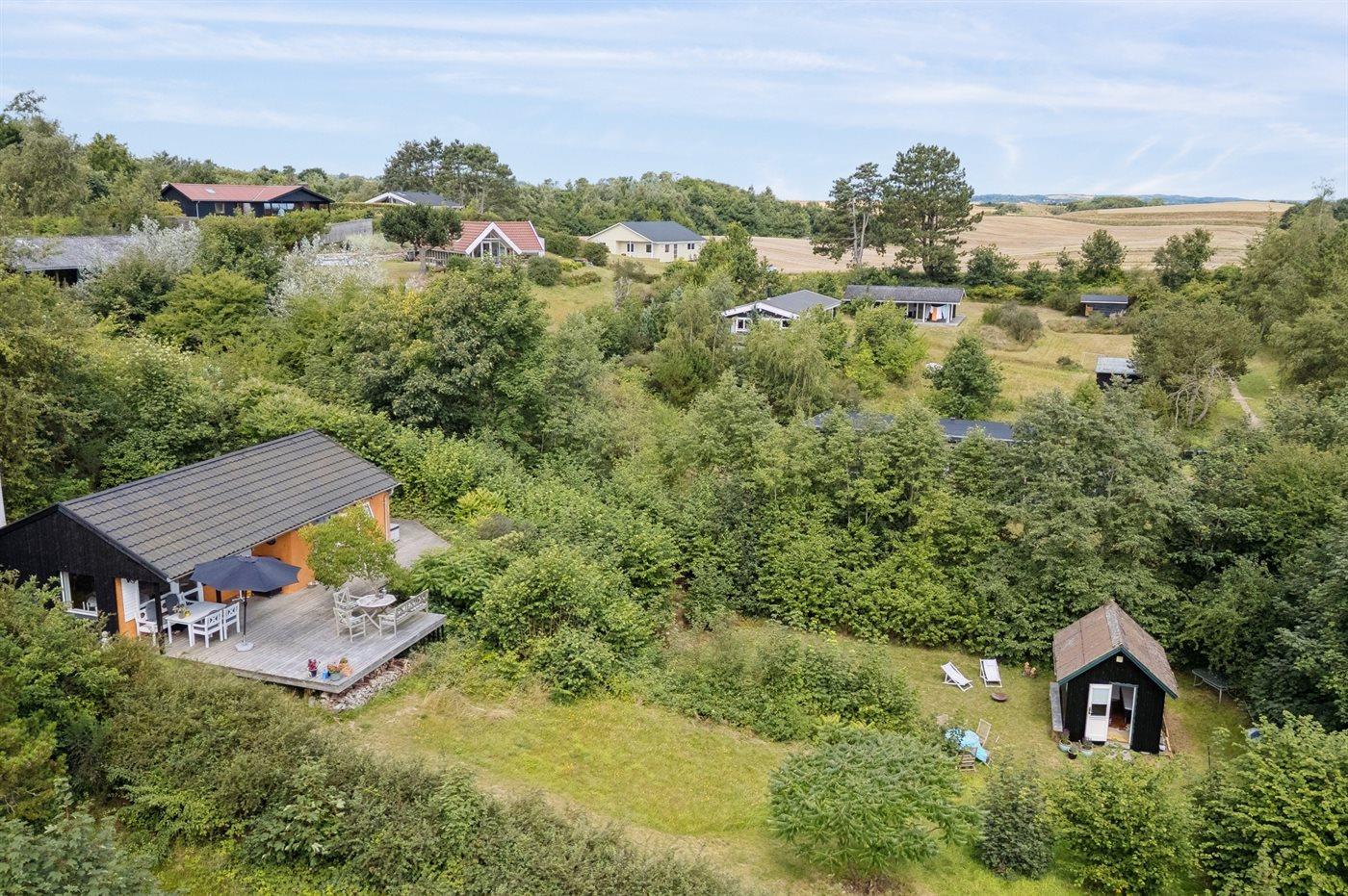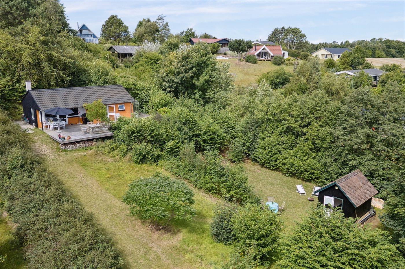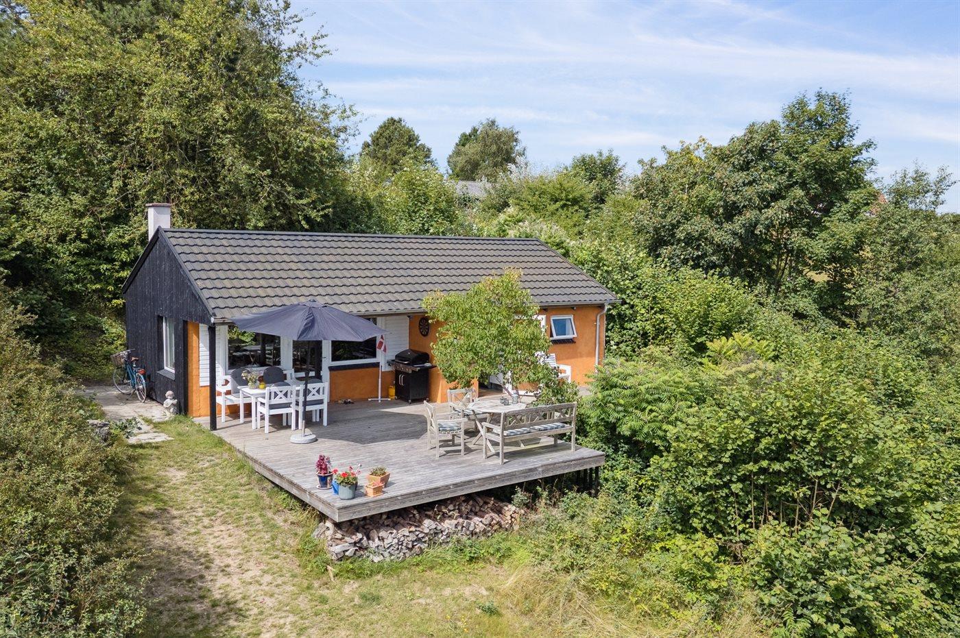 Hyggeligt sommerhus i naturskønne omgivelser på Helgenæs med bålsted, terrasse og tæt på havet.