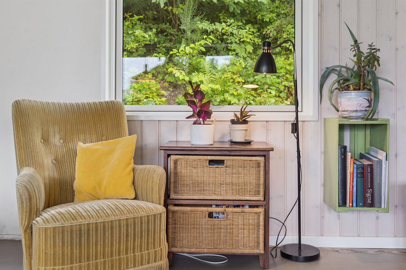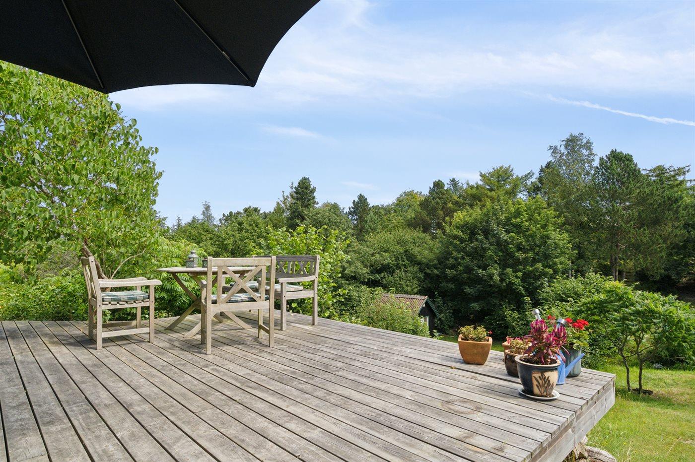 Ferieboligen er beliggende på en 1300 m² stor naturgrund. Der er 800 m til havet. Der er en badebro i nærheden. Nærmeste forretning er beliggende i en afstand af 3000 m. Til ferieboligen hører åbent terrasseareal. Desuden er der overdækket terrasse. Bålsted. Grill til rådighed. Parkering ved ferieboligen.