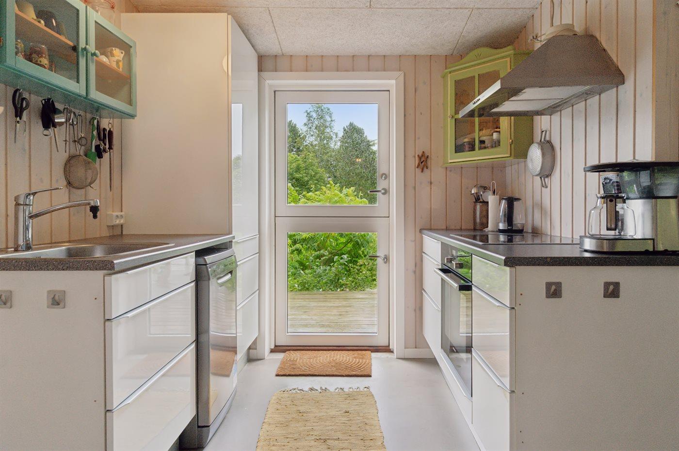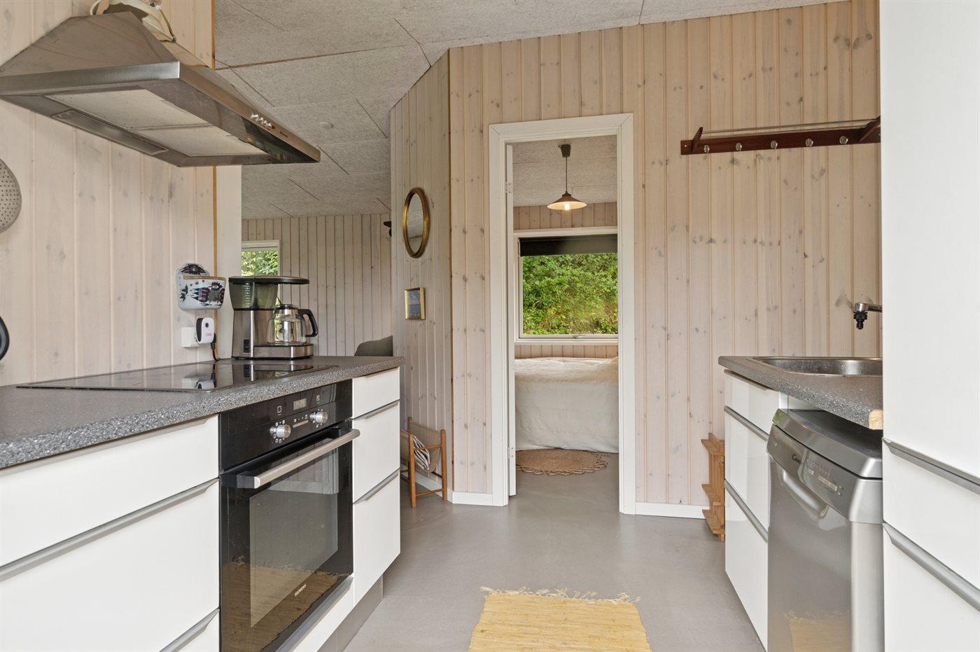 Køkkenet er udstyret med 1 køleskab. Der er 4 keramiske kogeplader, varmluftovn samt opvaskemaskine.