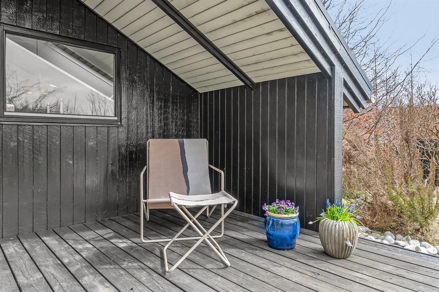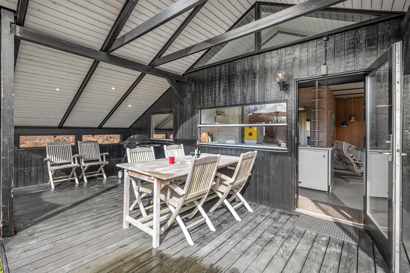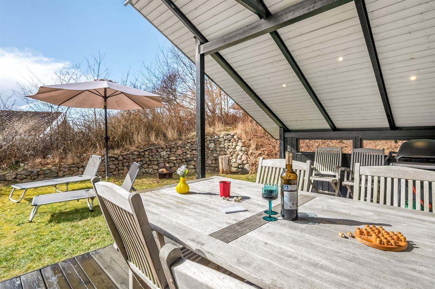 Ved huset finder I en hyggelig terrasse med overdække, hvor I kan sidde godt i læ og nyde udelivet i fredelige rammer. Her er der plads til rolige morgener med kaffe og lange sommeraftener med familien samlet omkring bordet.