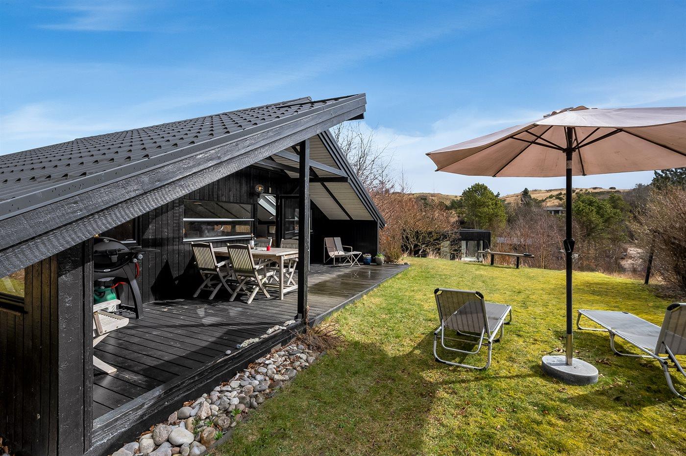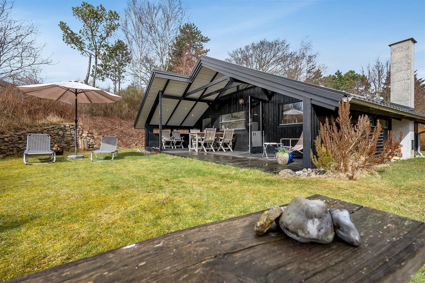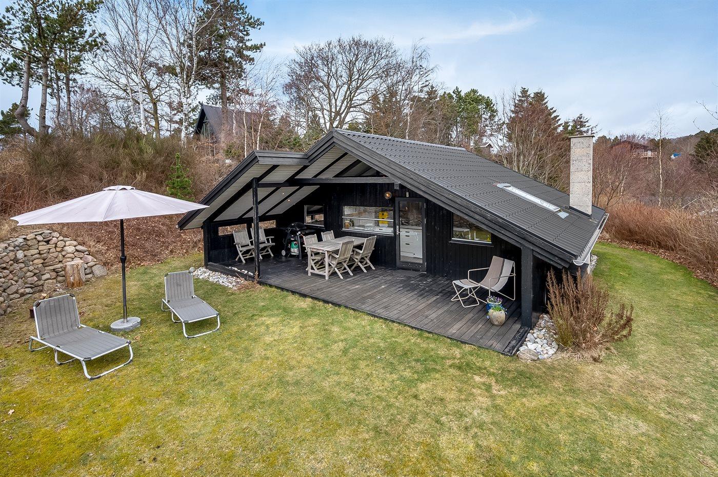 Ferieboligen er beliggende på en 1226 m² stor naturgrund. Der er 550 m til havet. Nærmeste forretning er beliggende i en afstand af 3500 m. Til ferieboligen hører åbent terrasseareal. Desuden er der overdækket terrasse. Bålsted. Udendørs bruser. Grill til rådighed. Parkering ved ferieboligen.