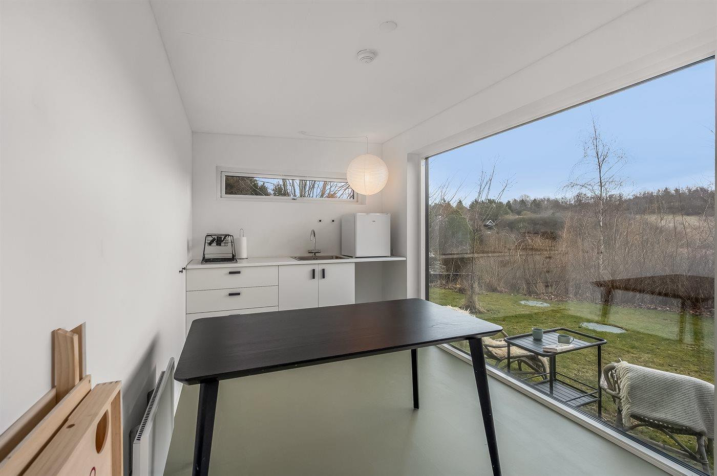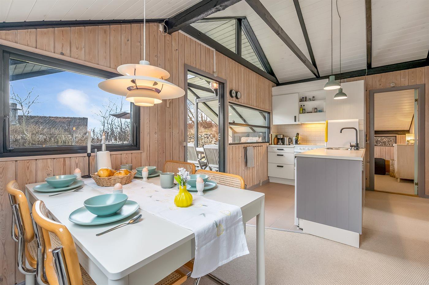 Køkkenet er udstyret med 1 køleskab. Der er 4 keramiske kogeplader, varmluftovn samt opvaskemaskine (bordmodel).