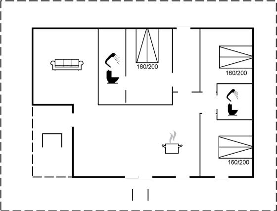 Sommerhuset rummer tre gode soveværelser samt to badeværelser, hvilket gør huset velegnet til flere familier eller venner, der rejser sammen. Planløsningen er enkel og funktionel med entré, værelser og bad samlet omkring husets centrale opholdsrum.