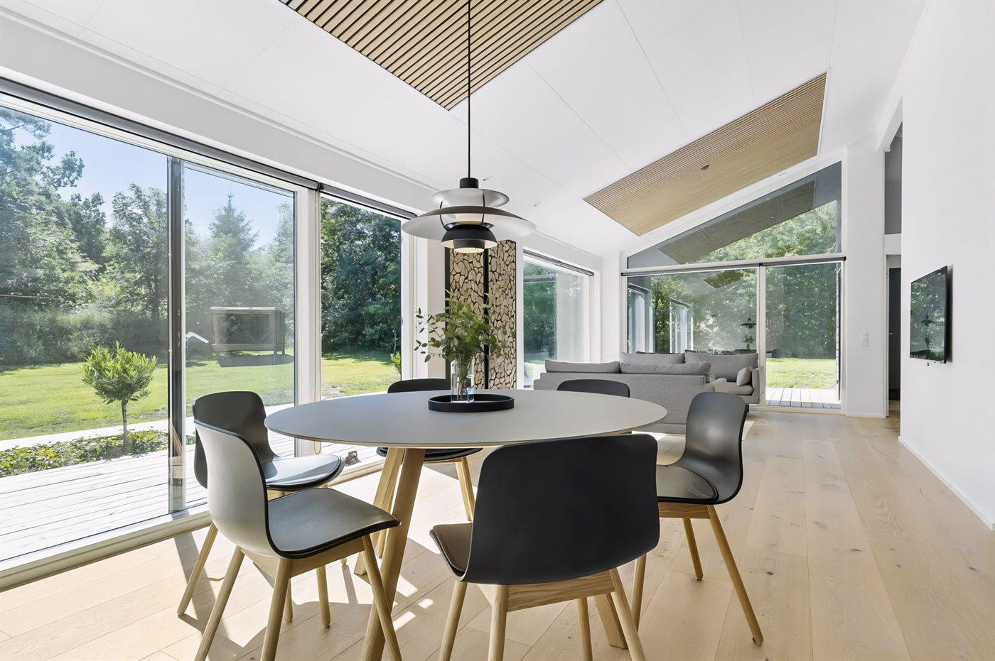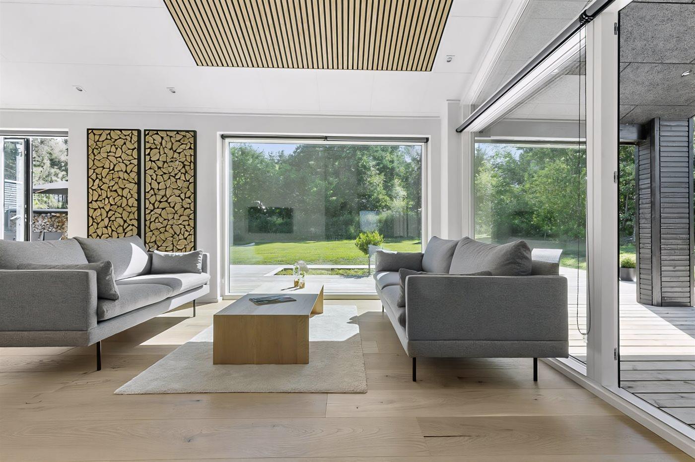 Fra opholdsrummet er der adgang til den rummelige terrasse, hvor feriedagene naturligt fortsætter udendørs. Her kan morgenkaffen nydes i stilheden, mens udsigten strækker sig over landskabet og videre mod havet i Aarhus Bugt.
