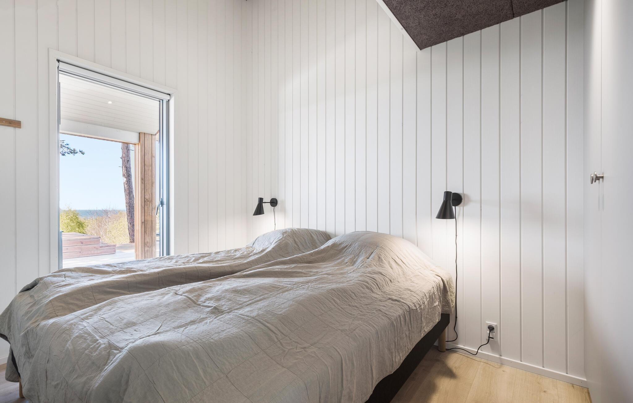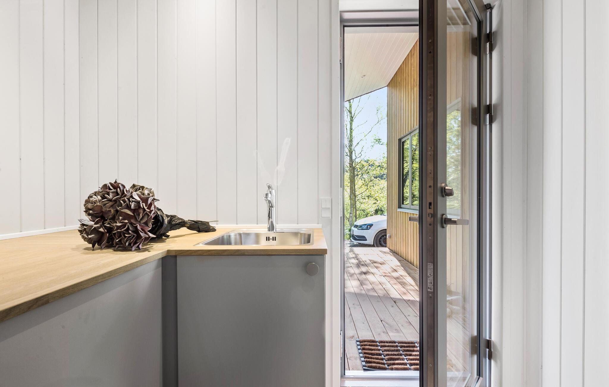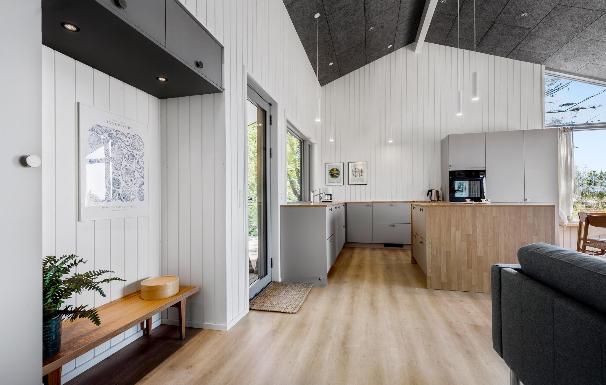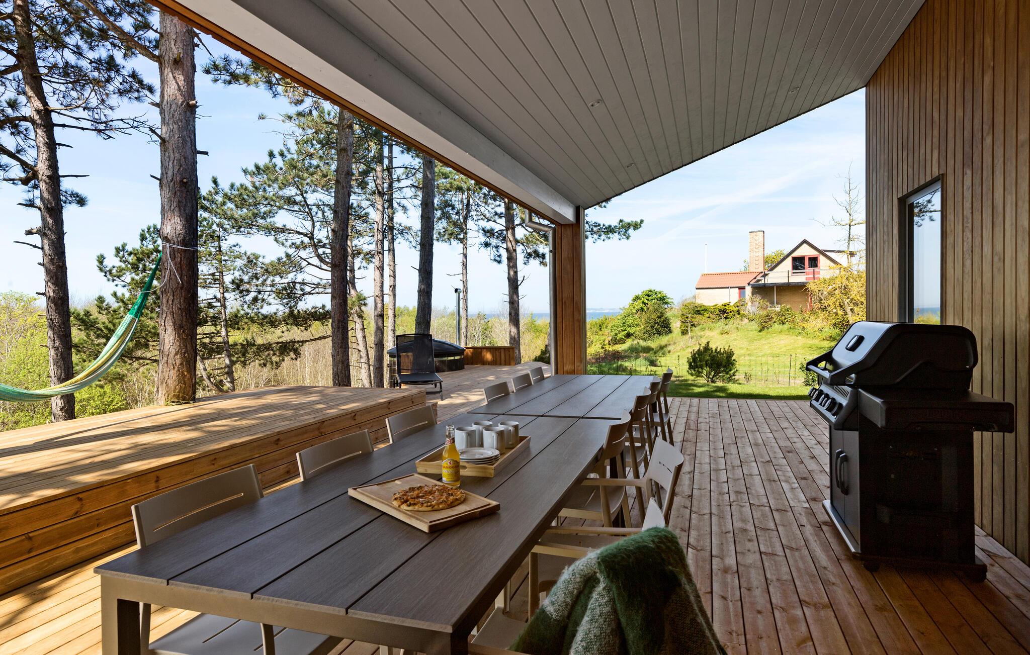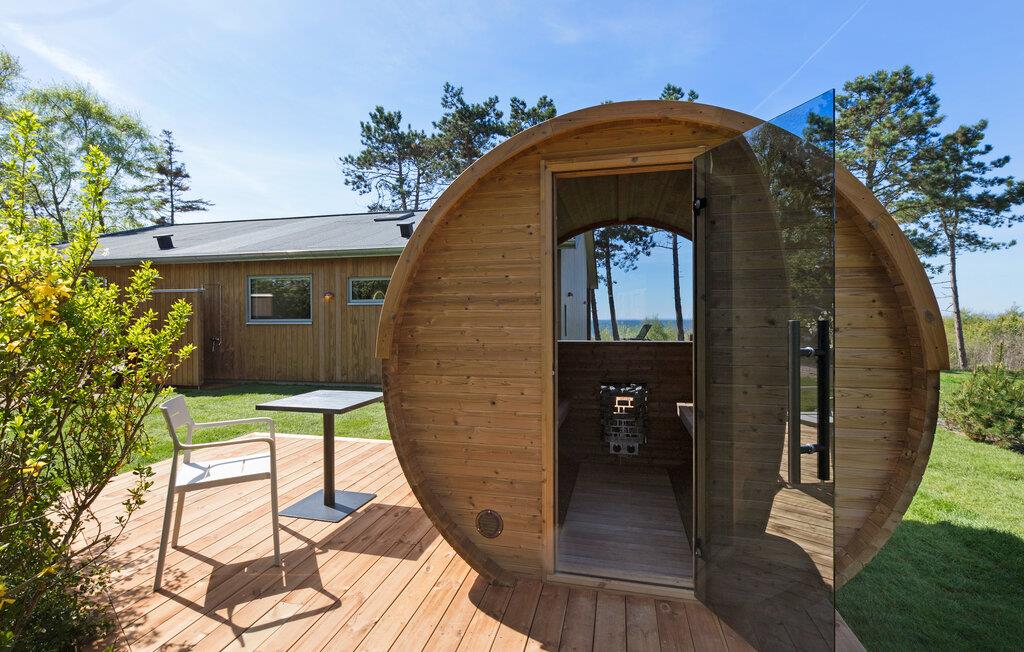 Træd ud på den omgivende træterrasse og lad blikket vandre over bugten. Spis morgenmad under åben himmel, slap af i hængekøjen eller nyd en rolig stund i vildmarksbadet. Brug den udendørs sauna med havudsigt til afslappende timer. Nyd lune aftener på loungemøblerne eller mens I griller på den overdækkede del af terrassen med det store spisebord.