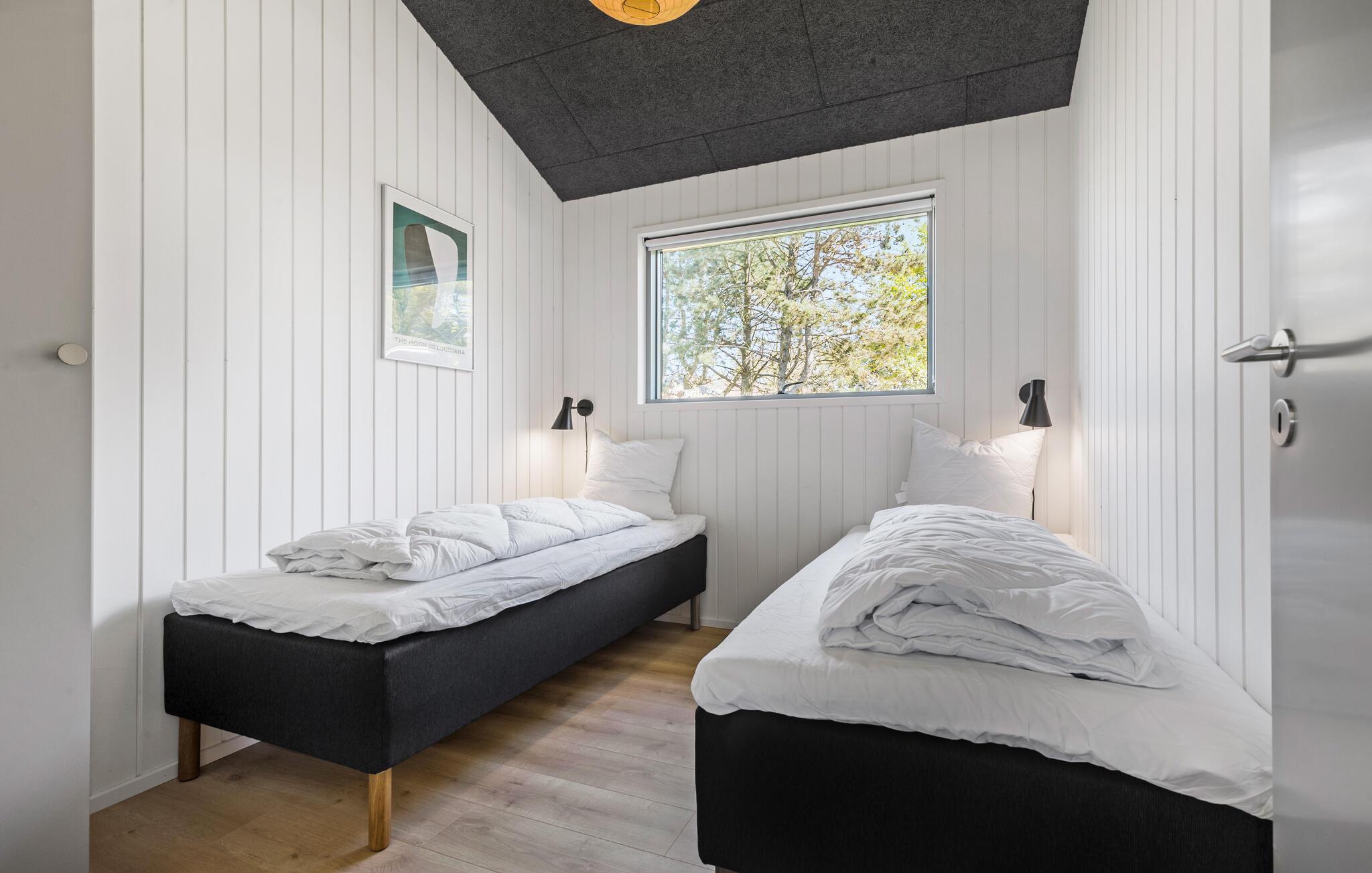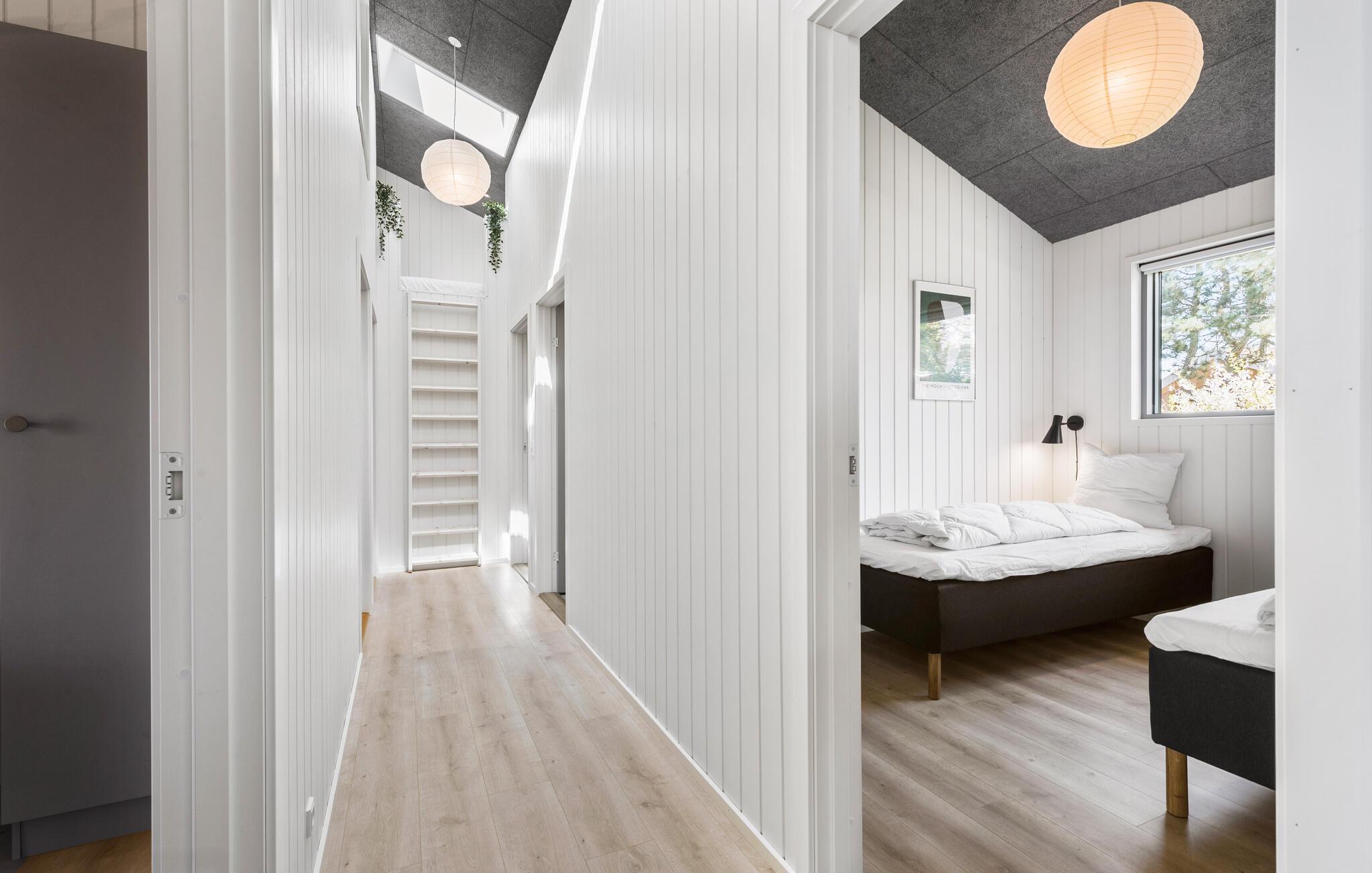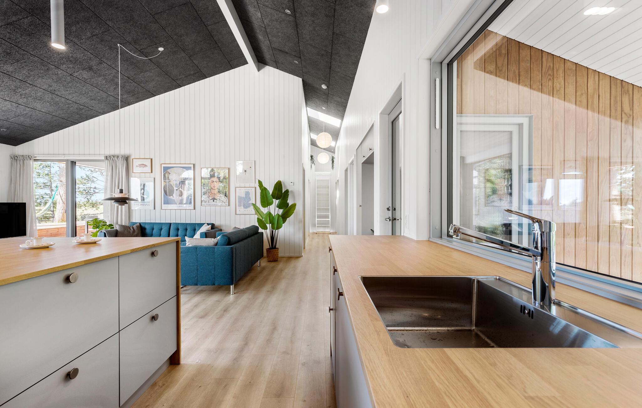 Tilbring jeres næste ferie i dette moderne feriehus, der kombinerer komfort, design og en fantastisk udsigt. Slap af i den rummelige opholdsstue med højt til loftet og panoramavinduer. Nyd det stilfulde interiør med komfortable sofaer, udsøgt kunst på væggene og et harmonisk farvekoncept. Lav maden sammen i det lyse, åbne køkken med kogeø og hvidevarer af høj kvalitet. Tag plads ved det lange spisebord med udsigt over grønne områder og vandet.