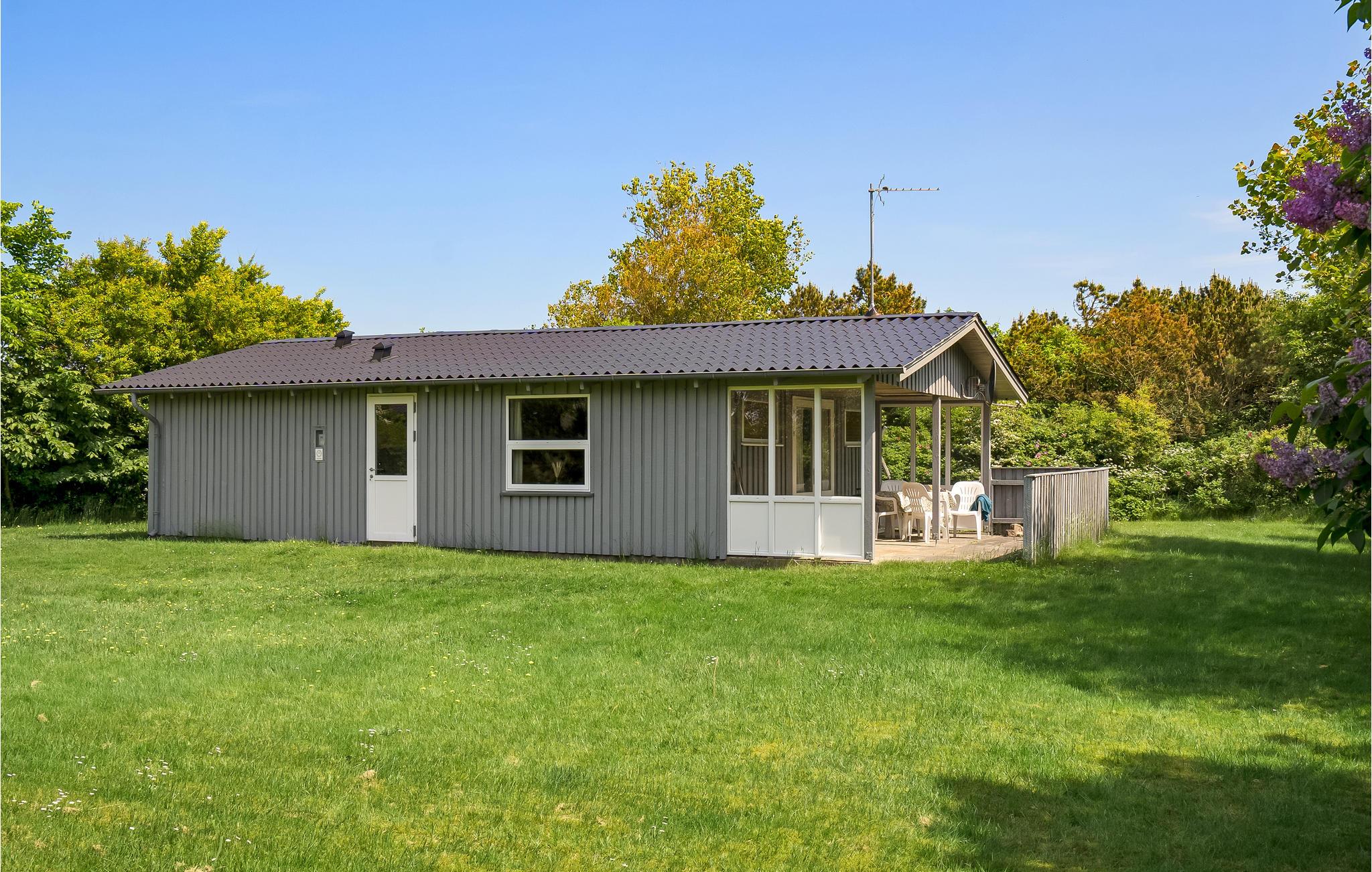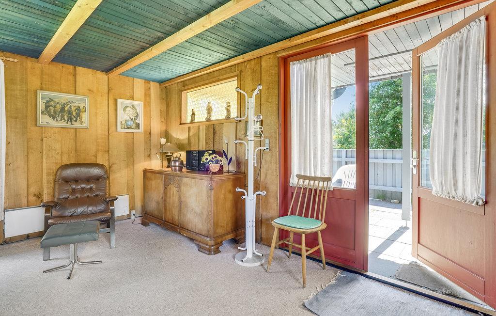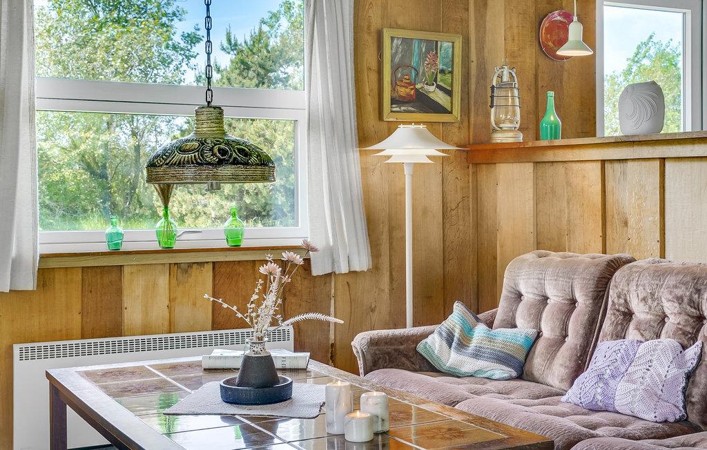 Charmerende træhus i Helligsø Drag nær Limfjorden med natur og strand inden for rækkevidde.