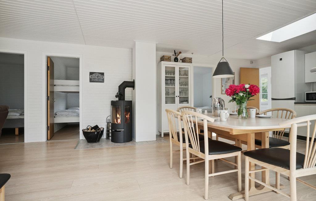 Tilbring en afslappende ferie sammen med jeres kære. Dette smukke hus tilbyder jer de ideelle rammer. Slap af i den lyse stue med åbent køkken og en fantastisk udsigt over fjorden fra spise- og opholdsafdelingen. Den hyggelige atmosfære fuldendes af en varmende brændeovn, der gør det ekstra hyggeligt når I holder spil- og filmaftener. Når sæsonen og temperaturen tillader det, kan I nyde afslappende morgener på den overdækkede terrasse og efter morgenmaden kaste jeres håndklæde over skulderen og gå gennem haven til sandstranden. Det lave vand er særligt børnevenligt og har de ideelle forhold til svømning, plask eller vandsport som kiting, windsurfing og stand-up paddling.