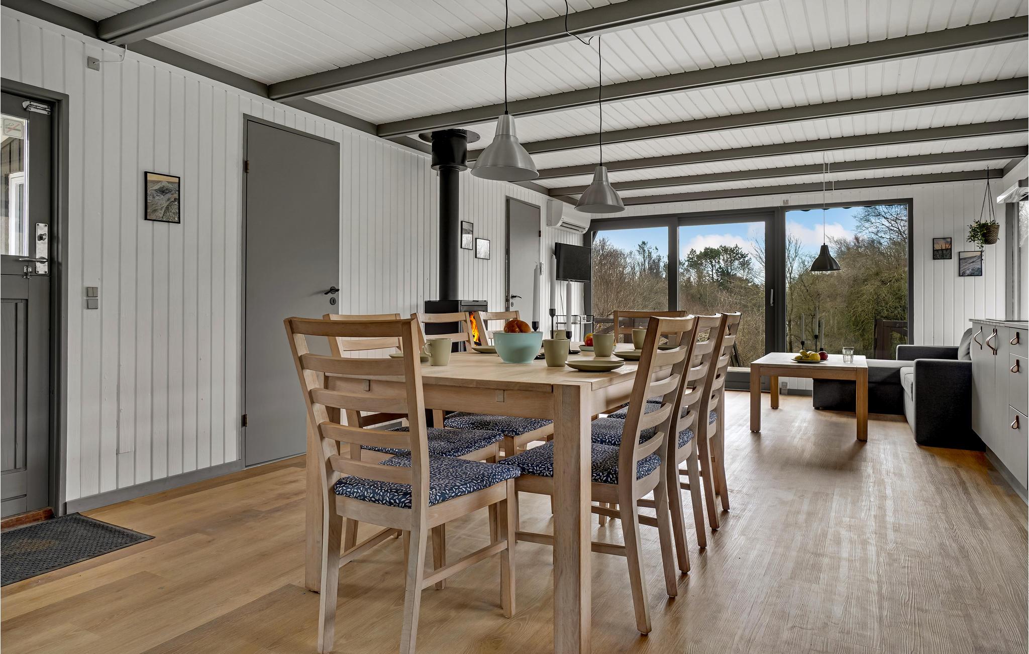 Dette indbydende hus har en attraktiv ugenert beliggenhed midt i skøn natur og tæt på fjorden. Der er gode rammer til familien, for huset er en fantastisk lille oase, der får jer til at glemme alt om den travle hverdag. De lyse værelser med moderne og hyggelig indretning gør, at roen automatisk sænker sig. Alt her er indrettet, så I kan nyde den vidunderlige udsigt bedst muligt, både til måltiderne ved spisebordet eller eftermiddagskaffen i sofaen. I vinterhalvåret kan I skrue ekstra op for hyggen ved at tænde ild i brændeovnen og snakke om dagens oplevelser, ??mens flammerne knitrer i baggrunden.