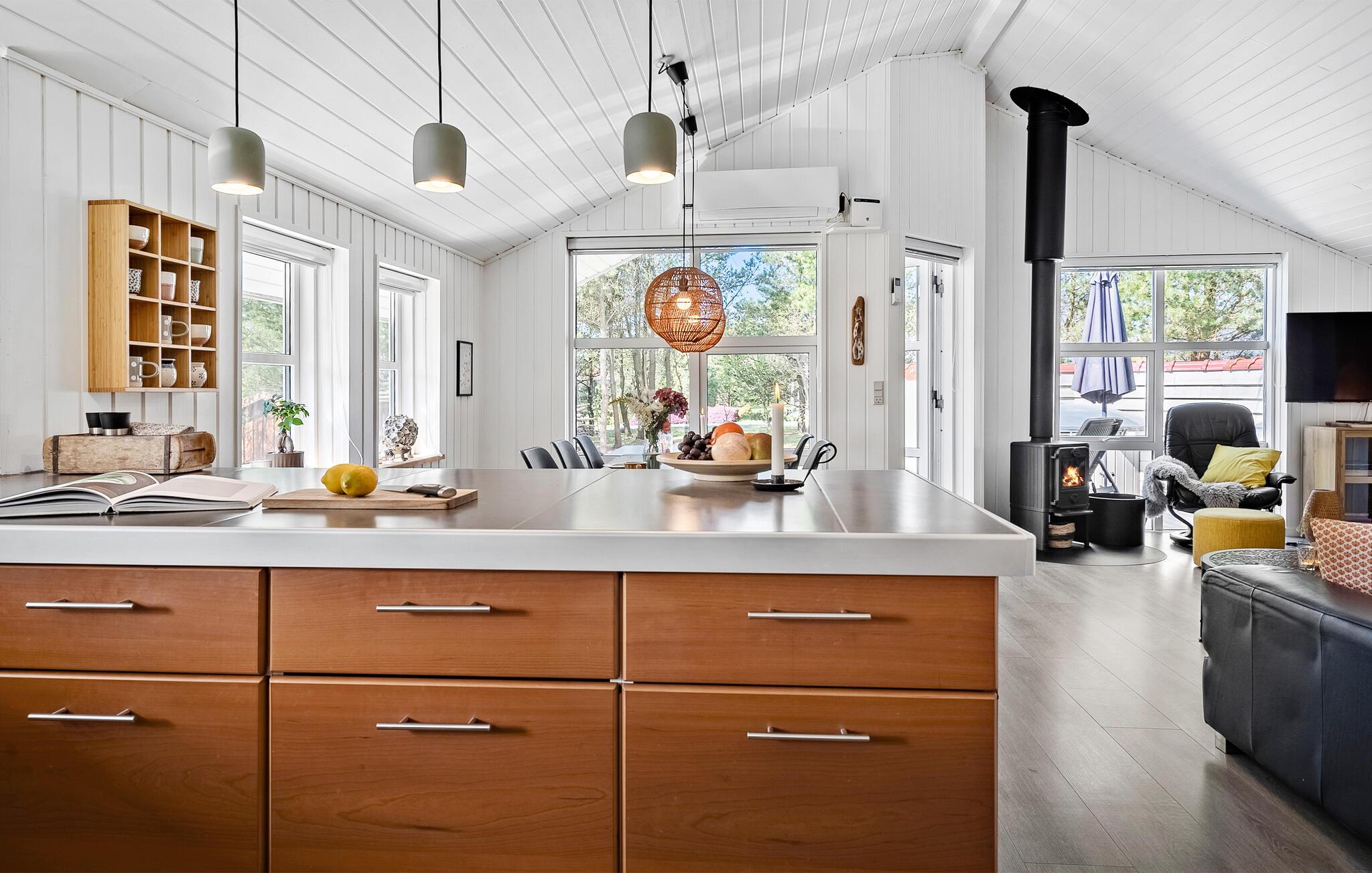 Dette hyggelige feriehus i umiddelbar nærhed af fjorden er det optimale sted til nogle rolige dage på landet. Omgivet af høje træer og vidtstrakte landskaber kan I nyde en pause, der giver jeres krop og sind mulighed for at slappe af. Læg hverdagen bag jer og glæd jer til afslappende timer i et beroligende miljø. Tilbered måltiderne i det velindrettede køkken i klassisk stil. Slå jer ned sammen i det stilfulde spiseområde med udsigt over de grønne områder og tag jer tid til samtale og god mad. Gør det behageligt i sofahjørnet i stuen, nyd knitren fra brændeovnen og nyd husets skønne rammer.