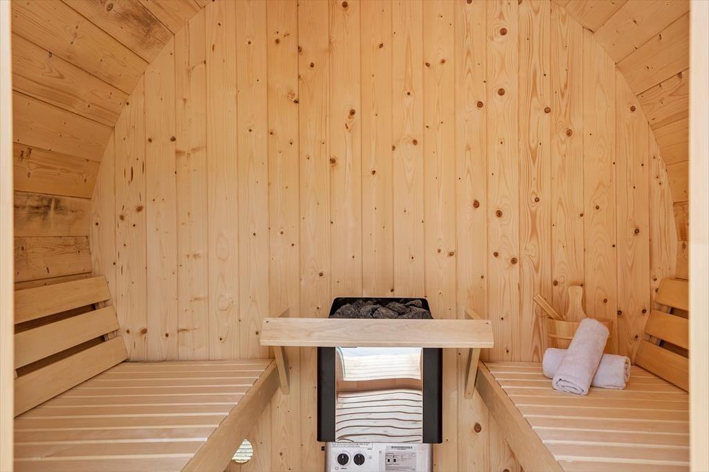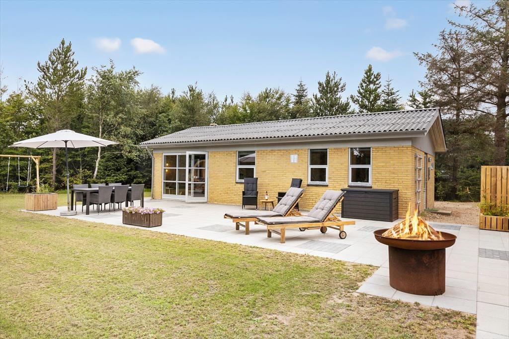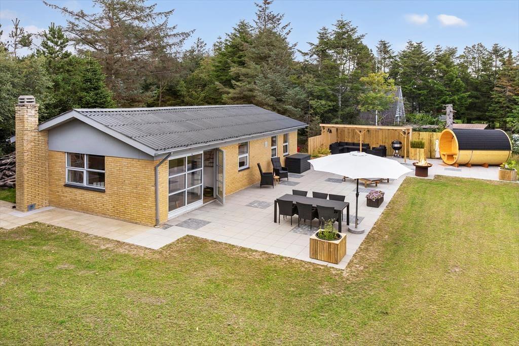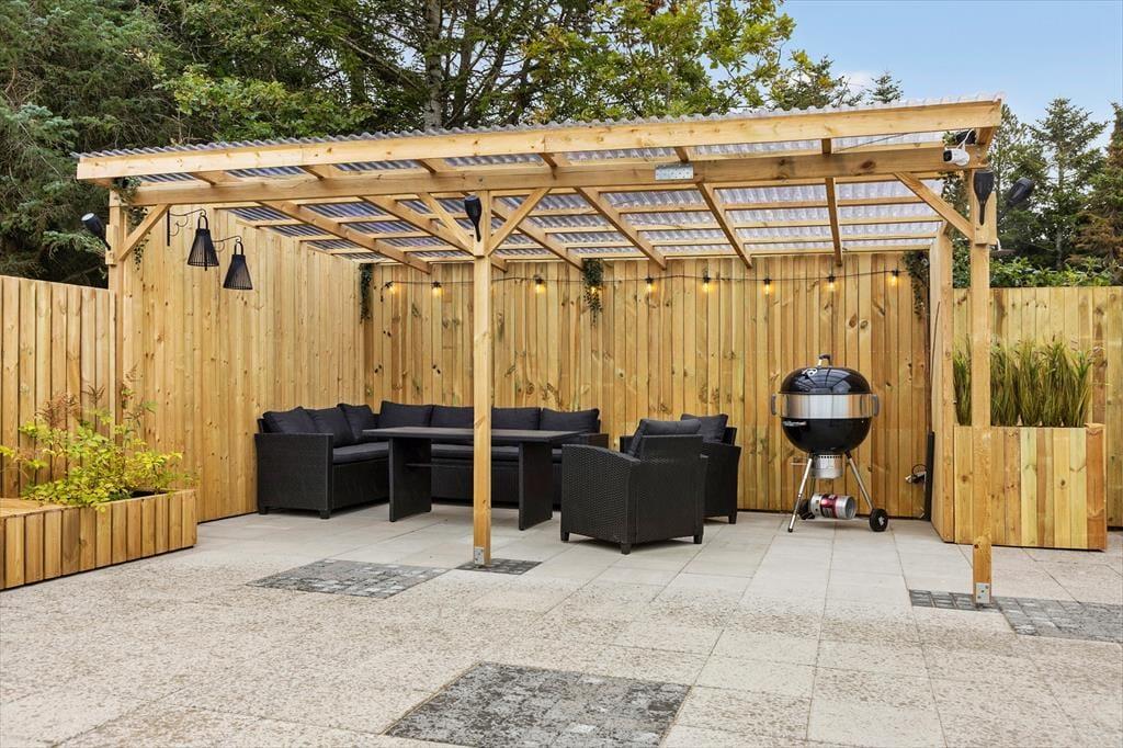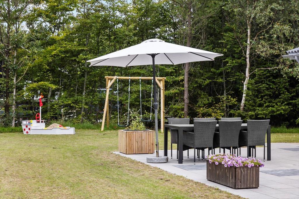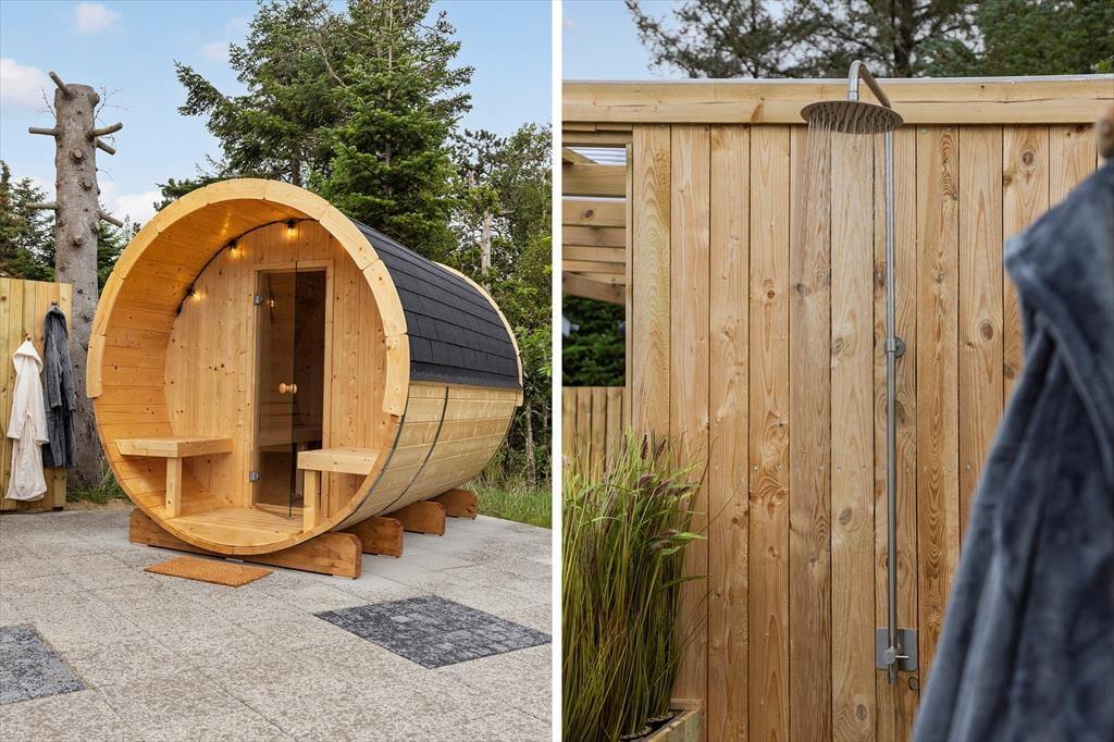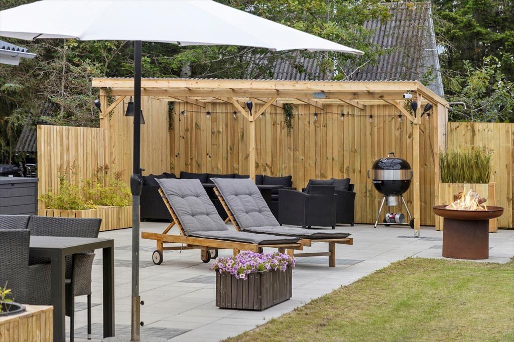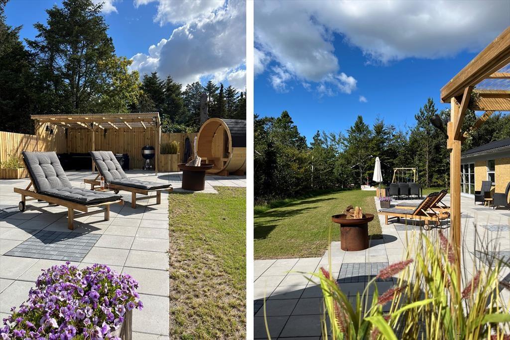 Feriens udeliv kan nydes på den skønne terrasse, som både har åbne og overdækkede arealer, så I kan finde en dejlig plads uanset vejret. Her kan I starte morgenen med kaffe i den friske luft, tilbringe solrige eftermiddage i liggestolene og samles til aftensmad fra grillen under åben himmel. Som prikken over i’et står saunatønden klar til at forkæle jer efter en dag ved stranden eller på tur i det omkringliggende landskab – det er en oplevelse, der kombinerer wellness og natur på allerbedste vis. Haven giver samtidig god plads til leg og små spil, mens I andre kan nyde udsigten fra terrassen og den rolige atmosfære i området.