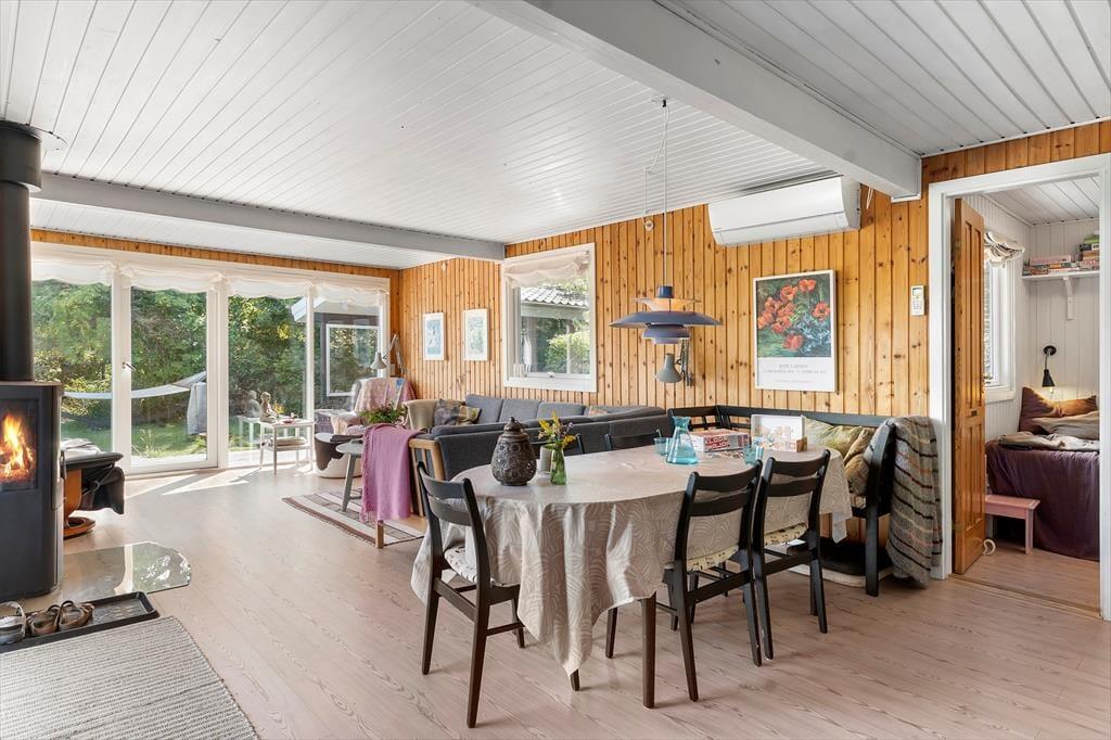 Indenfor byder huset på en lys og indbydende stemning, som straks får skuldrene til at sænke sig. Indretningen er hyggelig og enkel med fokus på komfort og nærvær – her er der plads til at være sammen, lave mad i fællesskab og finde ro i feriedagenes langsomme rytme. Brændeovnen i stuen sørger for varme og ekstra feriestemning, når det rusker udenfor eller mørket falder på. Tænd op, læn dig tilbage med en bog eller nyd en god kop kaffe i flammernes skær. Huset har plads til seks personer fordelt på tre soveværelser, og du må gerne tage ét firbenet familiemedlem med – det bliver med garanti også glad for de mange gode snusemuligheder udenfor.