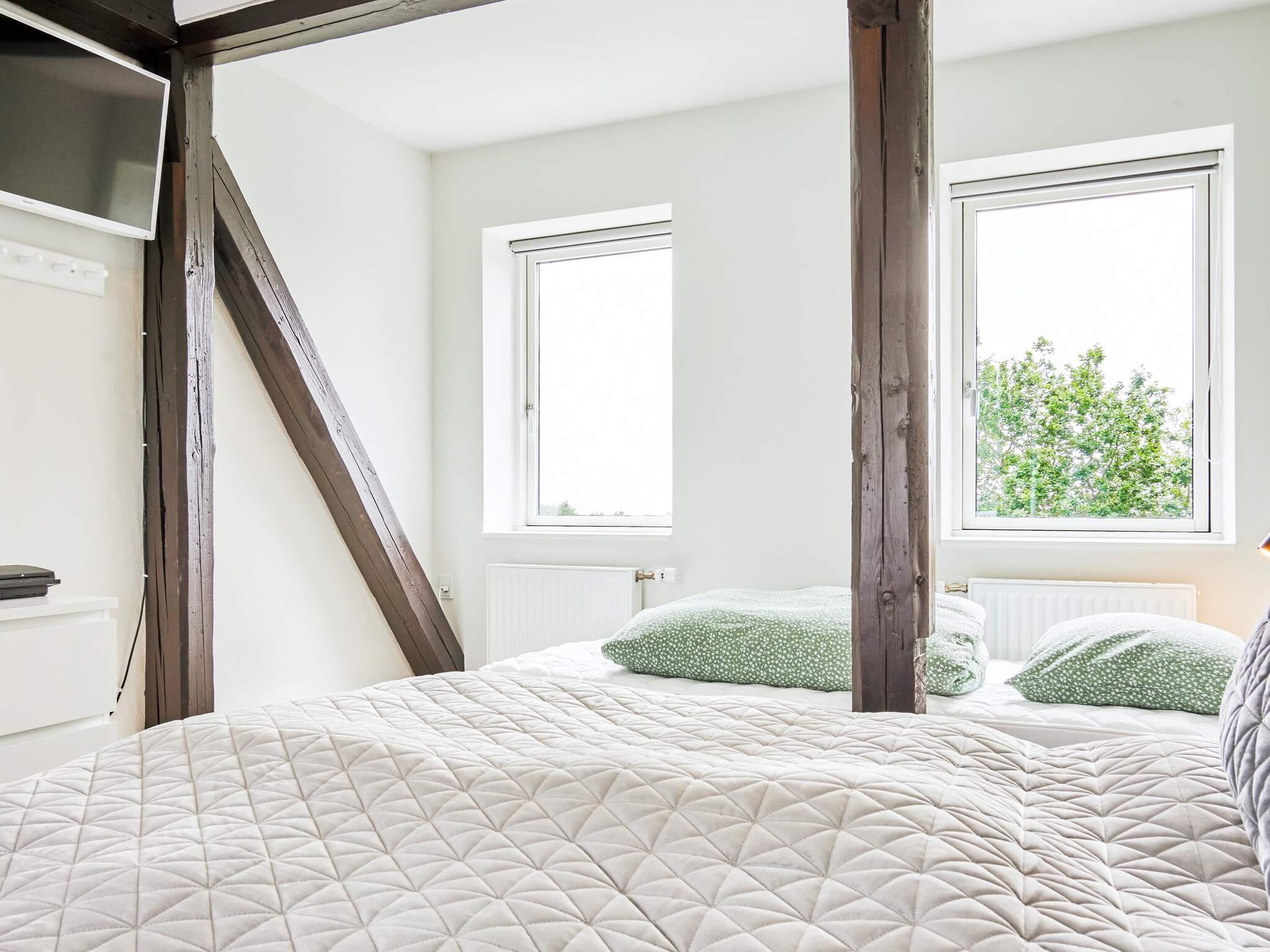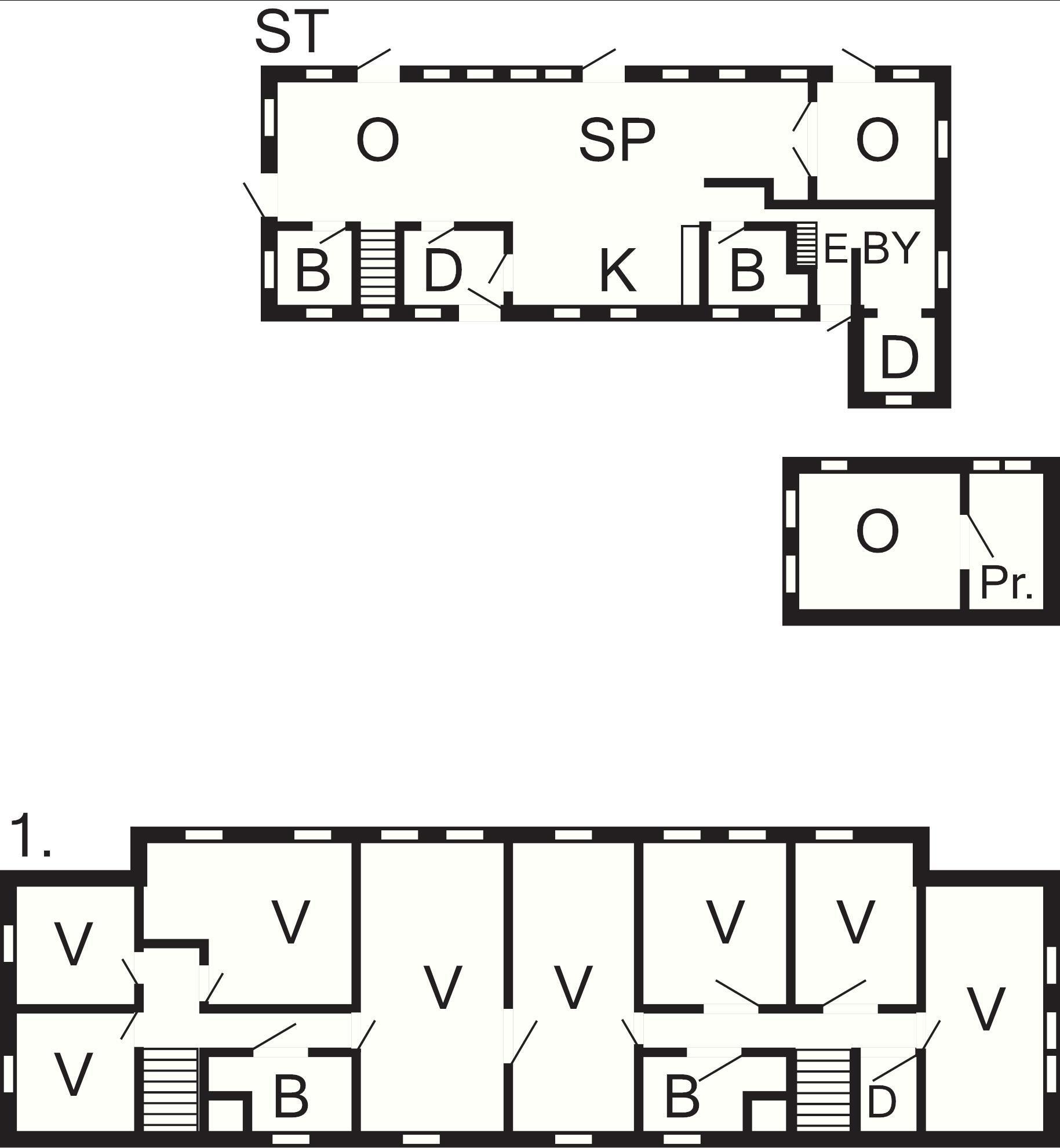 På 1. sal findes otte soverum med både enkeltsenge og dobbeltsenge samt to badeværelser, begge med bruseniche.