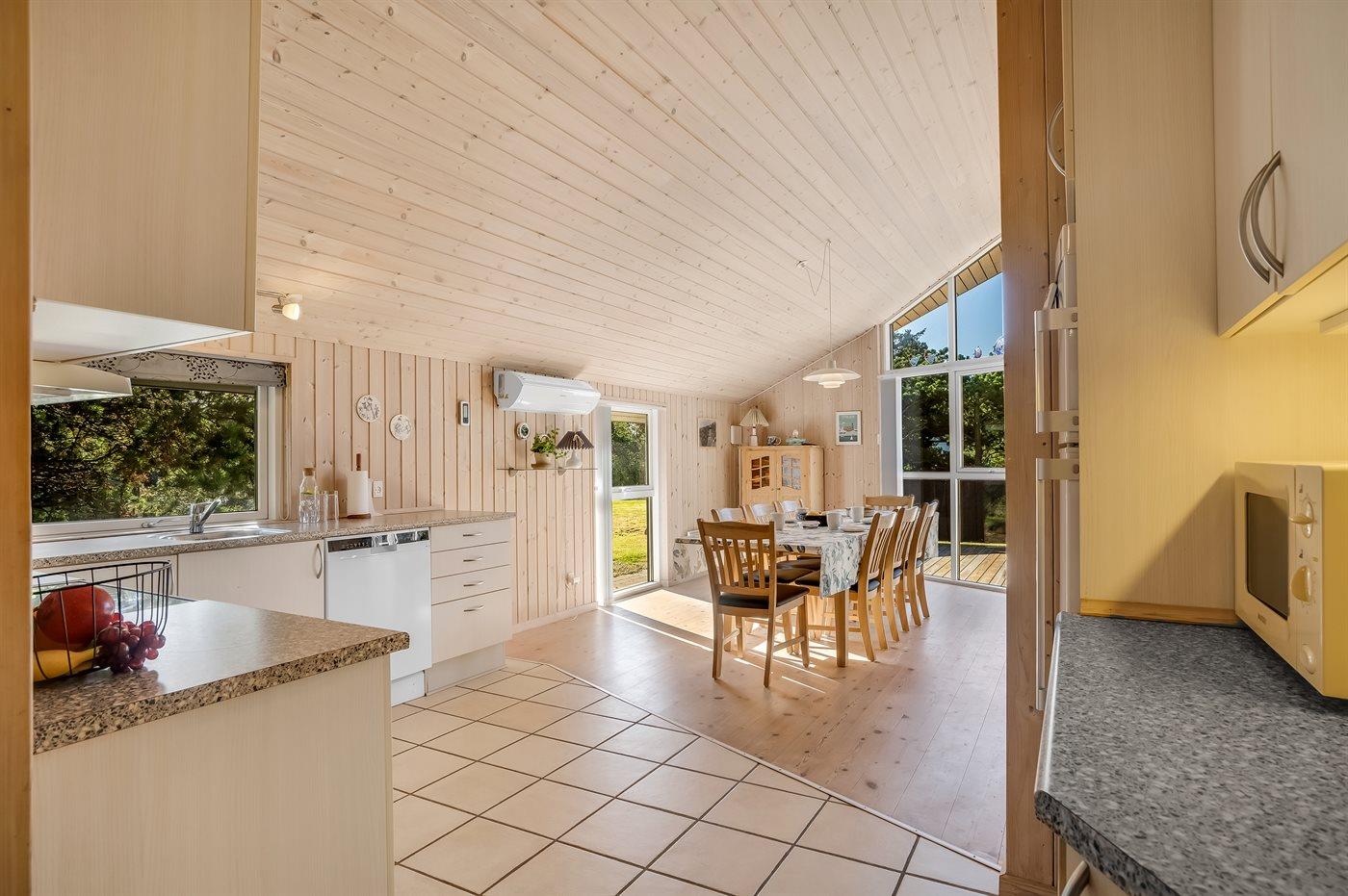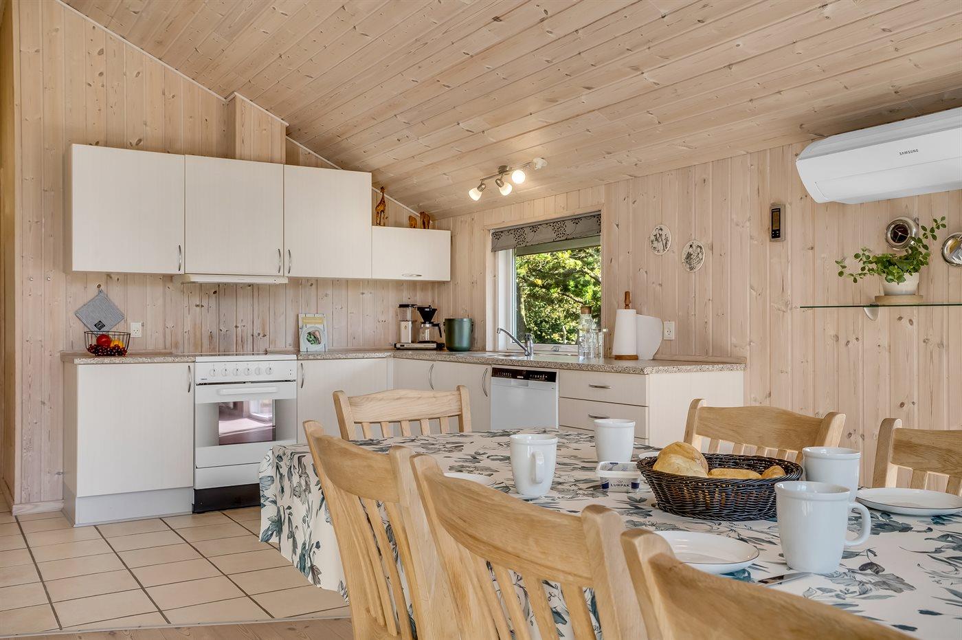 Køkkenet er udstyret med 1 køleskab. Der er 4 keramiske kogeplader, varmluftovn, mikrobølgeovn samt opvaskemaskine.