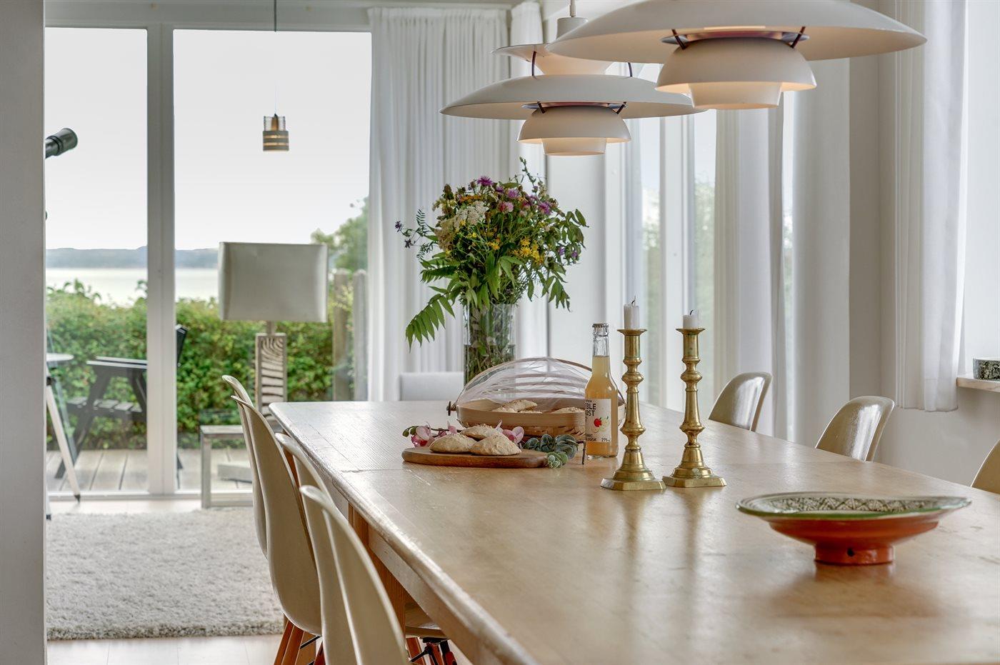 Med en unik beliggenhed helt ned til vandet finder man dette rummelige og lyst indrettede sommerhus. Huset henvender sig til de gæster, der lægger vægt på kvalitet og komfort. Til huset hører et stort terrasseareal, hvorfra man kan nyde den dejlige udsigt. På husets 1. sal er der indrettet arbejdsplads med 2 kontorborde og stole.
