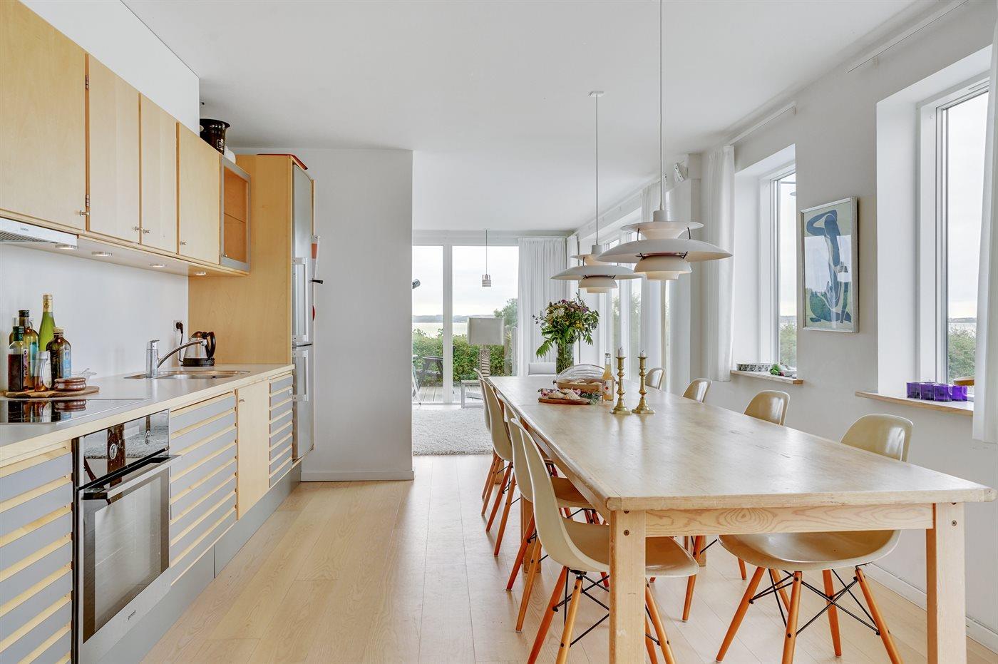 Køkkenet er udstyret med 1 køle-/fryseskab. Der er 4 keramiske kogeplader, varmluftovn, mikrobølgeovn samt opvaskemaskine.