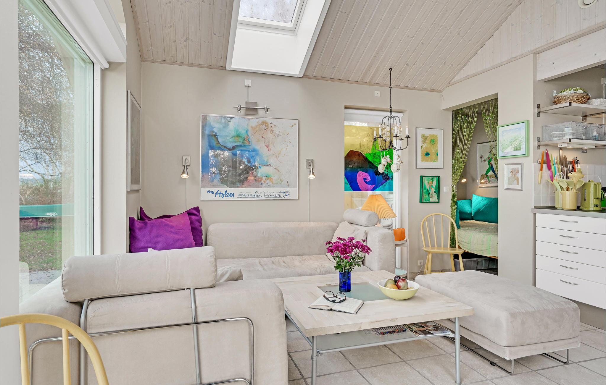 Dette hyggelige feriehus er lyst og venligt, og så er der plads til op mod fire gæster. De store panoramavinduer bidrager med en fantastisk udsigt og sørger for et behageligt lysindfald. På kølige dage kan I tænde op i brændeovnen og flade ud med en bog på sofaen, mens I betragter naturen og fuglelivet udenfor. Når sommervarmen indfinder sig, kan I læne jer tilbage på terrassen og grille i de lyse nætters tid. Stedet er en helt fantastisk oase, hvis I bare trænger til at slappe af og nyde freden og roen i naturen, men er også en ideel hjemmearbejdsplads.