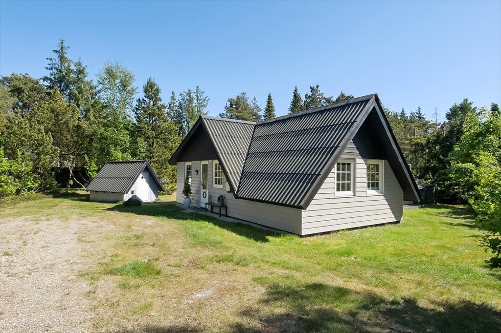 Vågner I op til en solrig sommerdag, kan I tage morgenkaffen med ud på den delvist overdækkede terrasse. Mens I sidder og strækker jer, bliver I måske akkompagneret af fuglesang fra trætoppene, men ellers er der nu ganske fredeligt her i det skovklædte sommerhusområde. Terrassen er stor, og derudover er der godt med plads på græsplænen, uanset om I vil slænge jer eller spille bold i det grønne.