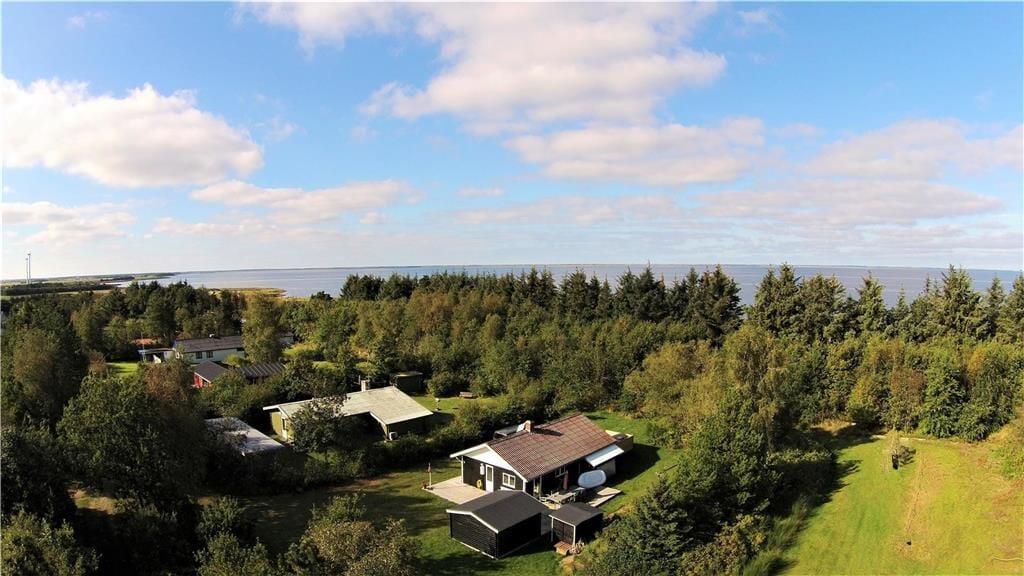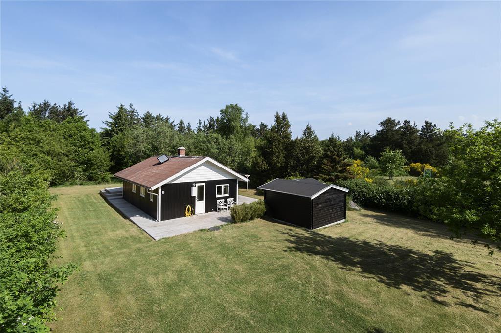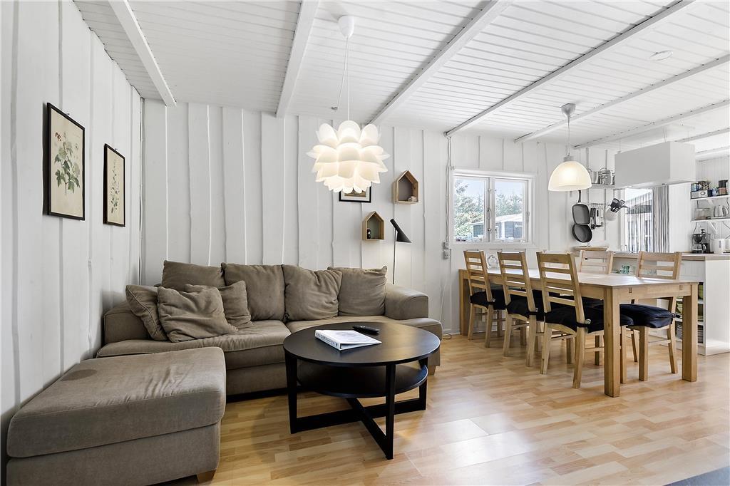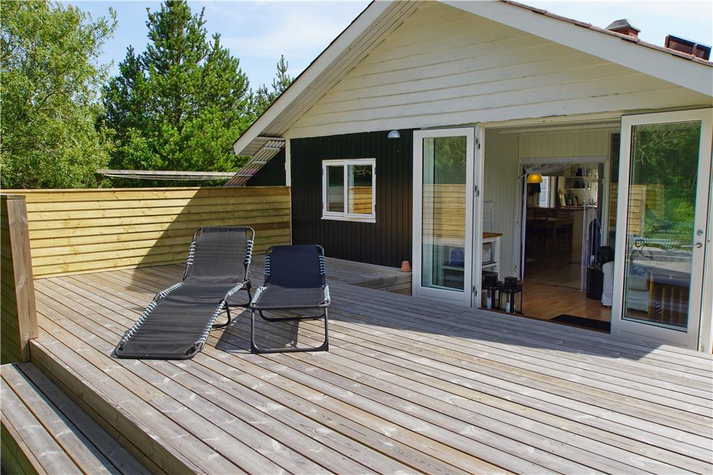 Dette dejlige sommerhus ligger i de smukkeste naturomgivelser for enden af en lille vej i første række til Hemmet Strand. Grunden skærmes af randbeplantning, og mellem træerne kan I skimte Ringkøbing Fjord, når I sidder på træterrassen – og sågar også fra et af soveværelserne. Med andre ord har I fornemmelsen af at bo ugeneret, men stadig i nærhed til vandet her på adressen.