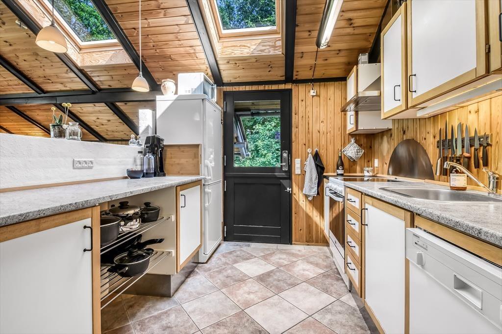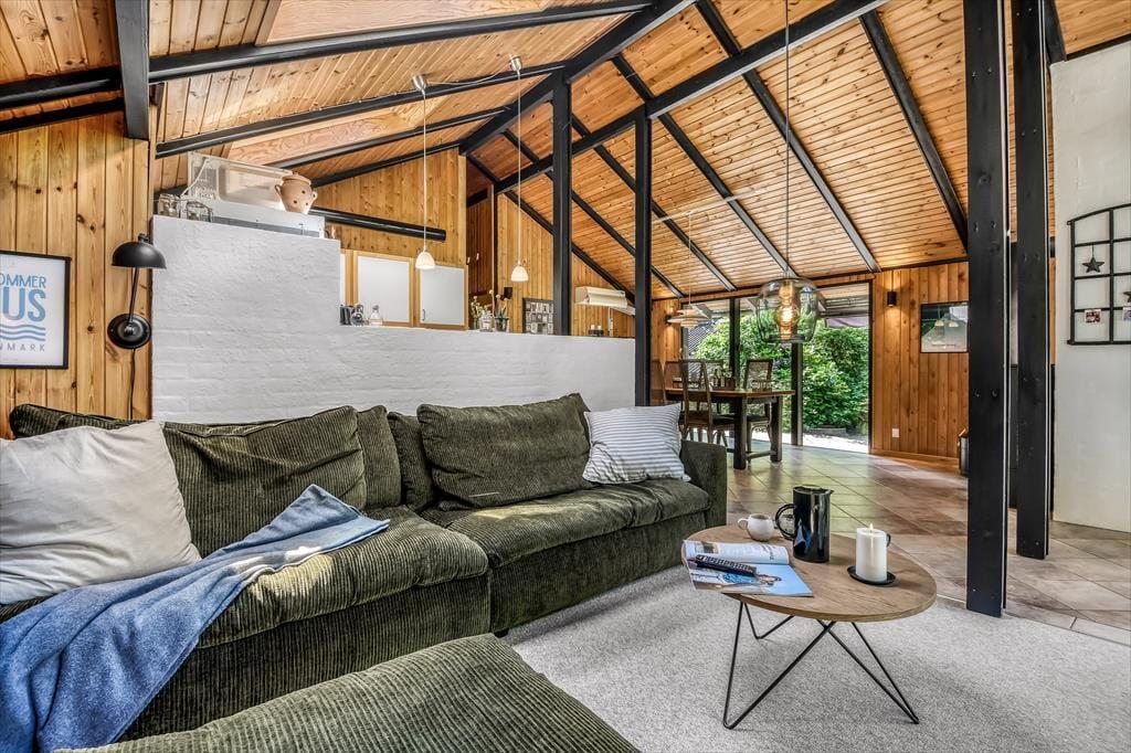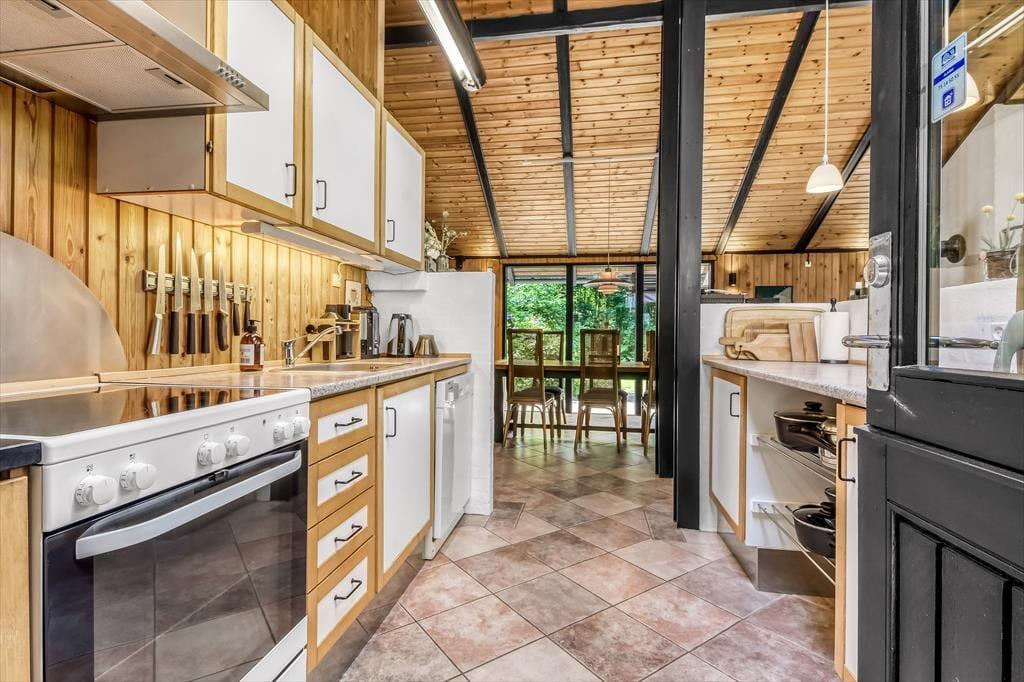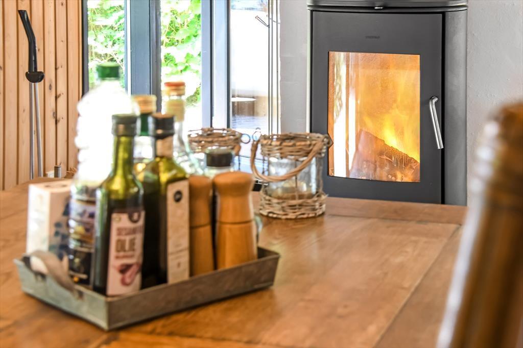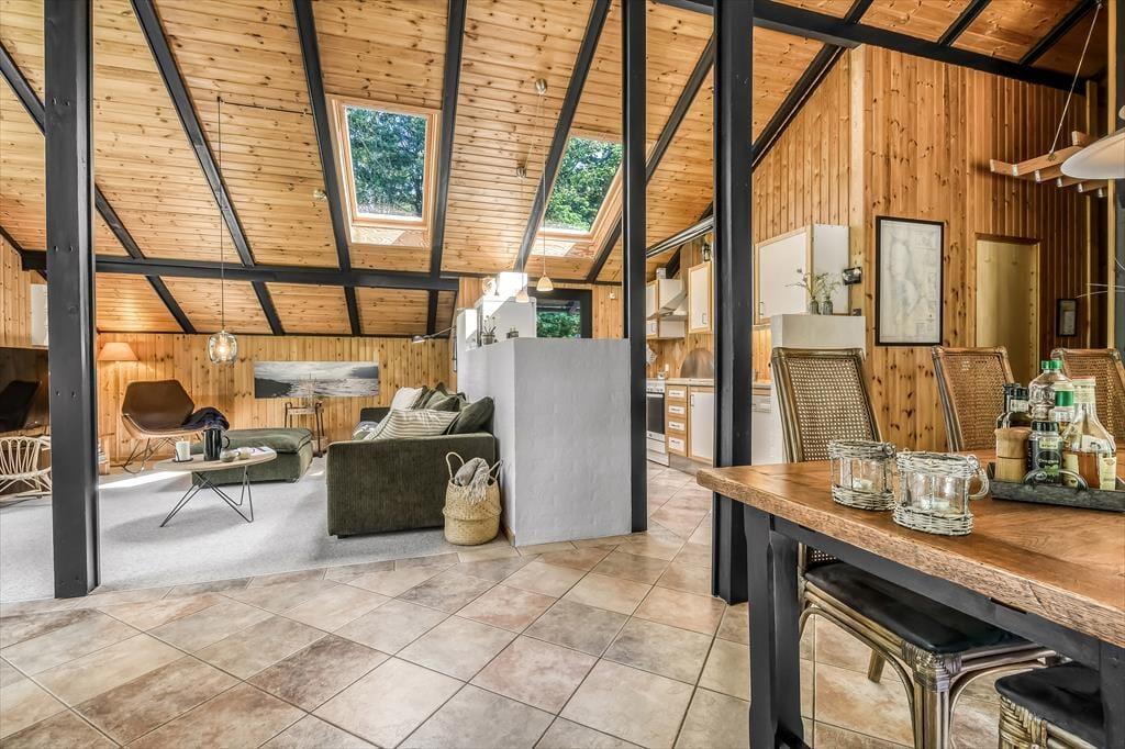Sommerhusets badeværelse og tre soveværelser er alle sammen gode rum med en rar atmosfære, men det er ganske givet stuen, du kommer til at tilbringe de fleste af døgnets vågne timer i. Det er nemlig et lækkert opholdsrum med rustikke trævægge, loft til kip og ovenlysvinduer – såvel som store glaspartier, der inviterer naturgrundens grønne frodighed indenfor og gør det nemt at tage terrasserne i brug. En brændeovn bidrager til hyggestemningen: Hvis du og dine kære holder ferie udenfor højsæsonen, er det herligt at sidde nær den knitrende varme, mens I spiller brætspil eller nyder et overdådigt måltid. Maden kan I tilberede i det åbne køkken, og her er der alt, hvad I skal bruge, uanset om I laver en let sommersalat eller en omgang rigtig comfort food.