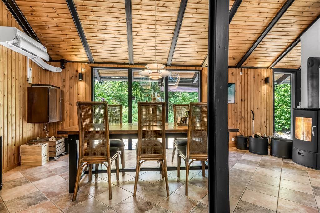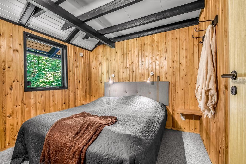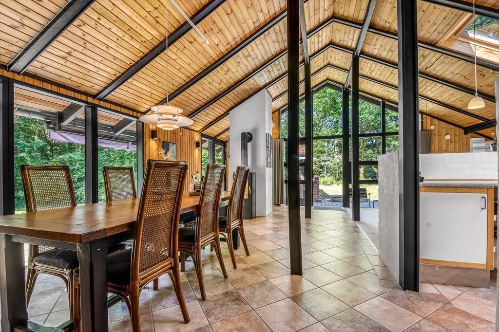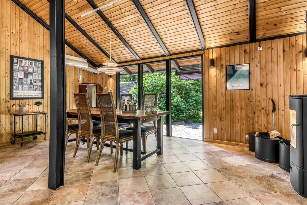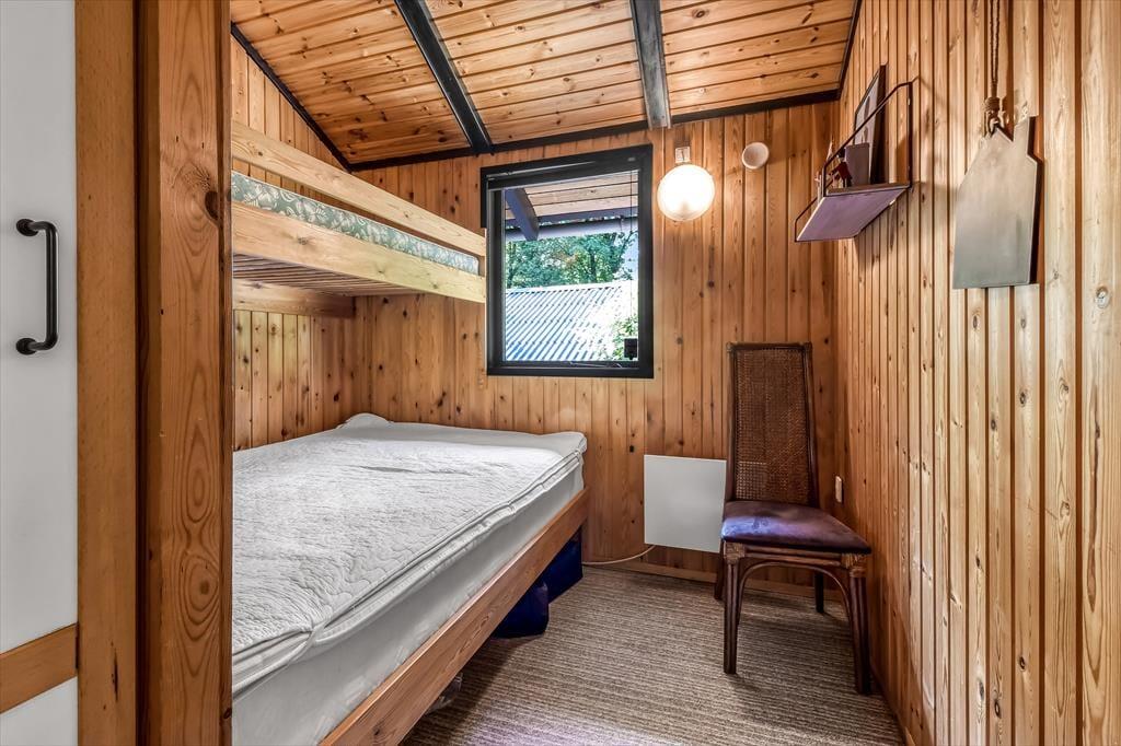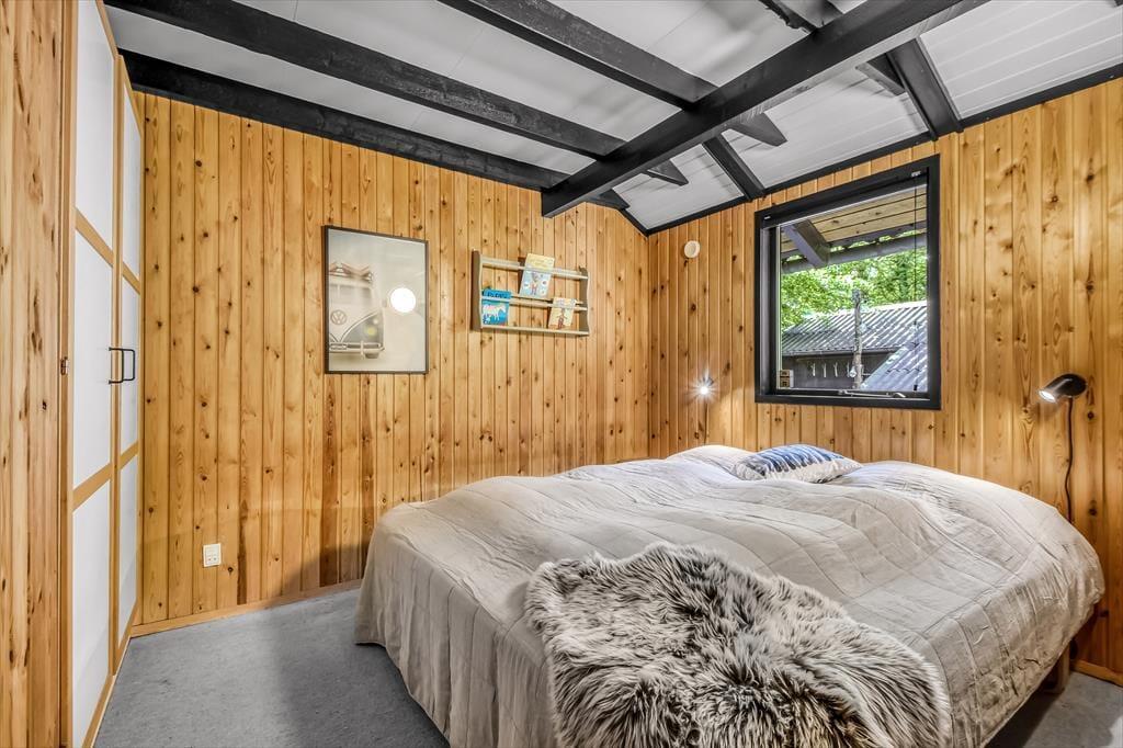Sommerhusets badeværelse og tre soveværelser er alle sammen gode rum med en rar atmosfære, men det er ganske givet stuen, du kommer til at tilbringe de fleste af døgnets vågne timer i. Det er nemlig et lækkert opholdsrum med rustikke trævægge, loft til kip og ovenlysvinduer – såvel som store glaspartier, der inviterer naturgrundens grønne frodighed indenfor og gør det nemt at tage terrasserne i brug. En brændeovn bidrager til hyggestemningen: Hvis du og dine kære holder ferie udenfor højsæsonen, er det herligt at sidde nær den knitrende varme, mens I spiller brætspil eller nyder et overdådigt måltid. Maden kan I tilberede i det åbne køkken, og her er der alt, hvad I skal bruge, uanset om I laver en let sommersalat eller en omgang rigtig comfort food.