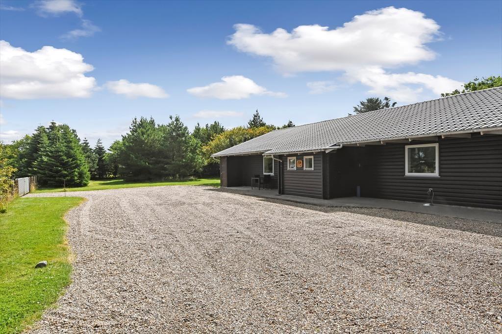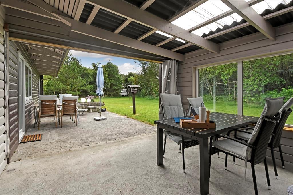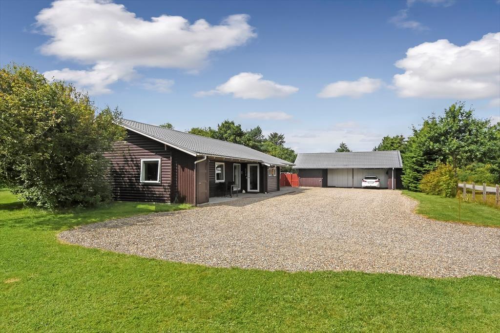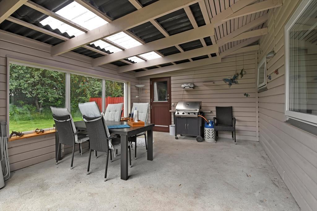 Udearealerne er et paradis for de firbenede familiemedlemmer, for grunden er stor og helt indhegnet, så hundene kan få det skønt i trygge rammer. Også børn og voksne kan se frem til at lege og spille bold på græsplænen – hvis ikke I bare slænger jer på den solrige fliseterrasse, der ligger syd for sommerhuset. En del af terrassen er overdækket og godt skærmet af mod tre sider, så det føles nærmest som at sidde i en udestue, når I tilbringer de lyse sommeraftener her. Endelig er parkeringsforholdene værd at bemærke, for den grusbelagte indkørsel er meget stor og praktisk, og der er ovenikøbet garage.