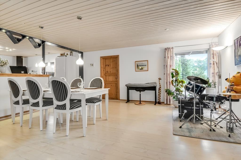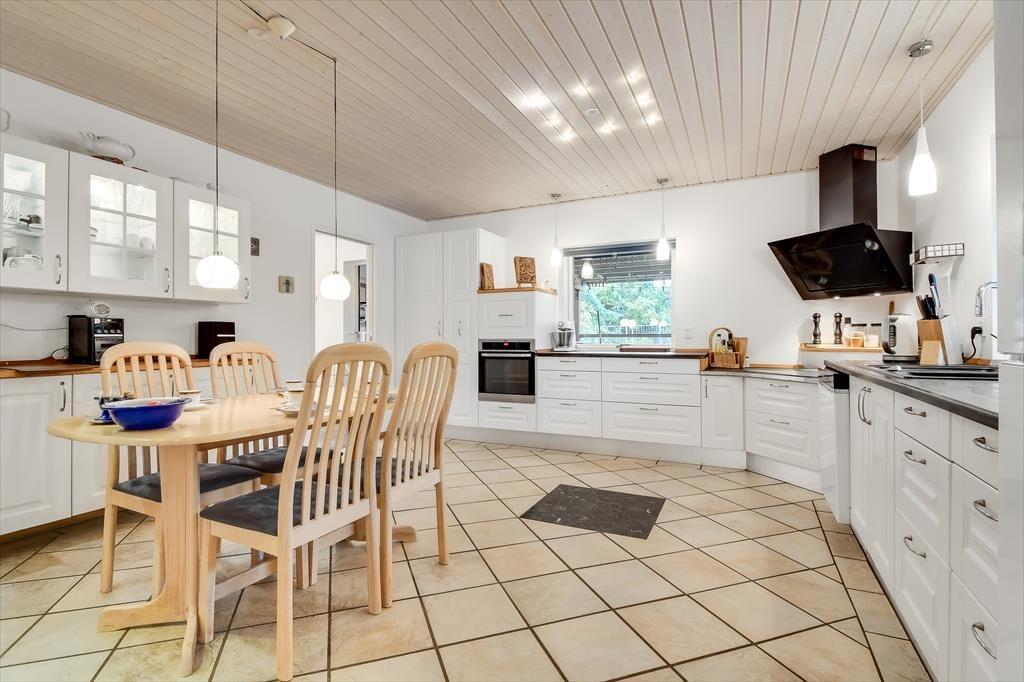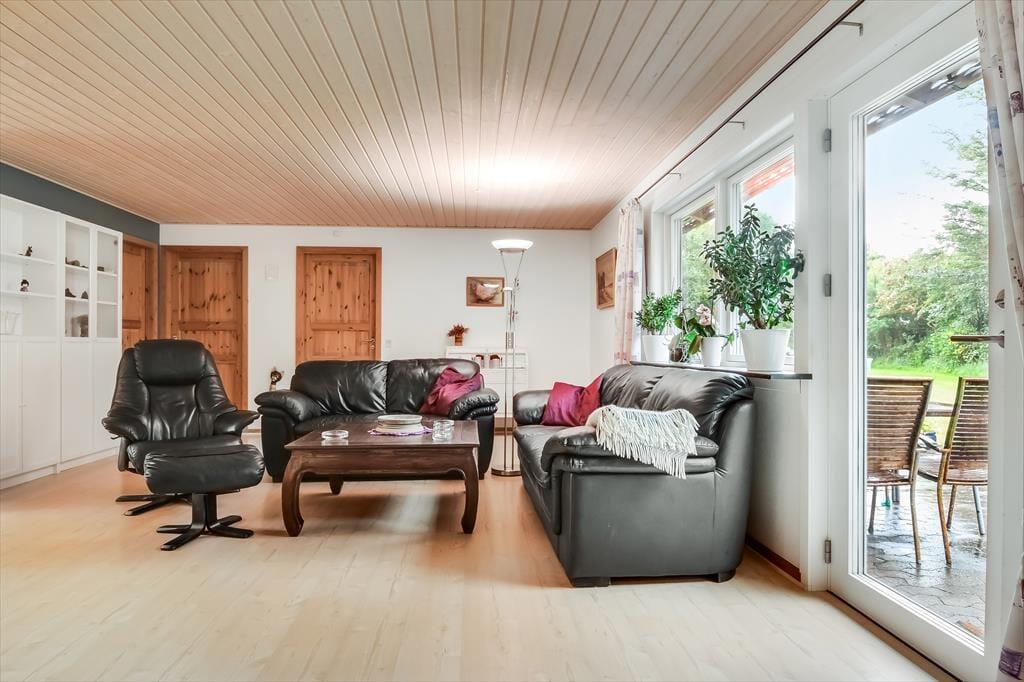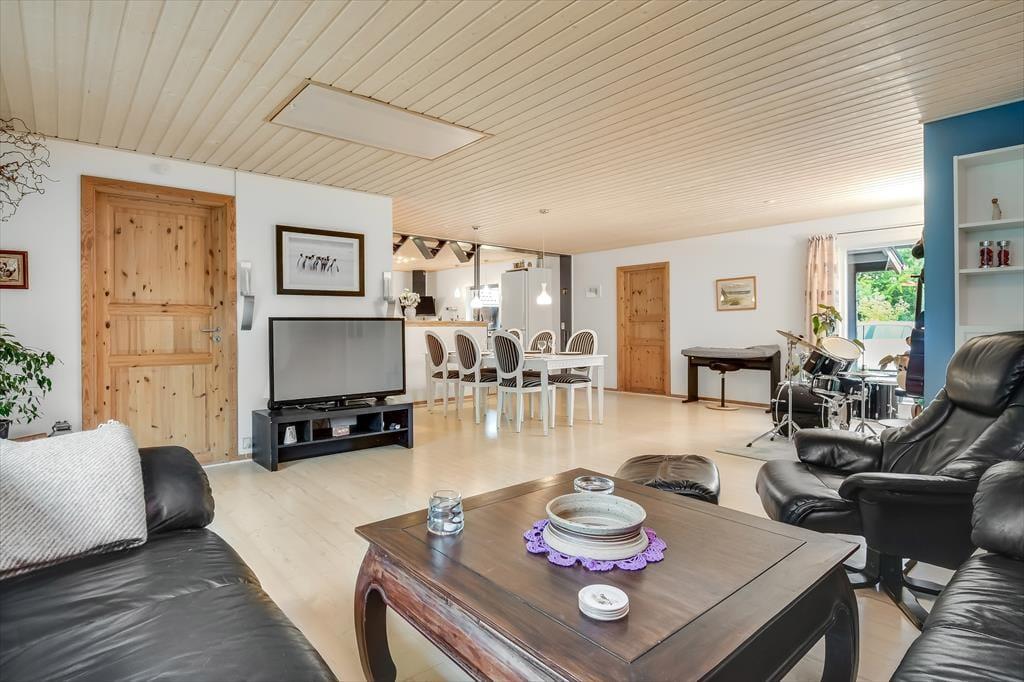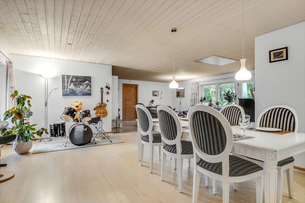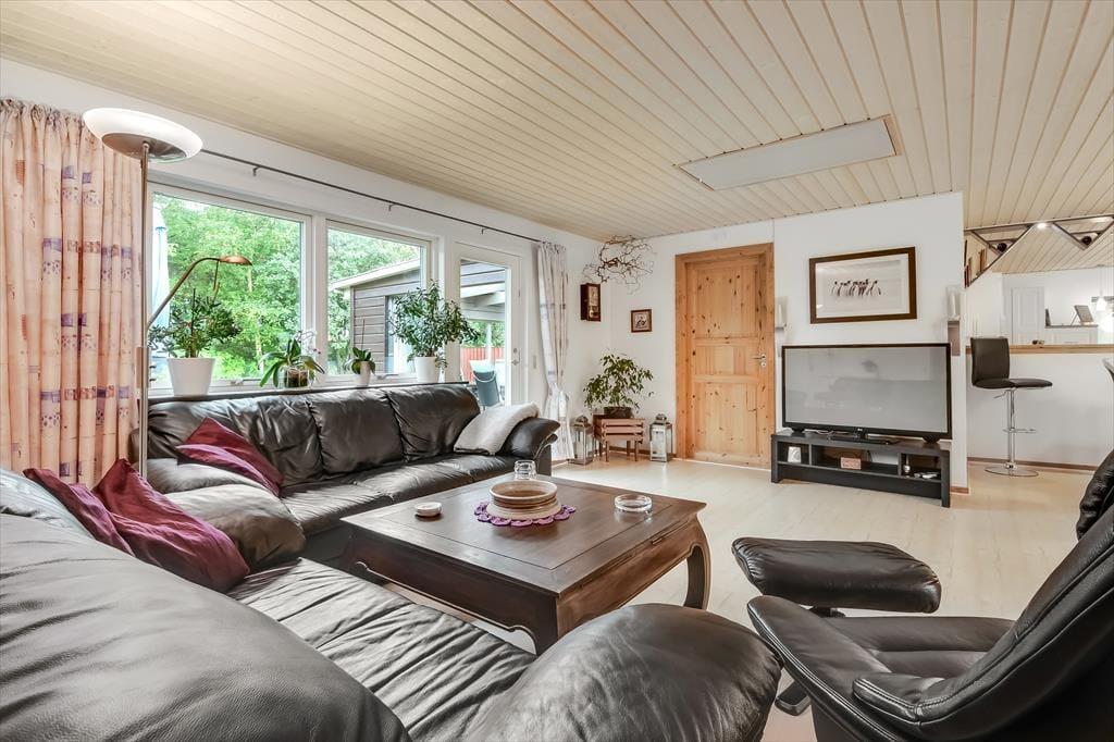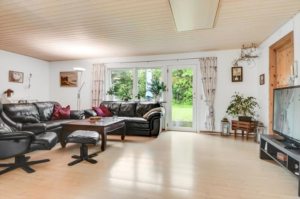 Sommerhuset har tidligere været anvendt til helårsbeboelse, så du og dine kære kan holde ferie her både sommer og vinter – og I får hele 142 m2 at brede jer på inden døre. Køkken og stue ligger centralt i huset, og den åbne forbindelse gør det nemt at nyde det sociale samvær, også selvom nogen familiemedlemmer slapper af og andre hygger sig med madlavningen. Hvis du har musikalske talenter i familien, kan du glæde dig over stuens musikinstrumenter, mens sofaerne og det store fladskærms-tv fungerer som et perfekt setup til jer, der elsker at holde filmaftener eller se serier. I forlængelse af husets bryggers findes ligeledes et rum netop designet til de firbenede gæster. De tre soveværelser er godt fordelt, så alle kan se frem til en rolig nats søvn.