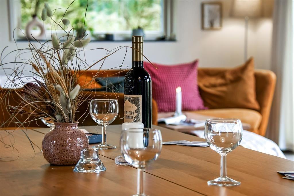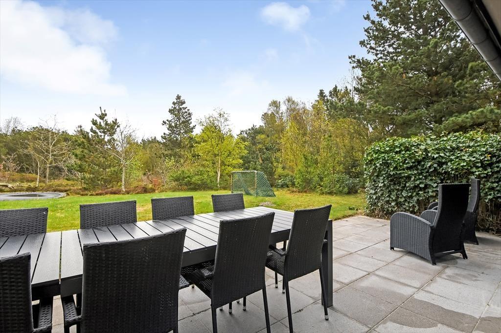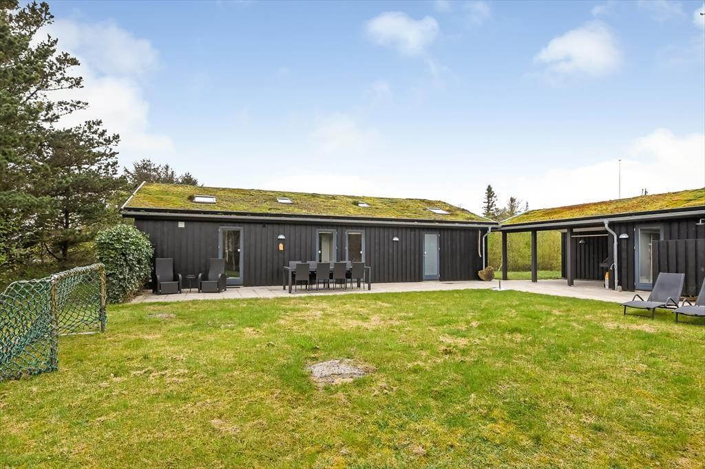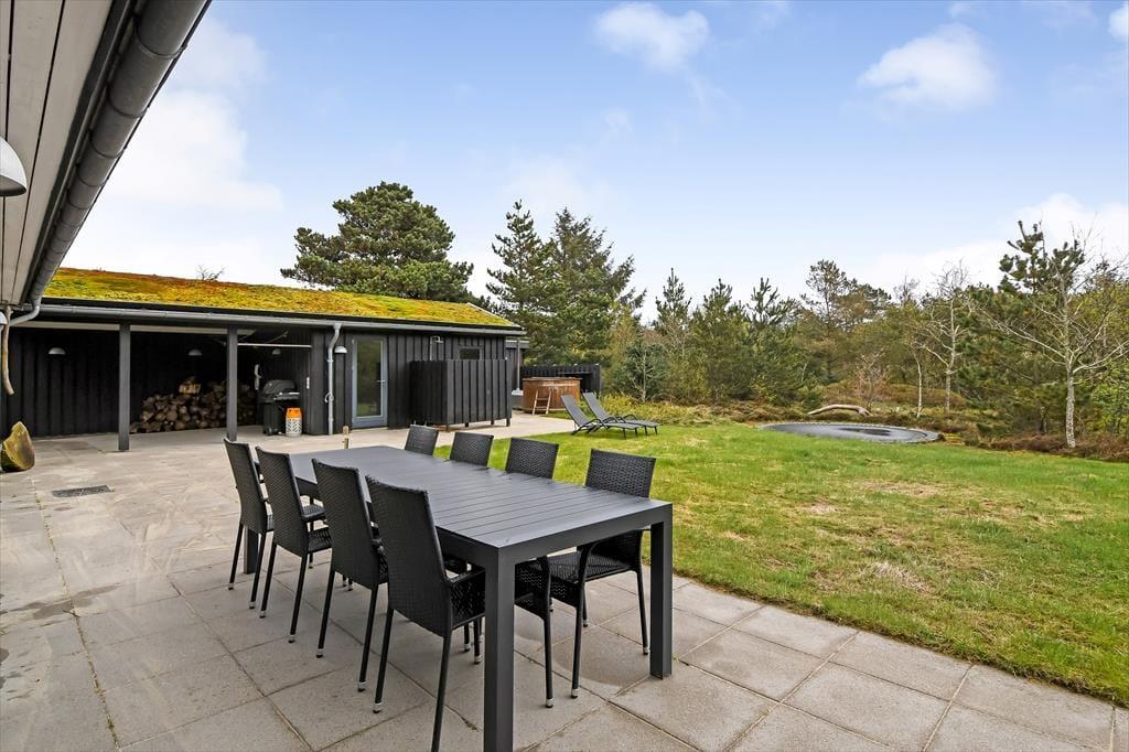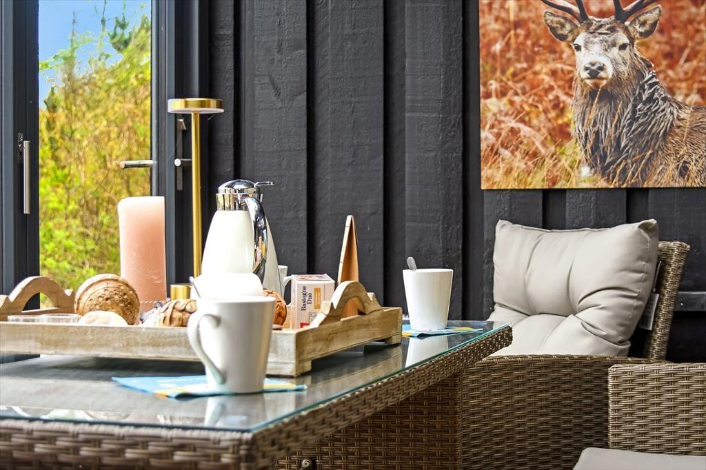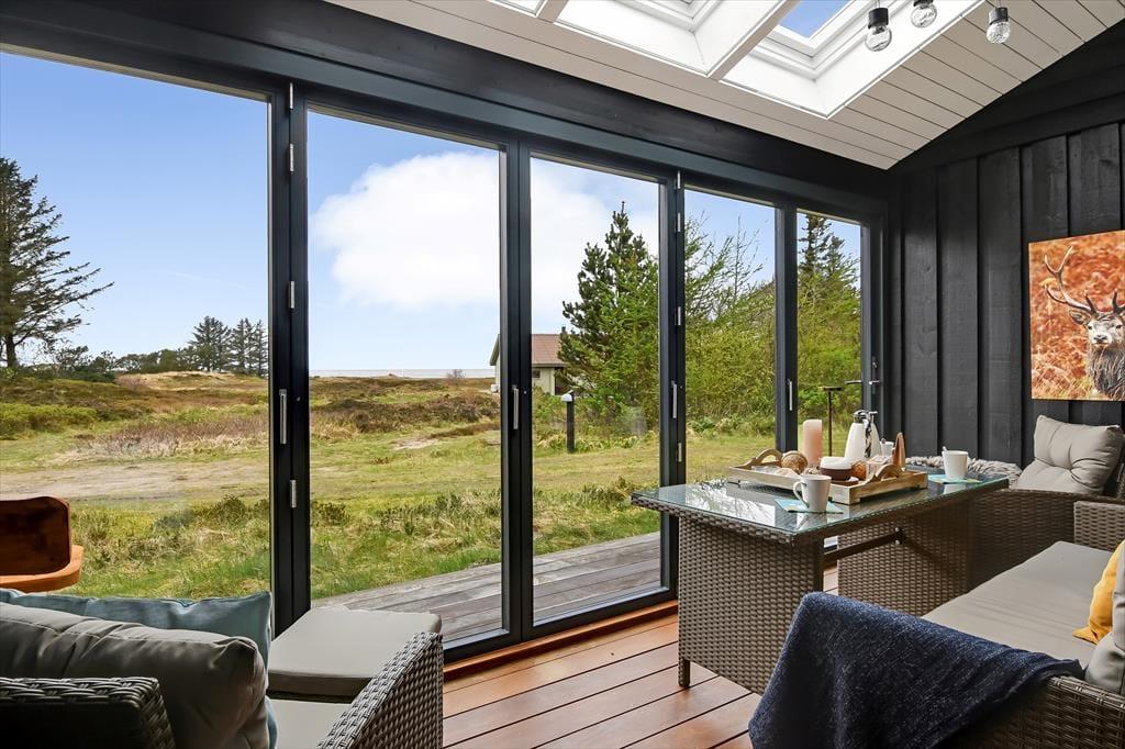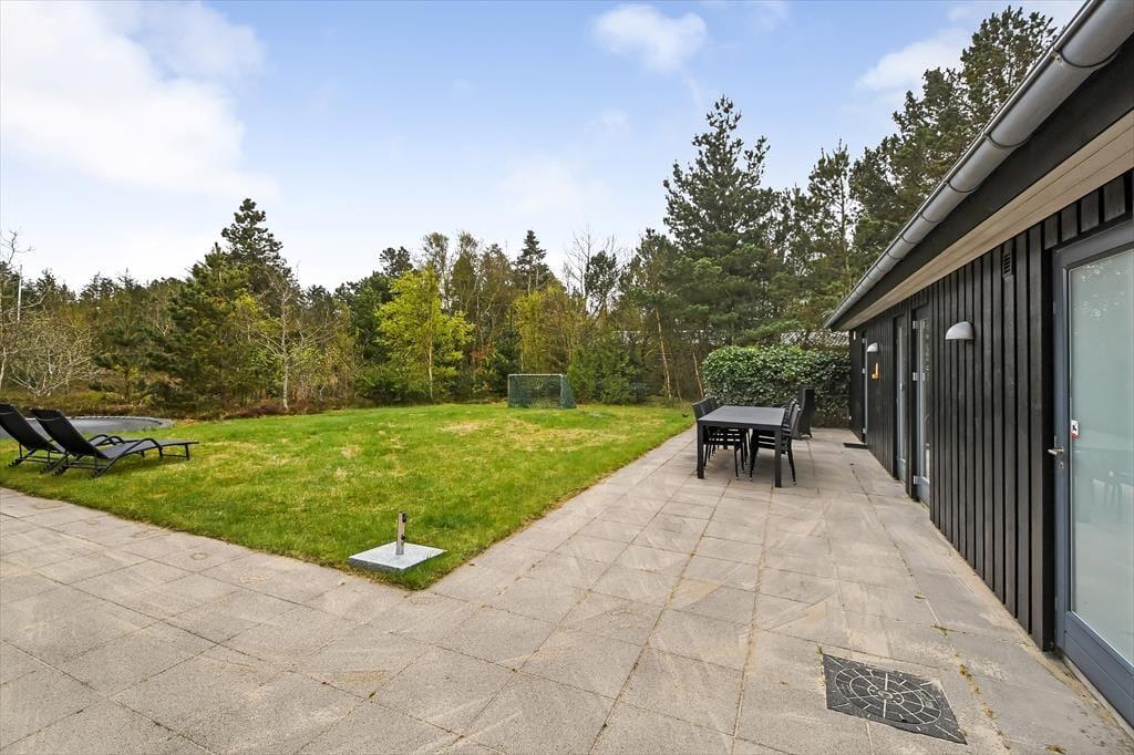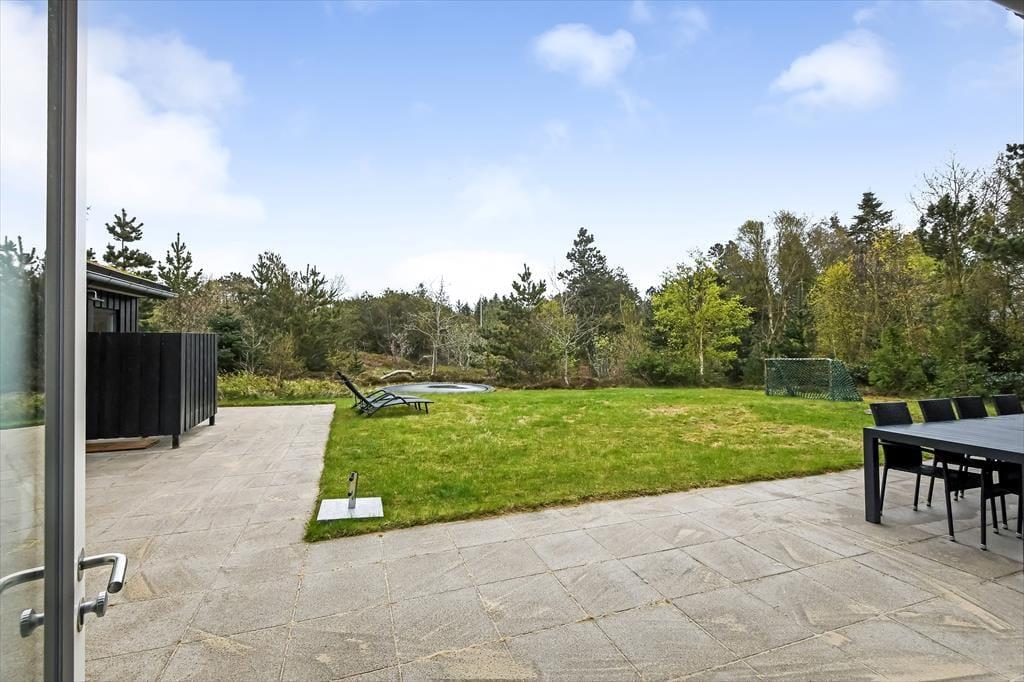 Udestuens vinduer kan skydes helt til siden, så om sommeren fungerer arealet som en overdækket terrasse – helt perfekt til morgenmaden med familien eller en rolig eftermiddag med en spændende bog. På naturgrunden er der også andre dejlige steder at sidde, og på den anden side af huset er der både fliseterrasse og græsplæne med fodboldmål såvel som en trampolin til børnene. I et ugeneret hjørne finder du tilmed et skønt vildmarksbad, og der er også en udendørs bruser, hvor du kan tage morgenbad til lyden af fuglesang fra trætoppene. Vil du ud for at udforske de naturskønne omgivelser med din hjertenskær, kan I frit låne husets to cykler og begive jer ud på den flotte rute langs med Ringkøbing Fjord.