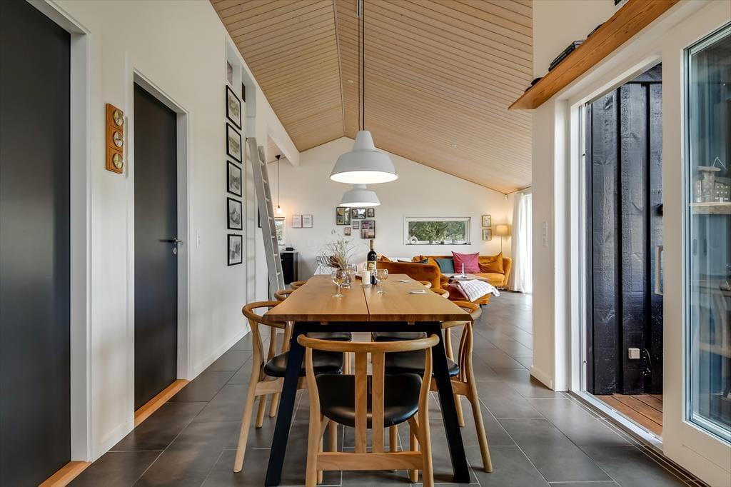 En træplade på den sorte facade fortæller dig, at huset hedder Vennelyst, og måske er det netop vennerne, du skal invitere med til Hemmet – især hvis de også holder af at nyde livet i smukke og komfortable omgivelser. Der er virkelig gjort noget ud af indretningen i det 102 m2 store hus, og ikke mindst i det højloftede opholdsrum, hvor køkken og stue ligger i åben forbindelse. Sofaerne er perfekt placerede, så du kan kigge lige ud på det betagende fjordlandskab, mens du bladrer i et magasin eller bare lader tankerne flyve over en god kop kaffe. Spisebordet er et dejligt sted at samles til et lækkert måltid mad, men I kan også overveje, om I hellere vil sidde i udestuen, hvor panoramavinduerne inviterer sollyset og fjordudsigten ind.