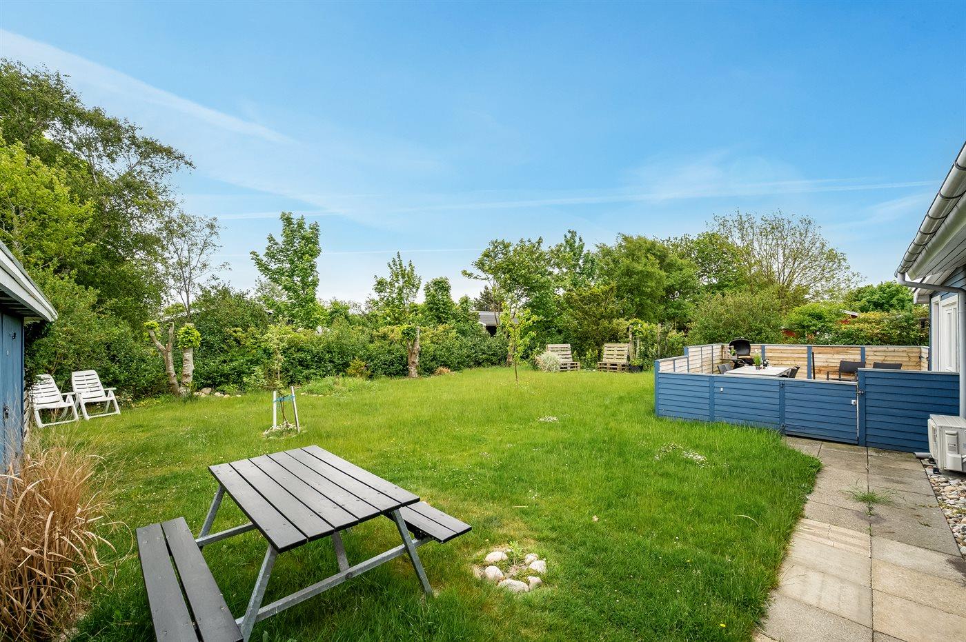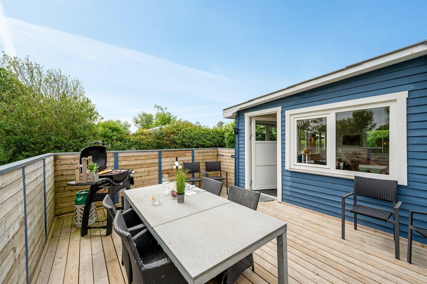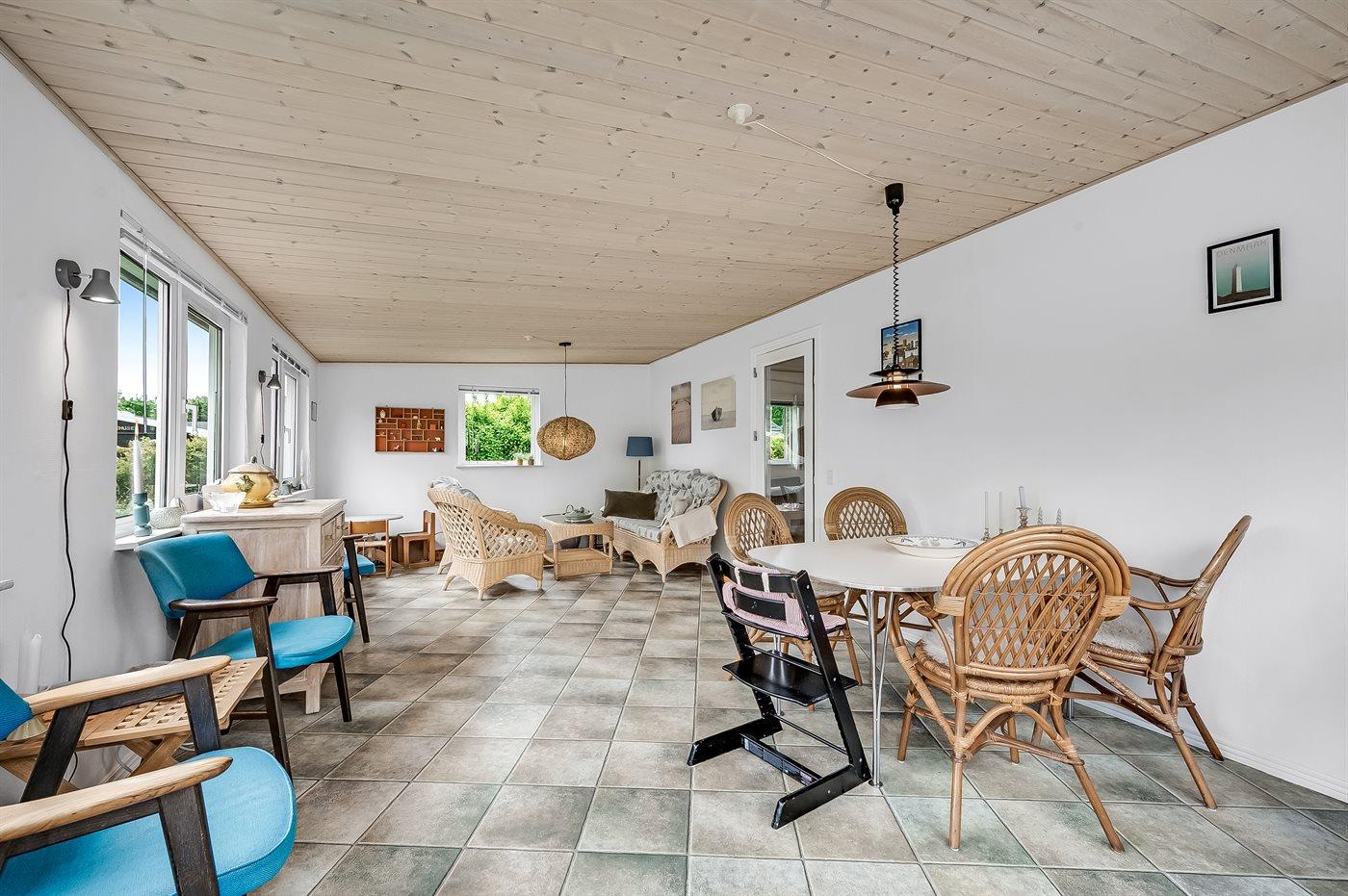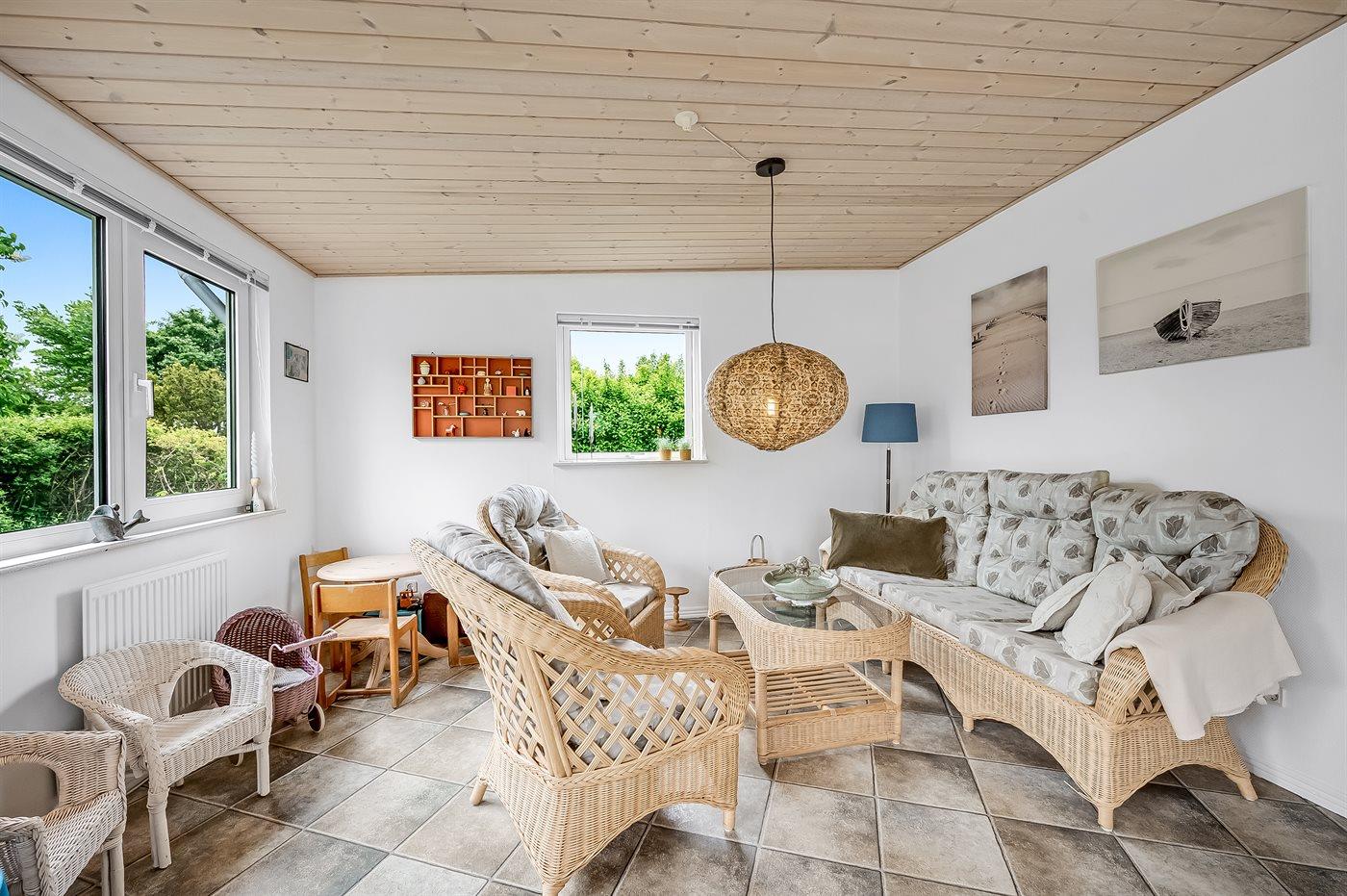 Sommerhusets hjerte er det store køkken-alrum, og herfra er der direkte adgang til den hyggelige udestue, hvor du kan tilbringe mange timer både sommer og vinter. Fra udestuen kan du åbne op til den ugenerede og lukkede træterrasse, hvorfra der er adgang til den indhegnede grund, hvor der er masser af muligheder for aktiviteter og samvær. Den indhegnede grund er også ideel hvis du medbringer en hund eller små børn på ferien.