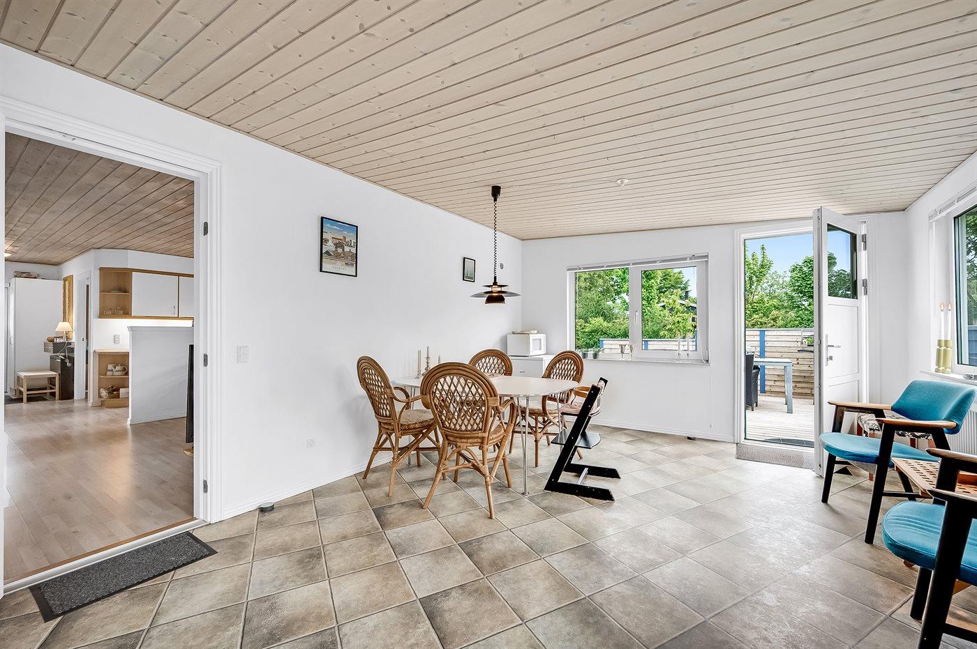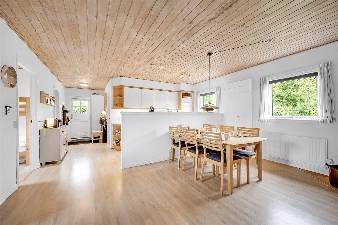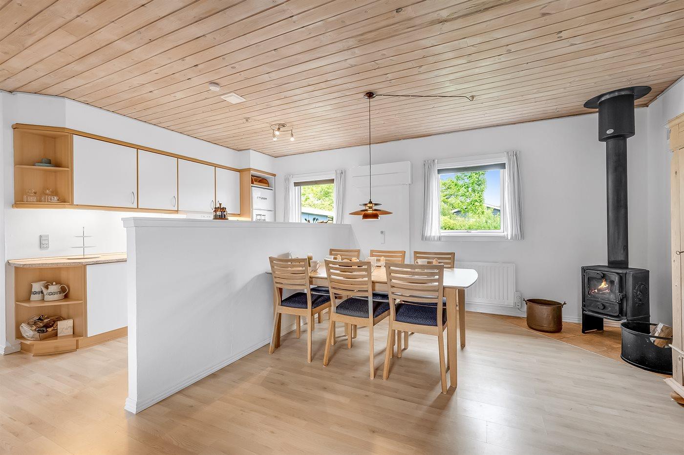Sommerhusets hjerte er det store køkken-alrum, og herfra er der direkte adgang til den hyggelige udestue, hvor du kan tilbringe mange timer både sommer og vinter. Fra udestuen kan du åbne op til den ugenerede og lukkede træterrasse, hvorfra der er adgang til den indhegnede grund, hvor der er masser af muligheder for aktiviteter og samvær. Den indhegnede grund er også ideel hvis du medbringer en hund eller små børn på ferien.