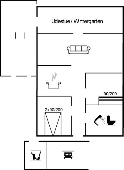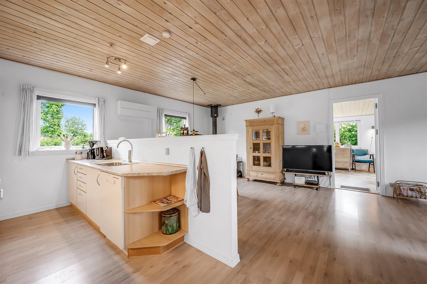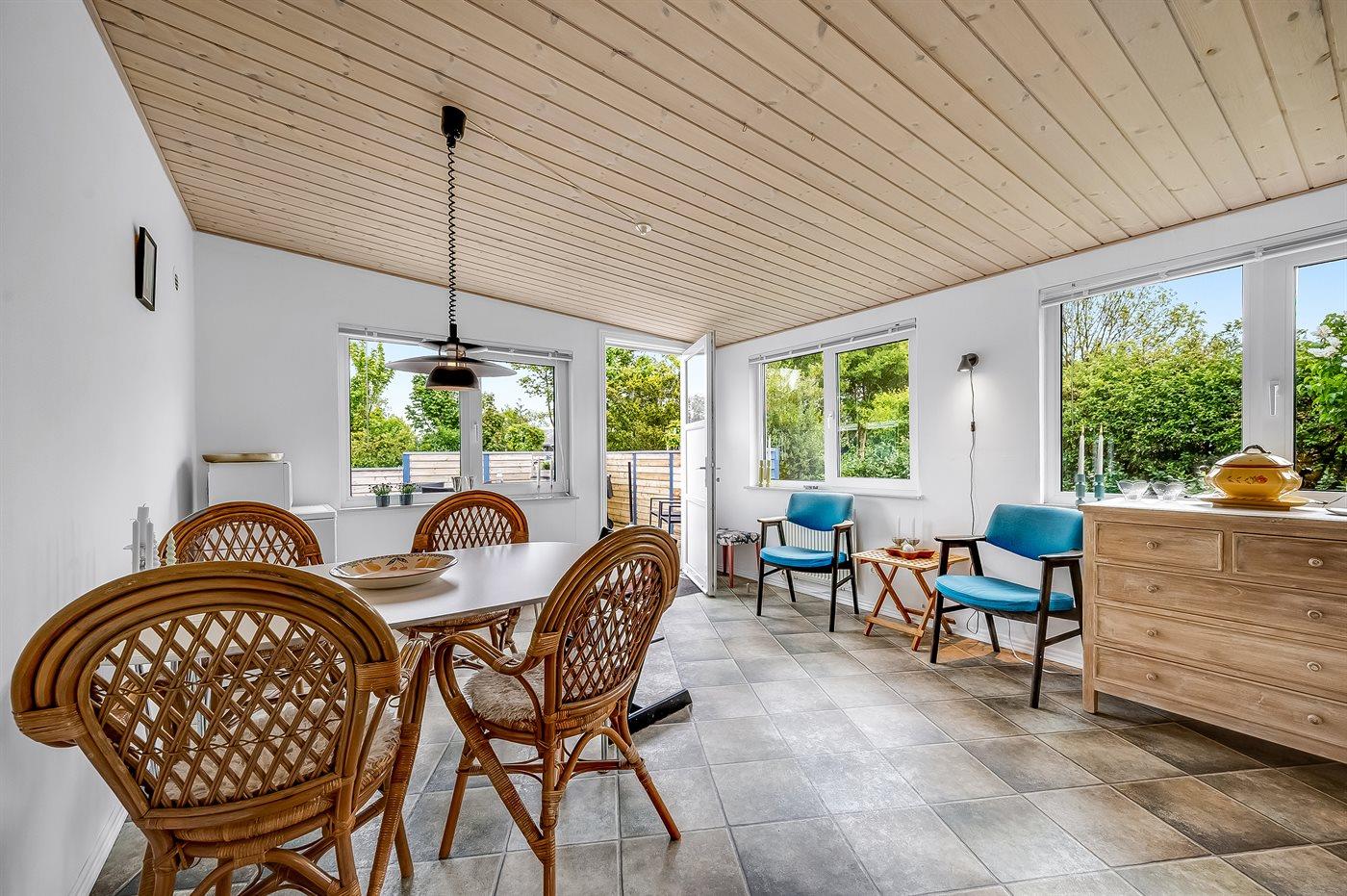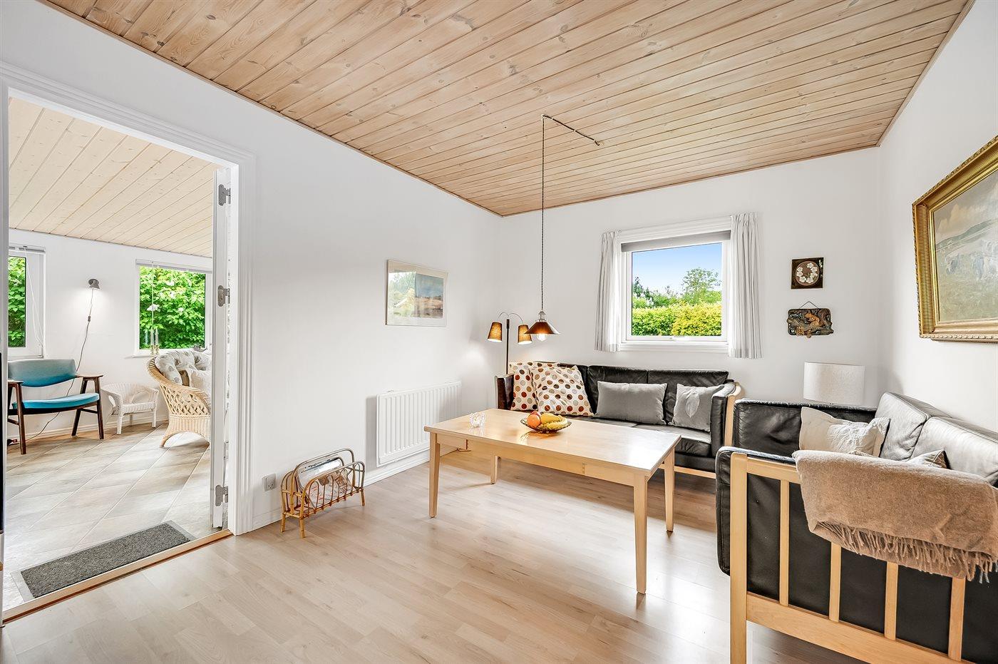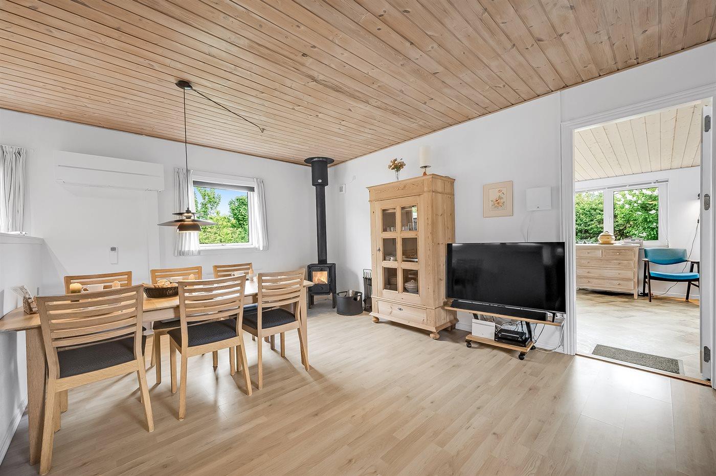 Sommerhusets hjerte er det store køkken-alrum, og herfra er der direkte adgang til den hyggelige udestue, hvor du kan tilbringe mange timer både sommer og vinter. Fra udestuen kan du åbne op til den ugenerede og lukkede træterrasse, hvorfra der er adgang til den indhegnede grund, hvor der er masser af muligheder for aktiviteter og samvær. Den indhegnede grund er også ideel hvis du medbringer en hund eller små børn på ferien.