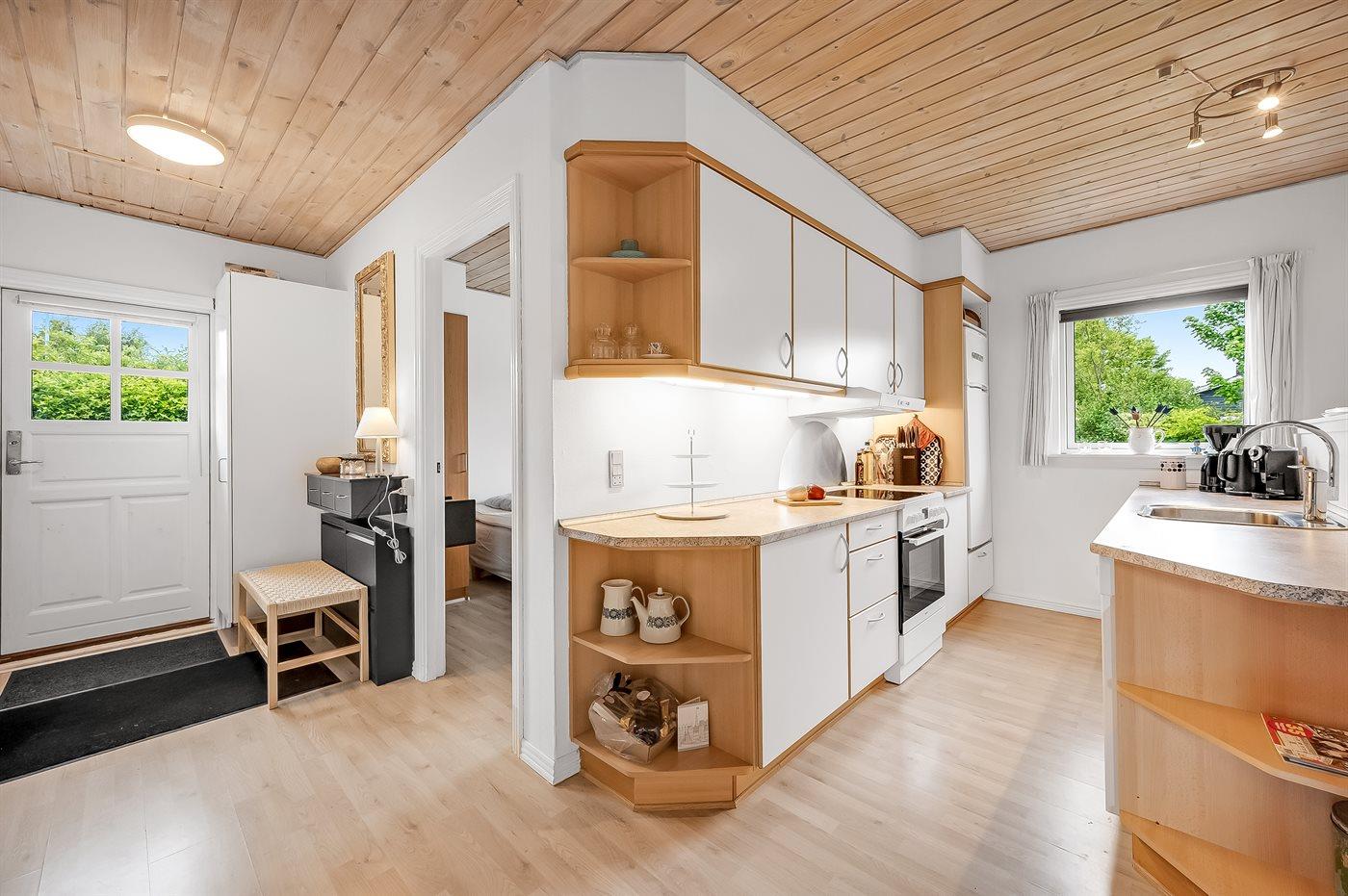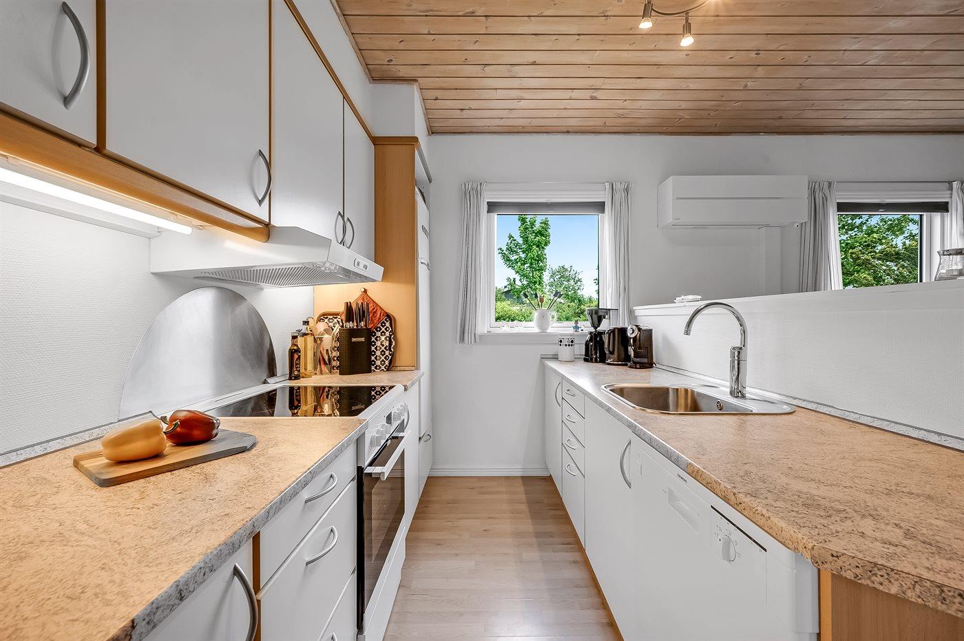 Køkkenet er udstyret med 1 køleskab. Der er 4 keramiske kogeplader, varmluftovn, mikrobølgeovn samt opvaskemaskine.
