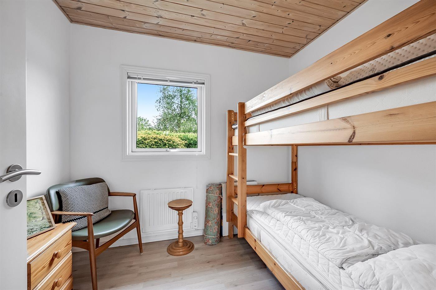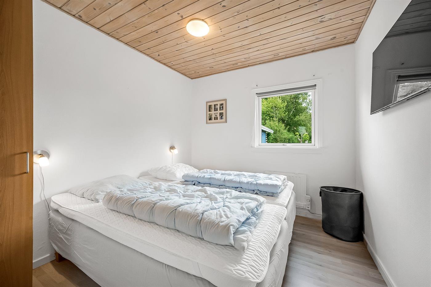 Der er i alt 2 soveværelser. Sovepladserne fordeler sig på: 2 sovepladser i dobbeltseng. 2 sovepladser i køjeseng. Derudover er der 1 stk. barneseng.