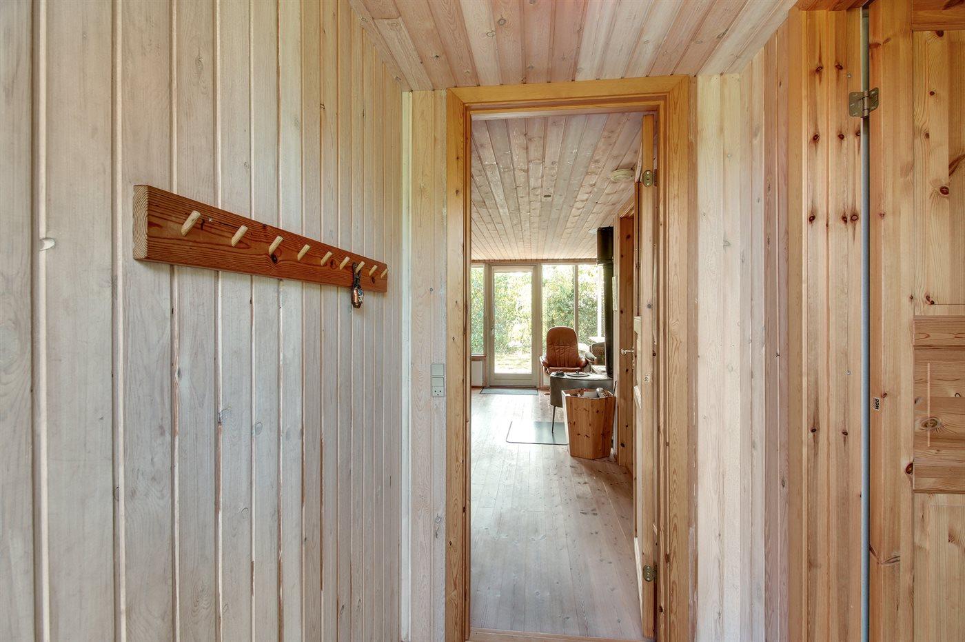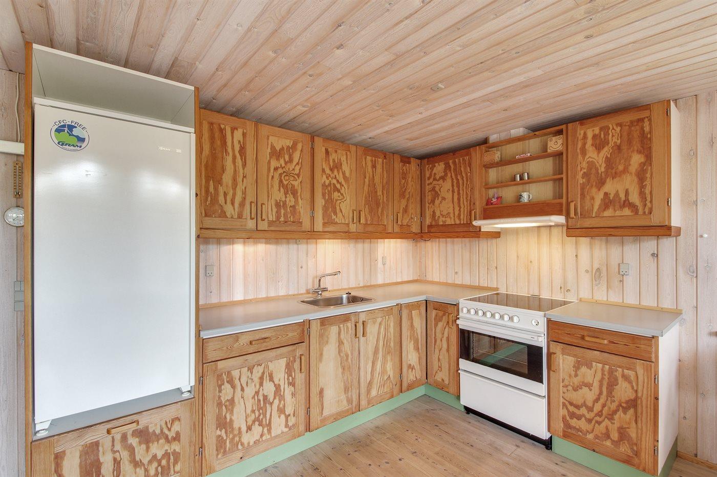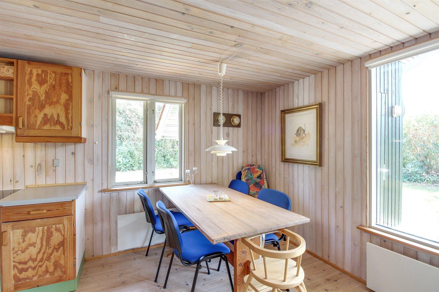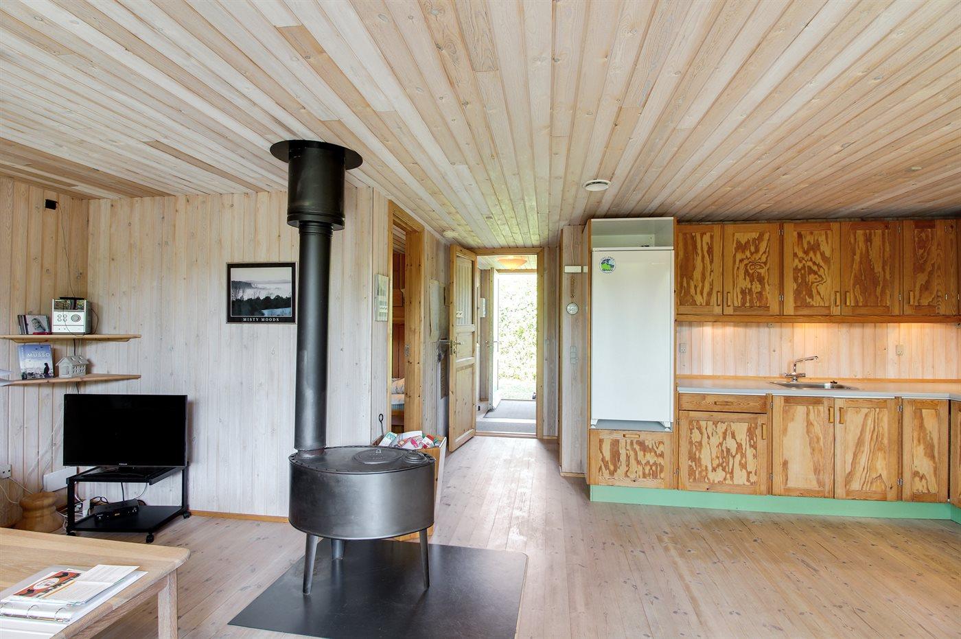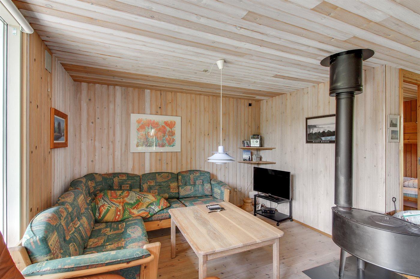 Lille familiesommerhus i træ, bygget i 1995, beliggende på en naturgrund - 650 m fra Ringkøbing Fjord. Til huset hører åben terrasse med havemøbler. Indvendig er gulvene belagt med træ. Badeværelse med bruser. Køkkenet er kombineret med opholdsstuen, som indeholder brændeovn, CD-afspiller og TV med parabol (digital). Husets sovepladser fordeler sig på 2 værelser, 1 med dobbeltseng og 1 med køjeseng. Til de mindste gæster findes barneseng og høj barnestol. Et sommerhus beliggende i et område, hvor der er gode muligheder for naturoplevelser.