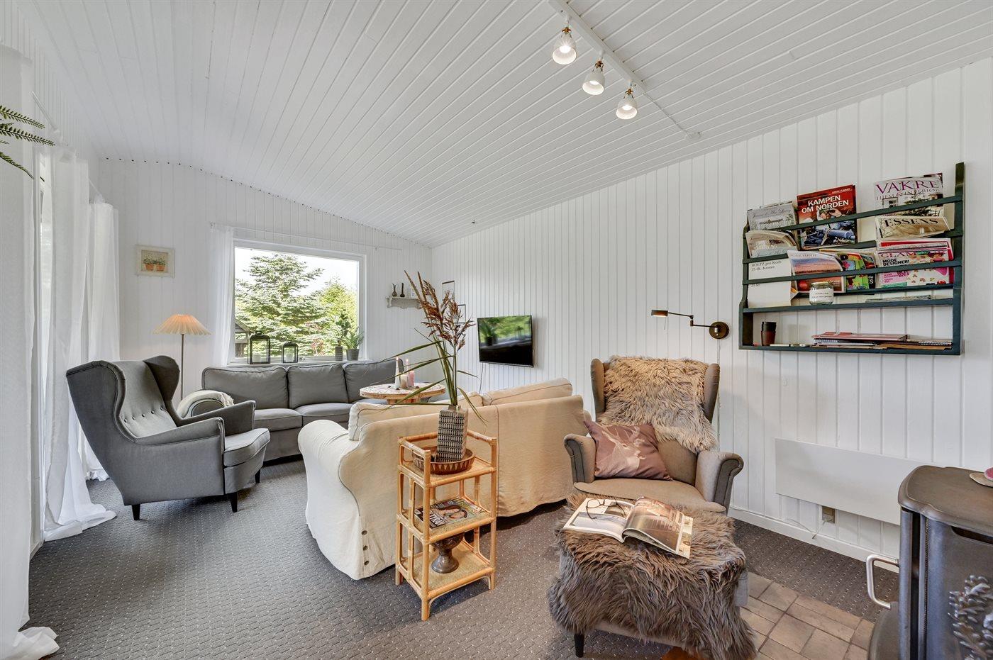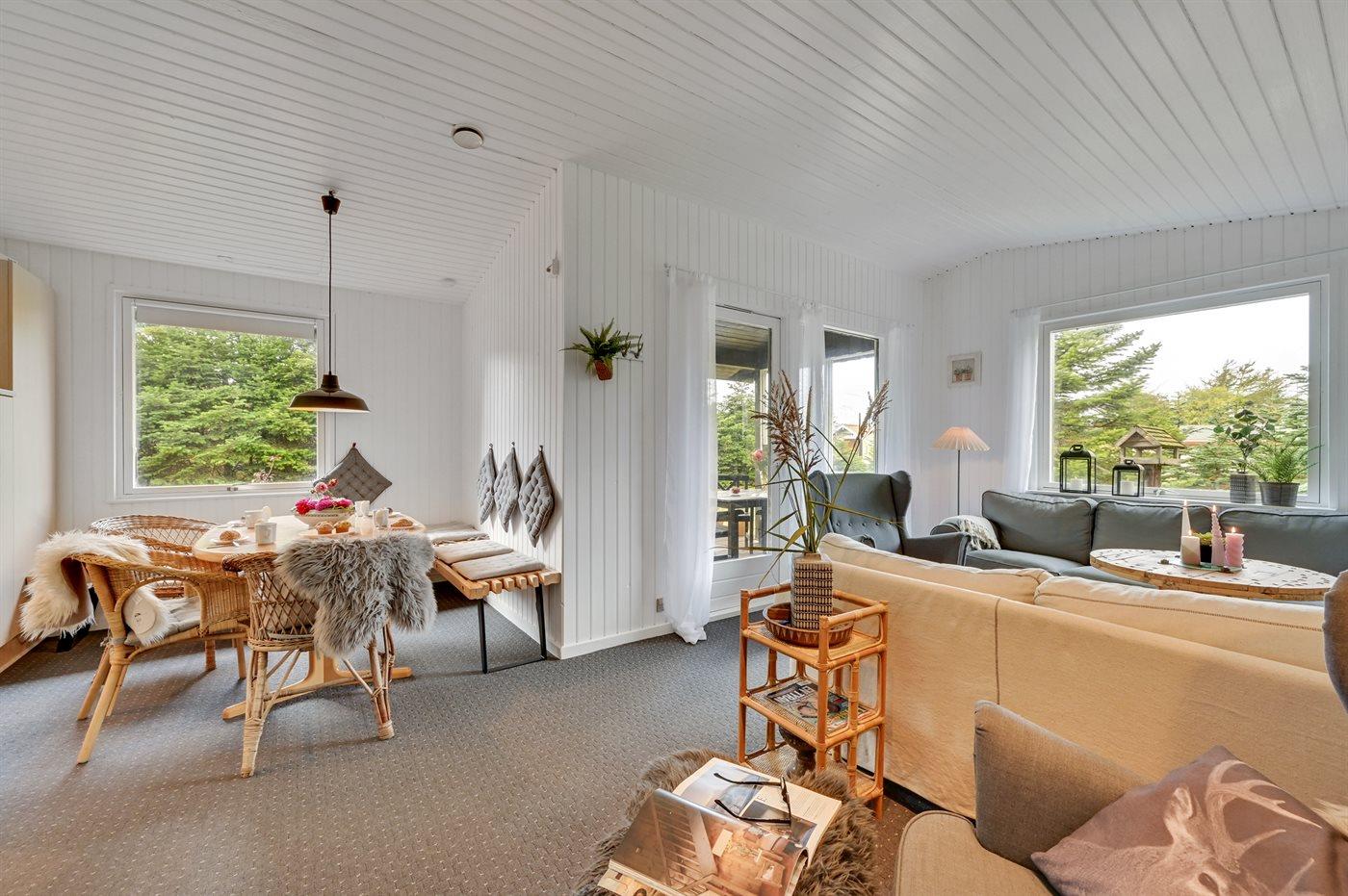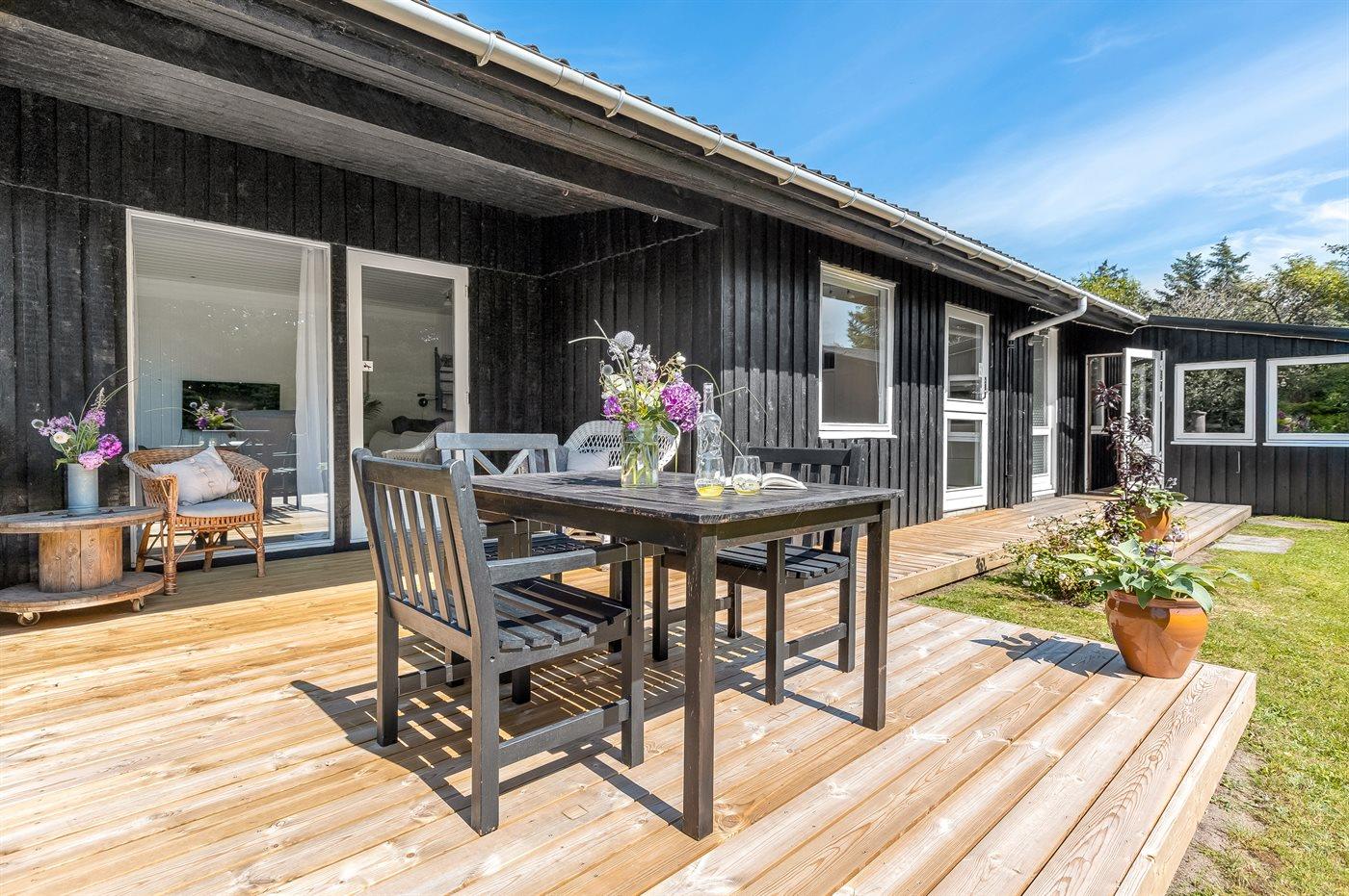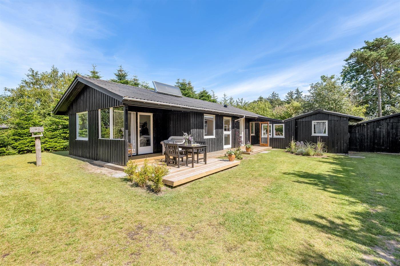 Lyst og hyggeligt indrettet sommerhus i det naturskønne Hemmet Strand. Sommerhuset har en dejlig terrasse med hyggekroge, hvor man altid kan finde læ. Baghaven er indhegnet, så hunden let kan lukkes ud.