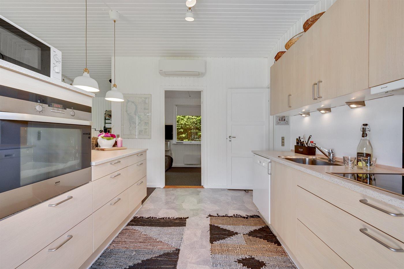 Køkkenet er udstyret med 1 køleskab. Der er 4 keramiske kogeplader, varmluftovn, mikrobølgeovn samt opvaskemaskine.