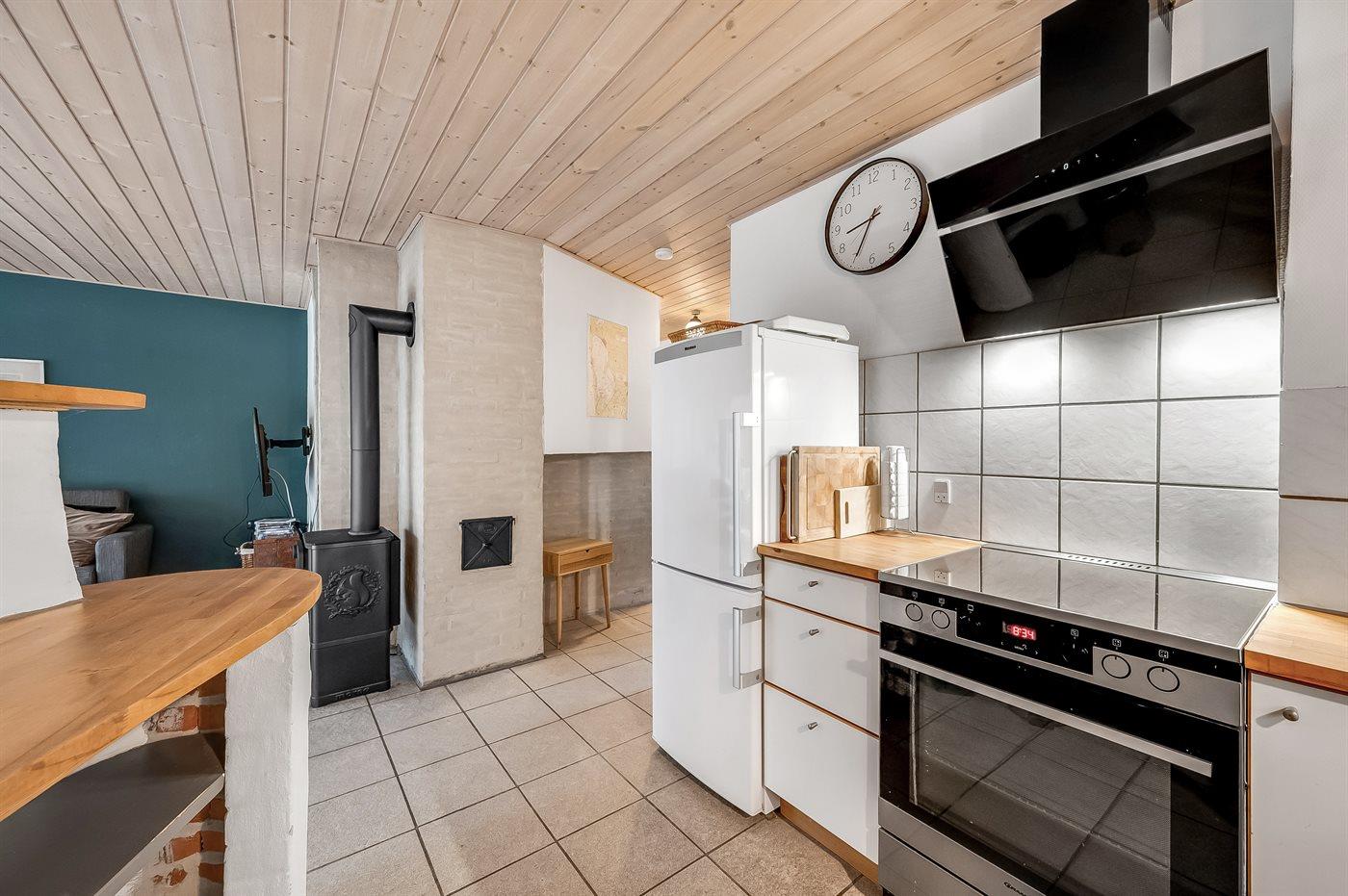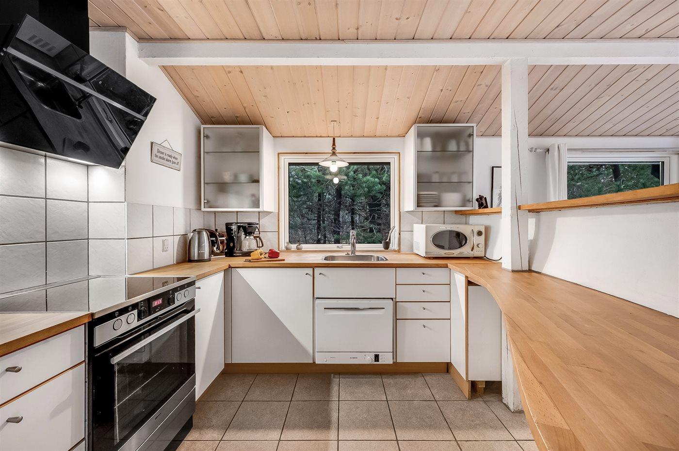 Køkkenet er udstyret med 1 køleskab. Der er 4 keramiske kogeplader, varmluftovn, mikrobølgeovn samt opvaskemaskine.