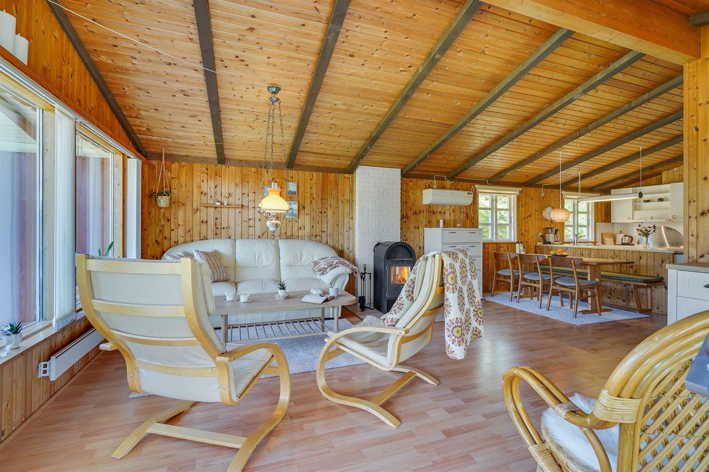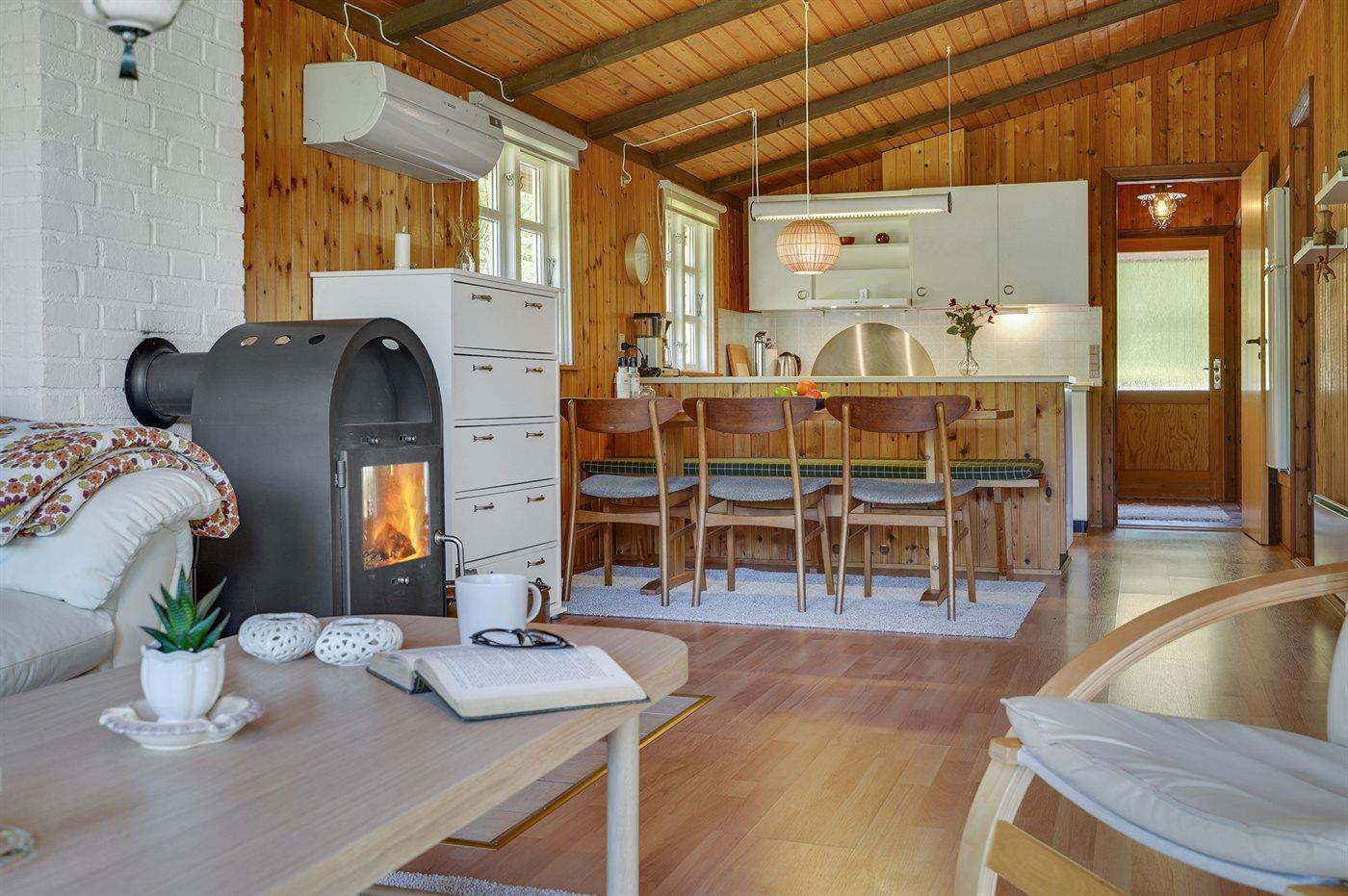 Hyggeligt sommerhus med udestue, sauna og brændeovn nær fjord og skov i rolige omgivelser.