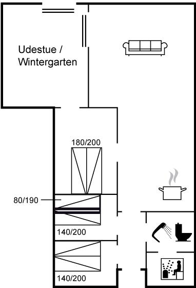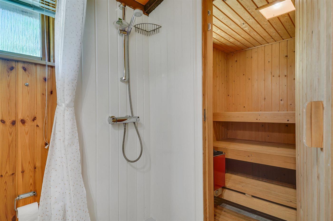 Der er 1 badeværelse med bruseniche og 1 toilet. I saunaen er der mulighed for afslapning.