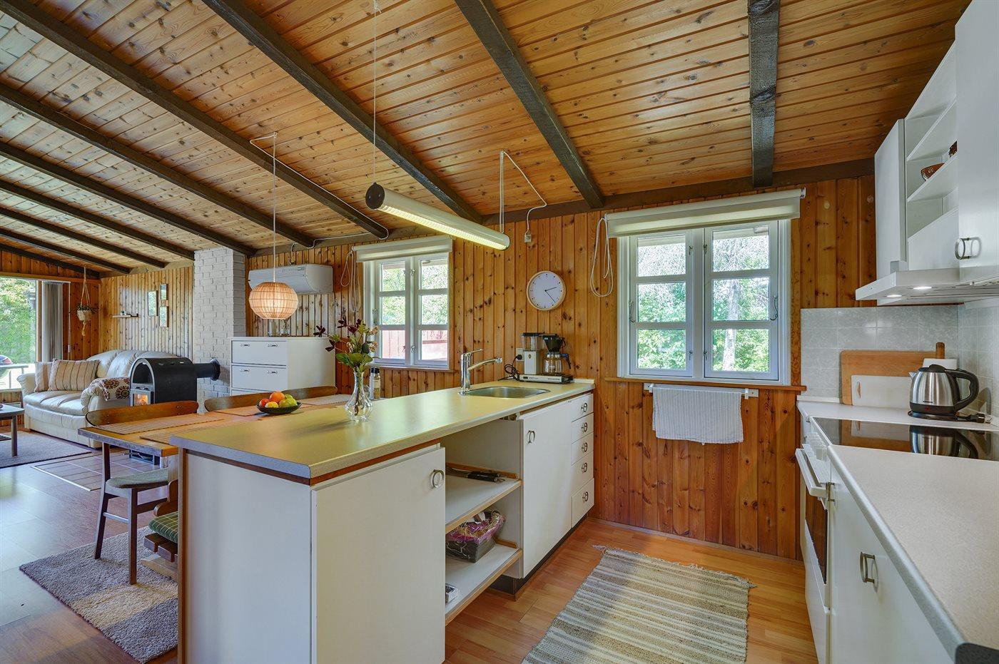 Køkkenet er udstyret med 1 køleskab. Der er 4 keramiske kogeplader, varmluftovn.