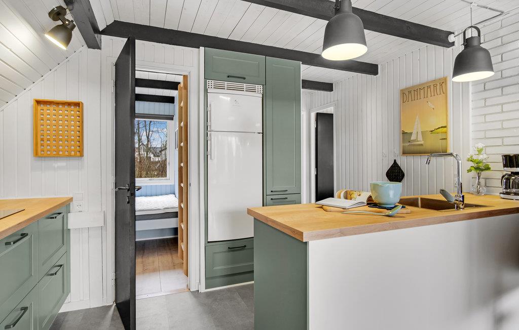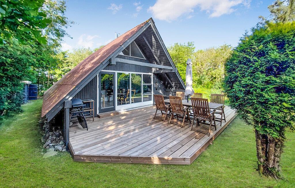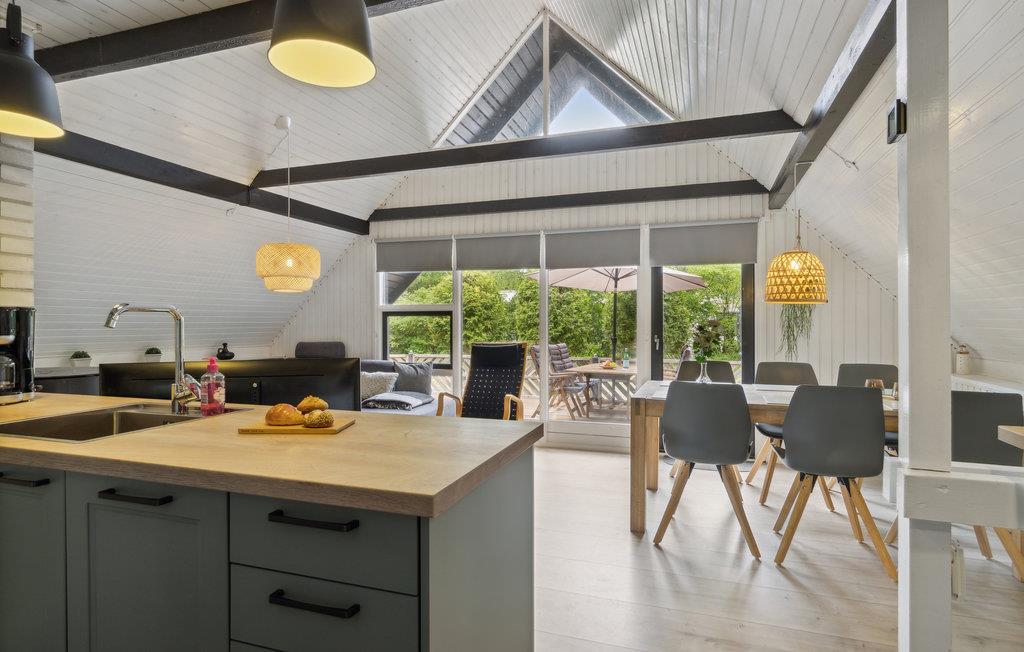 Der er kun en lille gåtur til stranden fra dette hyggelige feriehus, som har en helt særlig atmosfære. Her venter der en lang række charmerende detaljer og enkle, moderne stilvalg. Trævæggene og de markante bjælker tilfører huset en smagfuld elegance. Nyd dagens måltider ved det lange spisebord, hvor I samtidig kan glæde jer over udsigten til haven. Når I vender hjem efter en lang dag med udflugter og strandliv, kan I læne jer tilbage i stuen og fylde tiden med brætspil, bøger og gode snakke. I kan skrue ekstra op for hyggen og varmen i vinterhalvåret ved at fyre op i brændeovnen.