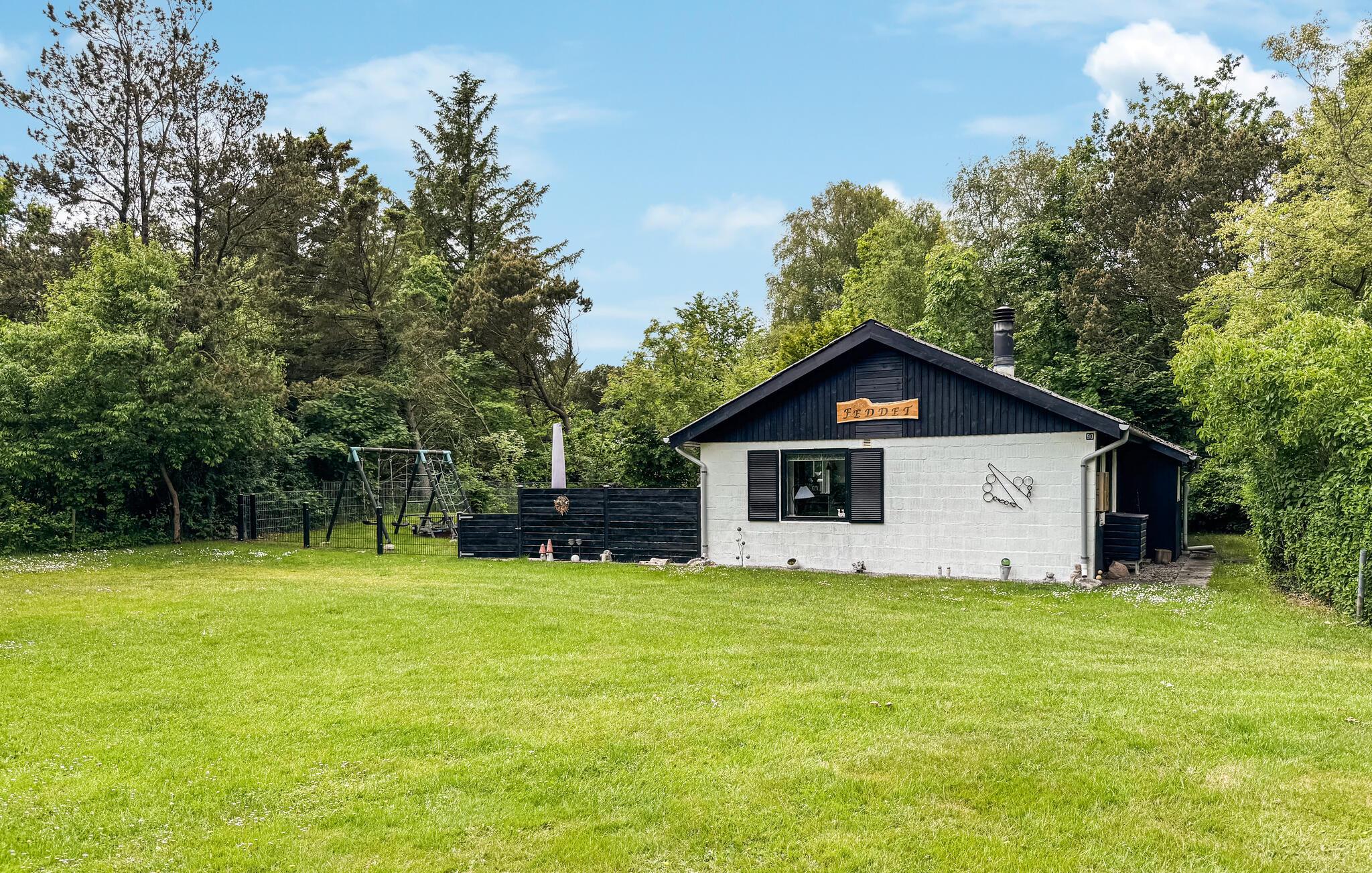 Hyggeligt sommerhus nær Hemmet Strand med have, brændeovn og familievenlige faciliteter til en afslappende ferie.